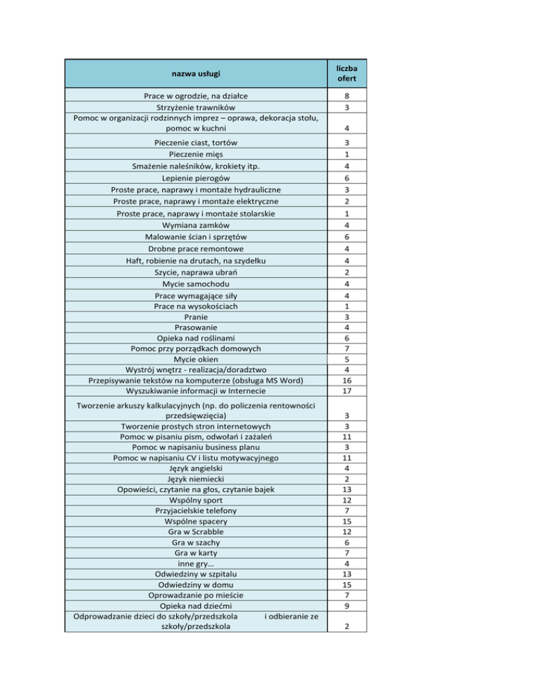 nazwa usługi liczba ofert Prace w ogrodzie, na działce Strzyżenie trawników Pomoc w organizacji rodzinnych imprez – oprawa, dekoracja stołu, pomoc w kuchni 8 3 Pieczenie ciast, tortów Pieczenie mięs Smażenie naleśników, krokiety itp. Lepienie pierogów Proste prace, naprawy i montaże hydrauliczne Proste prace, naprawy i montaże elektryczne 3 1 4 6 3 2 Proste prace, naprawy i montaże stolarskie Wymiana zamków Malowanie ścian i sprzętów Drobne prace remontowe Haft, robienie na drutach, na szydełku Szycie, naprawa ubrań Mycie samochodu Prace wymagające siły Prace na wysokościach Pranie Prasowanie Opieka nad roślinami Pomoc przy porządkach domowych Mycie okien Wystrój wnętrz - realizacja/doradztwo Przepisywanie tekstów na komputerze (obsługa MS Word) Wyszukiwanie informacji w Internecie 1 4 6 4 4 2 4 4 1 3 4 6 7 5 4 16 17 Tworzenie arkuszy kalkulacyjnych (np. do policzenia rentowności przedsięwzięcia) Tworzenie prostych stron internetowych Pomoc w pisaniu pism, odwołań i zażaleń Pomoc w napisaniu business planu Pomoc w napisaniu CV i listu motywacyjnego Język angielski Język niemiecki Opowieści, czytanie na głos, czytanie bajek Wspólny sport Przyjacielskie telefony Wspólne spacery Gra w Scrabble Gra w szachy Gra w karty inne gry… Odwiedziny w szpitalu Odwiedziny w domu Oprowadzanie po mieście Opieka nad dziećmi Odprowadzanie dzieci do szkoły/przedszkola i odbieranie ze szkoły/przedszkola 4 3 3 11 3 11 4 2 13 12 7 15 12 6 7 4 13 15 7 9 2 Opieka po szkole/przedszkolu Opieka nad osobami starszymi Opieka nad zwierzętami Przywożenie z imprez Spacery z psem Podwożenie samochodem Robienie zakupów Dostarczanie przesyłek Nauka języka angielskiego Nauka języka niemieckiego Nauka języka hiszpańskiego Nauka innego języka Nauka obsługi komputera Nauka posługiwania się Internetem Nauka tworzenia stron Internetowych Zajęcia twórcze i rozwijające dla dzieci, młodzieży Pomoc w odrabianiu lekcji Pomoc w rozwiązywaniu problemów dzieci Porady dotyczące prowadzenia działalności gospodarczej Porady prawne Pomoc w zorganizowaniu wyprawy za granice Konsultacje w zakresie poprawnej polszczyzny Nauka gry na gitarze Nauka gry na fortepianie Nauka pływania Korepetycje j. angielski Korepetycje chemia Korepetycje matematyka Korepetycje inne… Zabiegi Reiki Masaż Wykonywanie fotografii Wykonywanie stroików Świątecznych Usługi kosmetyczne Szkolenie psa Nauka wegetariańskiego gotowania Zajęcia z decoupage warsztaty z autoprezentacji przygotowanie do rozmowy kwalifikacyjnej praca nad motywacją - dla osób długotrwale bezrobotnych nauka gry na harmonijce ustnej zrobienie ciekawego dania zrobienie biżuterii nauczenie robienia przytulanek i innych ciekawych rzeczy na szydełku nauka parzenia herbaty renowacja i nauka renowcji starych mebli szaradziarstwo nauka języka włoskiego korepetycje z języka włoskiego nauka podstaw wokalu nauka podstaw języka francuskiego filcowanie, frynolitki, beading - nauka lub tworzenie biżuterii tłumaczenia - łacina wspólna gra-gry planszowe nauka języka łacińskiego 7 7 7 6 6 8 9 4 6 1 2 1 11 12 1 5 7 1 3 1 4 1 2 2 2 5 1 3 6 1 3 1 5 1 1 1 1 1 1 1 1 1 2 1 1 1 1 1 1 1 1 1 1 2 1 korepetycje z łaciny makijaże na różne okazje pielęgnacja twarzy wizaż i stylizacja nauka ważenia piwa nauka robienia sushi pomoc w kompletowaniu bibliografii usługa kosmetyczna - Pedicure naprawa komputera Drobne prace remontowe - budowlane gra w brydża porady w sprawach alkoholizmu pieczenie chleba na zakwasie malowanie na tkaninach rehabilitacja refleksjologia gimnastyka korekcyjna rękodzieło rozmowy i słuchanie muzyki K. Szymanowskiego rozmowy o literaturze J. Iwaszkiewicza robienie gołąbków odwiedzanie rozmowy Towarzystwo podczas imprez Pomoc w zarządzaniu najmem (napisanie umowy najmy, pomoc w prezentacji mieszkania, napisaniu dobrego ogłoszenia, konsultacje, pomoc w obliczeniu/rozliczenu podatku od najmu) 2 1 1 1 1 1 1 1 2 1 1 1 1 1 1 1 1 1 1 1 1 1 1 1 sesje coachingowe 1 1