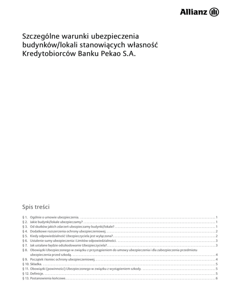 Szczególne warunki ubezpieczenia budynków/lokali stanowiących własność Kredytobiorców Banku Pekao S.A. Spis treści § 1. Ogólnie o umowie ubezpieczenia. . . . . . . . . . . . . . . . . . . . . . . . . . . . . . . . . . . . . . . . . . . . . . . . . . . . . . . . . . . . . . . . . . . . . . . . . . . . . . . . . . . . . . . . 1 § 2. Jakie budynki/lokale ubezpieczamy? . . . . . . . . . . . . . . . . . . . . . . . . . . . . . . . . . . . . . . . . . . . . . . . . . . . . . . . . . . . . . . . . . . . . . . . . . . . . . . . . . . . . . 1 § 3. Od skutków jakich zdarzeń ubezpieczamy budynki/lokale? . . . . . . . . . . . . . . . . . . . . . . . . . . . . . . . . . . . . . . . . . . . . . . . . . . . . . . . . . . . . . . . . 1 § 4. Dodatkowe rozszerzenia ochrony ubezpieczeniowej. . . . . . . . . . . . . . . . . . . . . . . . . . . . . . . . . . . . . . . . . . . . . . . . . . . . . . . . . . . . . . . . . . . . . . . 2 § 5. Kiedy odpowiedzialność Ubezpieczyciela jest wyłączona? . . . . . . . . . . . . . . . . . . . . . . . . . . . . . . . . . . . . . . . . . . . . . . . . . . . . . . . . . . . . . . . . . 2 § 6. Ustalenie sumy ubezpieczenia i Limitów odpowiedzialności. . . . . . . . . . . . . . . . . . . . . . . . . . . . . . . . . . . . . . . . . . . . . . . . . . . . . . . . . . . . . . . . 3 § 7. Jak ustalane będzie odszkodowanie Ubezpieczyciela? . . . . . . . . . . . . . . . . . . . . . . . . . . . . . . . . . . . . . . . . . . . . . . . . . . . . . . . . . . . . . . . . . . . . . 3 § 8.Obowiązki Ubezpieczonego w związku z przystąpieniem do umowy ubezpieczenia i dla zabezpieczenia przedmiotu ubezpieczenia przed szkodą. . . . . . . . . . . . . . . . . . . . . . . . . . . . . . . . . . . . . . . . . . . . . . . . . . . . . . . . . . . . . . . . . . . . . . . . . . . . . . . . . . . . . . . . . . . . . 4 § 9. Początek i koniec ochrony ubezpieczeniowej. . . . . . . . . . . . . . . . . . . . . . . . . . . . . . . . . . . . . . . . . . . . . . . . . . . . . . . . . . . . . . . . . . . . . . . . . . . . . . 4 § 10.Składka. . . . . . . . . . . . . . . . . . . . . . . . . . . . . . . . . . . . . . . . . . . . . . . . . . . . . . . . . . . . . . . . . . . . . . . . . . . . . . . . . . . . . . . . . . . . . . . . . . . . . . . . . . . . . . . . 5 § 11. Obowiązki (powinności) Ubezpieczonego w związku z wystąpieniem szkody. . . . . . . . . . . . . . . . . . . . . . . . . . . . . . . . . . . . . . . . . . . . . . . . 5 § 12.Definicje. . . . . . . . . . . . . . . . . . . . . . . . . . . . . . . . . . . . . . . . . . . . . . . . . . . . . . . . . . . . . . . . . . . . . . . . . . . . . . . . . . . . . . . . . . . . . . . . . . . . . . . . . . . . . . . 5 § 13.Postanowienia końcowe. . . . . . . . . . . . . . . . . . . . . . . . . . . . . . . . . . . . . . . . . . . . . . . . . . . . . . . . . . . . . . . . . . . . . . . . . . . . . . . . . . . . . . . . . . . . . . . . 6 § 1. Ogólnie o umowie ubezpieczenia. 1. Szczególne warunki ubezpieczenia budynków/lokali stanowiących własność Kredytobiorców Banku Pekao S.A. (zwane dalej szczególne warunki) zawierają postanowienia wchodzące w skład umowy ubezpieczenia. Określają, jakie ryzyko przyjmuje za określoną składkę ubezpieczeniową Towarzystwo Ubezpieczeń i Reasekuracji Allianz Polska Spółka Akcyjna (Ubezpieczyciel), jakie zobowiązuje się wobec Ubezpieczonego spełnić świadczenia i kiedy jego odpowiedzialność jest wyłączona. Ważne jest, aby strona przystępująca do umowy uważnie zapoznała się z tym tekstem. 2. Umowa ubezpieczenia obejmuje ubezpieczenie wskazanego mienia od zniszczenia, uszkodzenia lub utraty w wyniku zdarzeń, które dalej opisujemy. Ze względu na zakres ochrony ubezpieczeniowej zapisany w niniejszych szczególnych warunkach jest to ubezpieczenie dedykowane dla ubezpieczenia budynków/lokali należących do Kredytobiorców Banku Pekao S.A. 3. Ochrona ubezpieczeniowa obejmie te zdarzenia ubezpieczeniowe (z nimi związany jest obowiązek świadczenia Ubezpieczyciela), do których dojdzie na terenie Polski we wskazanym miejscu ubezpieczenia. 4. Szczególne warunki, które Państwo czytają zawierają wskazania: jakie mienie może zostać objęte ochroną na podstawie tych szczególnych warunków, od skutków jakich zdarzeń je ubezpieczamy, okoliczności kiedy odpowiedzialność Ubezpieczyciela jest wyłączona, sposobu ustalania odszkodowania, definicji pojęć używanych w umowie oraz dotyczące obowiązków Ubezpieczonego w zakresie zabezpieczenia przedmiotu ubezpieczenia. 5. Ubezpieczamy mienie należące do kategorii wskazanych w § 2, wskazane w Deklaracji zgody/certyfikacie kontynuacji ubezpieczenia. Ubezpieczamy mienie, które stanowi własność Ubezpieczonego jak też spółdzielcze własnościowe prawo do lokalu. Przy obejmowaniu ochroną ubezpieczeniową zadajemy szereg pytań o przedmiot ubezpieczenia. Prosimy o wyczerpującą i zgodną ze stanem wiedzy informację. § 2. Jakie budynki/lokale ubezpieczamy? 1. Na podstawie niniejszych szczególnych warunków, przedmiotami ubezpieczenia są: 1) budynki mieszkalne i lokale mieszkalne, 2) budynki gospodarcze i lokale gospodarcze, 3) elementy działki, 4) obiekty określone w pkt 1 – 3 w budowie zwane w dalszej części niniejszych szczególnych warunków budynkami/ lokalami 2. Przy ubezpieczeniu budynków mieszkalnych ochroną ubezpieczeniową mogą zostać objęte budynki/ lokale gospodarcze oraz elementy działki znajdujące się na tej samej działce, co ubezpieczony budynek mieszkalny i o ile zostały wskazane w Deklaracji zgody/certyfikacie kontynuacji ubezpieczenia. 3. Przy ubezpieczeniu lokali mieszkalnych ochroną ubezpieczeniową mogą zostać objęte: 1) lokale gospodarcze (w tym miejsca garażowe), ale tylko wtedy, gdy znajdują się w tym samym budynku wielomieszkaniowym co lokal mieszkalny; 2) garaże, ale tylko wtedy, gdy znajdują się w tej samej miejscowości, co ubezpieczony lokal mieszkalny i 