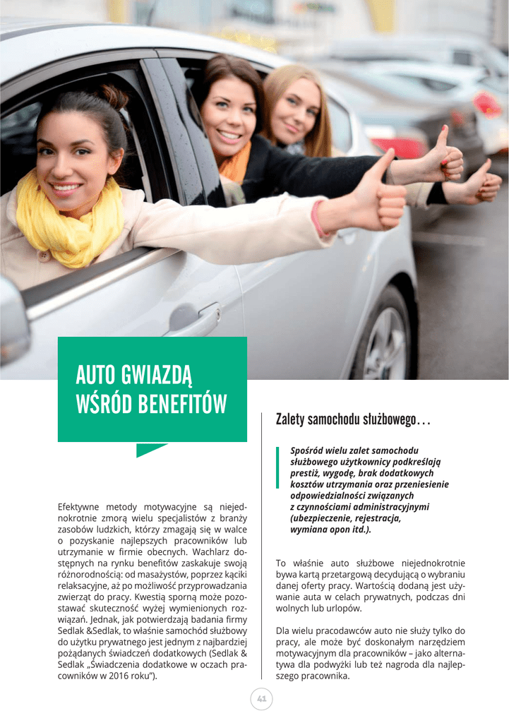 AUTO GWIAZDĄ WŚRÓD BENEFITÓW Zalety samochodu służbowego… Spośród wielu zalet samochodu służbowego użytkownicy podkreślają prestiż, wygodę, brak dodatkowych kosztów utrzymania oraz przeniesienie odpowiedzialności związanych z czynnościami administracyjnymi (ubezpieczenie, rejestracja, wymiana opon itd.). Efektywne metody motywacyjne są niejednokrotnie zmorą wielu specjalistów z branży zasobów ludzkich, którzy zmagają się w walce o pozyskanie najlepszych pracowników lub utrzymanie w firmie obecnych. Wachlarz dostępnych na rynku benefitów zaskakuje swoją różnorodnością: od masażystów, poprzez kąciki relaksacyjne, aż po możliwość przyprowadzania zwierząt do pracy. Kwestią sporną może pozostawać skuteczność wyżej wymienionych rozwiązań. Jednak, jak potwierdzają badania firmy Sedlak &Sedlak, to właśnie samochód służbowy do użytku prywatnego jest jednym z najbardziej pożądanych świadczeń dodatkowych (Sedlak & Sedlak „Świadczenia dodatkowe w oczach pracowników w 2016 roku”). To właśnie auto służbowe niejednokrotnie bywa kartą przetargową decydującą o wybraniu danej oferty pracy. Wartością dodaną jest używanie auta w celach prywatnych, podczas dni wolnych lub urlopów. Dla wielu pracodawców auto nie służy tylko do pracy, ale może być doskonałym narzędziem motywacyjnym dla pracowników – jako alternatywa dla podwyżki lub też nagroda dla najlepszego pracownika. 41 WYGODA I KOMFORT PRACOWNIKA „Salary sacrifice” – Zatankuj i ciesz się jazdą! Ciekawym rozwiązaniem, promowanym w krajach zachodnich jest oferowanie nowych samochodów za pośrednictwem programów, które pozwalają pracownikowi przeznaczyć część swojego wynagrodzenia brutto na korzyść niepieniężną w postaci nowego, wymarzonego auta. Powyższe rozwiązania pojawiły się również w Polsce. Taki sposób motywowania przynosi korzyści finansowe dla obu stron: dla pracownika to zmniejszone podatki i ZUS oraz korzystanie z wszystkich przywilejów auta służbowego (z wyjątkiem kosztów paliwa). Ponadto takie auto może być przeznaczone nie tylko dla pracownika, ale również dla jego rodziny, co może stanowić o jego największym atucie. Szacuje się, że korzystający z tych programów zatrudnieni mogą się spodziewać oszczędności w wysokości do 40% w stosunku do zakupionego prywatnego samochodu. Pracodawca natomiast może zaliczać koszty tego auta do kosztów firmy, ponadto wzmacnia lojalność pracowników wobec firmy, co pozytywnie wpłynie na jego wizerunek. Leasing pracowniczy Inną promowaną wśród pracowników formą motywacyjną przy użyciu auta jest tzw. leasing pracowniczy wybranego pojazdu. Osoba korzystająca z takiego programu, może wybrać między nowym lub używanym autem. Warunkami jakie musi spełniać ten rodzaj leasingu jest wiek auta po zakończeniu umowy, który nie może przekroczyć 5 lat, a wysokość miesięcznej raty nie może być wyższa niż 30% wartości wynagrodzenia. Pracownik jest również zobligowany do uiszczenia wpłaty własnej w wysokości 10% wartości pojazdu tytułem zabezpieczenia kontraktu. Należy podkreślić (i jest to ważny element oferty dla pracowników posiadających innego rodzaju zobowiązania finansowe), iż kwestia pozostałych miesięcznych obciążeń zatrudnionego nie ma znaczenia dla leasingodawcy, przy wyrażaniu zgody na ten rodzaj leasingu. 42 43 WYGODA I KOMFORT PRACOWNIKA Oferta cieszy się dużym zainteresowaniem, a jednym z czynników mających na to wpływ jest bardzo niski koszt finansowania pojazdu, który jest ponad dwukrotnie korzystniejszy niż najtańsza, dostępna obecnie dla konsumenta na polskim rynku oferta leasingu lub kredytu. Jeżeli chodzi o wybór samochodów to, jest tu pełna dowolność (oczywiście biorąc pod uwagę wspomniane warunki brzegowe), a pracownicy do tej pory wybierali m.in. Fiata 500, Volvo V40, Mazdę 6, czy Toyotę Auris. Dzięki specyfice działalności firmy Hitachi Capital Polska i produktom jakie oferujemy swoim Klientom, jako wartość dodaną, można zapisać także możliwość uzyskania przez pracowników atrakcyjnych rabatów (w przypadku zakupu nowych pojazdów), co oczywiście ma bezpośrednie przełożenie na wysokość miesięcznej raty. Wysokość wykupu samochodu po zakończonym kontrakcie jest zależna od preferencji pracownika i może to być zarówno 1 jak i 20% wartości początkowej – mówi Marcin Stolarek, Key Account Manager Hitachi Capital Polska. Hitachi Capital Polska funkcjonuje w oparciu o wysokie standardy etyczne takie jak uczciwość, spójność działania i profesjonalizm. Zapewnia swoim Klientom rozwiązania flotowe, dbając o bezpieczeństwo, mobilność i satysfakcję użytkowników firmowych flot. W celu zapewnienia sprawnej realizacji ich podstawowych zadań biznesowych skupiamy się na znalezieniu najlepszego rozwiązania. Najważniejsze jest dla nas zadowolenie Klienta, dlatego dostosowujemy się do jego sytuacji, stosowanych praktyk i preferencji, oferując takie rozwiązania jak np. wynajem długoterminowy (pojazdy osobowe i dostawcze), leasing finansowy i operacyjny, zarządzanie flotą Klienta (administracja), program ‘Zatankuj i ciesz się jazdą’, optymalizacja likwidacji szkód komunikacyjnych, karty paliwowe, wynajem krótkoterminowy. Wybierając auto służbowe ważnym elementem jest klarowne sformułowanie zasad polityki flotowej tak, aby strategia pracodawcy miała widoczny wpływ na motywację pracowników oraz stanowiła o ich równym traktowaniu. www.hitachicapital.pl Wachlarz wykorzystania aut służbowych dla celów motywacyjnych jest bardzo duży – zatem do dzieła! DOROTA BOROWIECKA HR BUSINESS PARTNER HITACHI CAPITAL POLSKA 44
