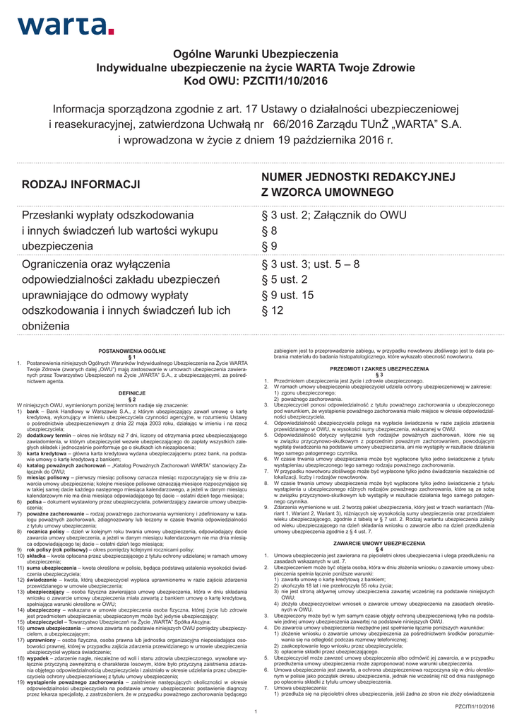 Ogólne Warunki Ubezpieczenia Indywidualne ubezpieczenie na życie WARTA Twoje Zdrowie Kod OWU: PZCITI1/10/2016 Informacja sporządzona zgodnie z art. 17 Ustawy o działalności ubezpieczeniowej i reasekuracyjnej, zatwierdzona Uchwałą nr 266/2016 Zarządu TUnŻ „WARTA” S.A. i wprowadzona w życie z dniem 19 października 2016 r. RODZAJ INFORMACJI NUMER JEDNOSTKI REDAKCYJNEJ Z WZORCA UMOWNEGO Przesłanki wypłaty odszkodowania i innych świadczeń lub wartości wykupu ubezpieczenia § 3 ust. 2; Załącznik do OWU §8 §9 Ograniczenia oraz wyłączenia odpowiedzialności zakładu ubezpieczeń uprawniające do odmowy wypłaty odszkodowania i innych świadczeń lub ich obniżenia § 3 ust. 3; ust. 5 – 8 § 5 ust. 2 § 9 ust. 15 § 12 zabiegiem jest to przeprowadzenie zabiegu, w przypadku nowotworu złośliwego jest to data pobrania materiału do badania histopatologicznego, które wykazało obecność nowotworu. POSTANOWIENIA OGÓLNE §1 1. Postanowienia niniejszych Ogólnych Warunków Indywidualnego Ubezpieczenia na Życie WARTA Twoje Zdrowie (zwanych dalej „OWU”) mają zastosowanie w umowach ubezpieczenia zawieranych przez Towarzystwo Ubezpieczeń na Życie „WARTA” S.A., z ubezpieczającymi, za pośrednictwem agenta. 1. 2. DEFINICJE §2 W niniejszych OWU, wymienionym poniżej terminom nadaje się znaczenie: 1) bank – Bank Handlowy w Warszawie S.A., z którym ubezpieczający zawarł umowę o kartę kredytową, wykonujący w imieniu ubezpieczyciela czynności agencyjne, w rozumieniu Ustawy o pośrednictwie ubezpieczeniowym z dnia 22 maja 2003 roku, działając w imieniu i na rzecz ubezpieczyciela; 2) dodatkowy termin – okres nie krótszy niż 7 dni, liczony od otrzymania przez ubezpieczającego zawiadomienia, w którym ubezpieczyciel wezwie ubezpieczającego do zapłaty wszystkich zaległych składek i jednocześnie poinformuje go o skutkach ich niezapłacenia; 3) karta kredytowa – główna karta kredytowa wydana ubezpieczającemu przez bank, na podstawie umowy o kartę kredytową z bankiem; 4) katalog poważnych zachorowań – „Katalog Poważnych Zachorowań WARTA” stanowiący Załącznik do OWU; 5) miesiąc polisowy – pierwszy miesiąc polisowy oznacza miesiąc rozpoczynający się w dniu zawarcia umowy ubezpieczenia; kolejne miesiące polisowe oznaczają miesiące rozpoczynające się w takiej samej dacie każdego następnego miesiąca kalendarzowego, a jeżeli w danym miesiącu kalendarzowym nie ma dnia miesiąca odpowiadającego tej dacie – ostatni dzień tego miesiąca; 6) polisa – dokument wystawiony przez ubezpieczyciela, potwierdzający zawarcie umowy ubezpieczenia; 7) poważne zachorowanie – rodzaj poważnego zachorowania wymieniony i zdefiniowany w katalogu poważnych zachorowań, zdiagnozowany lub leczony w czasie trwania odpowiedzialności z tytułu umowy ubezpieczenia; 8) rocznica polisy – dzień w kolejnym roku trwania umowy ubezpieczenia, odpowiadający dacie zawarcia umowy ubezpieczenia, a jeżeli w danym miesiącu kalendarzowym nie ma dnia miesiąca odpowiadającego tej dacie – ostatni dzień tego miesiąca; 9) rok polisy (rok polisowy) – okres pomiędzy kolejnymi rocznicami polisy; 10) składka – kwota opłacana przez ubezpieczającego z tytułu ochrony udzielanej w ramach umowy ubezpieczenia; 11) suma ubezpieczenia – kwota określona w polisie, będąca podstawą ustalenia wysokości świadczenia ubezpieczyciela; 12) świadczenie – kwota, którą ubezpieczyciel wypłaca uprawnionemu w razie zajścia zdarzenia przewidzianego w umowie ubezpieczenia; 13) ubezpieczający – osoba fizyczna zawierająca umowę ubezpieczenia, która w dniu składania wniosku o zawarcie umowy ubezpieczenia miała zawartą z bankiem umowę o kartę kredytową, spełniająca warunki określone w OWU; 14) ubezpieczony – wskazana w umowie ubezpieczenia osoba fizyczna, której życie lub zdrowie jest przedmiotem ubezpieczenia; ubezpieczonym może być jedynie ubezpieczający; 15) ubezpieczyciel – Towarzystwo Ubezpieczeń na Życie „WARTA” Spółka Akcyjna; 16) umowa ubezpieczenia – umowa zawarta na podstawie niniejszych OWU pomiędzy ubezpieczycielem, a ubezpieczającym; 17) uprawniony – osoba fizyczna, osoba prawna lub jednostka organizacyjna nieposiadająca osobowości prawnej, której w przypadku zajścia zdarzenia przewidzianego w umowie ubezpieczenia ubezpieczyciel wypłaca świadczenie; 18) wypadek – zdarzenie nagłe, niezależne od woli i stanu zdrowia ubezpieczonego, wywołane wyłącznie przyczyną zewnętrzną o charakterze losowym, które było przyczyną zaistnienia zdarzenia objętego odpowiedzialnością ubezpieczyciela i zaistniało w okresie udzielania przez ubezpieczyciela ochrony ubezpieczeniowej z tytułu umowy ubezpieczenia; 19) wystąpienie poważnego zachorowania – zaistnienie następujących okoliczności w okresie odpowiedzialności ubezpieczyciela na podstawie umowy ubezpieczenia: postawienie diagnozy przez lekarza specjalistę, z zastrzeżeniem, że w przypadku poważnego zachorowania będącego 3. 4. 5. 6. 7. 8. 9. 1. 2. 3. 4. 5. 6. 7. 1 PRZEDMIOT I ZAKRES UBEZPIECZENIA §3 Przedmiotem ubezpieczenia jest życie i zdrowie ubezpieczonego. W ramach umowy ubezpieczenia ubezpieczyciel udziela ochrony ubezpieczeniowej w zakresie: 1) zgonu ubezpieczonego; 2) poważnego zachorowania. Ubezpieczyciel ponosi odpowiedzialność z tytułu poważnego zachorowania u ubezpieczonego pod warunkiem, że wystąpienie poważnego zachorowania miało miejsce w okresie odpowiedzialności ubezpieczyciela. Odpowiedzialność ubezpieczyciela polega na wypłacie świadczenia w razie zajścia zdarzenia przewidzianego w OWU, w wysokości sumy ubezpieczenia, wskazanej w OWU. Odpowiedzialność dotyczy wyłącznie tych rodzajów poważnych zachorowań, które nie są w związku przyczynowo-skutkowym z poprzednim poważnym zachorowaniem, powodującym wypłatę świadczenia na podstawie umowy ubezpieczenia, ani nie wystąpiły w rezultacie dzia