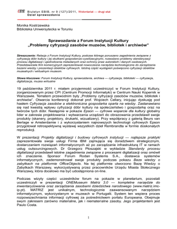 Bi ul et yn EBI B, nr 9 (127)/ 2011, Wolontariat — drugi etat Dzi ał sp raw o zd an i a Monika Kostrzewska Biblioteka Uniwersytecka w Toruniu Sprawozdanie z Forum Instytucji Kultury „Problemy cyfryzacji zasobów muzeów, bibliotek i archiwów” Streszczenie: Relacja z Forum Instytucji Kultury, podczas którego poruszano zagadnienia związane z cyfryzacją dóbr kultury i jej skutkami gospodarczo-cywilizacyjnymi, rozważano problemy standaryzacji procesu digitalizacji i ujednolicenia metadanych oraz ochrony praw autorskich i danych osobowych. Przedstawiciele firm komercyjnych zaprezentowali nowoczesne narzędzia technologiczne do zarządzania bazami wiedzy i prezentacji obiektów cyfrowych. Istotną część wystąpień poświęcono cyfryzacji obiektów muzealnych i wirtualnym muzeom. Słowa kluczowe: Forum Instytucji Kultury, sprawozdania, archiwa — cyfryzacja, biblioteki — cyfryzacja, digitalizacja, muzea wirtualne 19 października 2011 r. miałam przyjemność uczestniczyć w Forum Instytucji Kultury, zorganizowanym przez CPI (Centrum Promocji Informatyki) w Centrum Nauki Kopernik w Warszawie. Tematem przewodnim były „Problemy cyfryzacji zasobów muzeów, bibliotek i archiwów”. Otwarcia konferencji dokonał prof. Wojciech Cellary, inicjując dyskusję pod hasłem Cyfryzacja zasobów a elektroniczna gospodarka oparta na wiedzy. Zastanawiano się nad kwestią wpływu cyfryzacji dóbr kultury na społeczeństwo i gospodarkę oraz na twórców tych dóbr. Następnie w pokazie Epson — cyfrowe wsparcie dla kultury globalny lider w zakresie projektowania i wytwarzania urządzeń do obrazowania przedstawił swoje produkty (skanery, projektory, drukarki, wizualizery). Przy współpracy z galerią Beurs van Berlage w Amsterdamie i z wykorzystaniem najnowszych technologii cyfrowych Epson przygotował retrospektywną wystawę wszystkich dzieł Rembrandta w formie doskonałych reprodukcji. W prezentacji Projekty digitalizacji i budowy cyfrowych instytucji — najlepsze praktyki zaprezentowała swoje usługi Firma IBM zajmująca się doradztwem strategicznym, dostarczaniem rozwiązań informatycznych aż po zarządzanie infrastrukturą IT w ramach usług outsourcingowych. Dr Grzegorz Płoszajski w wykładzie Standardy procesu digitalizacji przedstawił istotne zagadnienia związane z procesami digitalizacji oraz omówił ich znaczenie. Sponsor Forum Rodan Systems S.A., dostawca systemów informatycznych, zademonstrował swoje produkty podczas pokazu Baza wiedzy o zabytkach na platformie OfficeObjects. Na tej platformie utworzono Bazę Wiedzy o Zabytkach Warszawy, wykorzystywaną przez pracowników Urzędu Miasta Stołecznego Warszawy, która docelowo ma być udostępniona on-line. Podczas wizyty części uczestników forum na pokazie w planetarium, pozostali uczestniczyli w prezentacji ONEMuseum Matriz 3.0 — kompletne narzędzie do inwentaryzowania oraz zarządzania zasobami dziedzictwa narodowego (www.matriz.imcip.pt). MATRIZ jest unikalnym, technologicznie zaawansowanym narzędziem informatycznym, wykorzystanym w muzeach w Portugalii. System ten wspiera proces rozpowszechniania informacji cyfrowej za pośrednictwem portalu Europeana. Obejmuje swym zakresem zarówno materialne, jak i niematerialne zasoby. Jego projektantem jest Paulo Costa. 1 Bi ul et yn EBI B, nr 9 (127)/ 2011, Wolontariat — drugi etat Dzi ał sp raw o zd an i a Dr Sybilla Stanisławska-Kloc przygotowała wystąpienie pt. Cyfrowe biblioteki i archiwa w świetle polskiego i europejskiego prawa autorskiego. Opowiedziała w sposób jasny, zwięzły o polskim prawie autorskim oraz rekomendacjach i zaleceniach Unii Europejskiej. Dużo uwagi poświęciła kwestii dozwolonego użytku z art. 28 Ustawy o prawie autorskim i prawach pokrewnych oraz utworom osieroconym. W dyskusji Cyfryzacja dzieł kultury — konsekwencje cywilizacyjne — przemiany mentalne i społeczne (psychologiczne aspekty cyfryzacji) mówiono o rozwoju technologii cyfrowych i ich wpływie na użytkowników. Współczesne technologie cyfrowe przenoszą sferę publiczną do prywatnej i vice versa. Rośnie liczba działań i zdarzeń społecznych mających postać wyłącznie cyfrową. Wszystko to powoduje przyrost i przerost informacji. Na poziomie sieciowym nie ma hierarchiczności, stąd pole do popisu ma analityka sieciowa. Jednocześnie zanika wśród społeczeństwa umiejętność rozumienia mowy ciała. Niestety organizator nie przewidział zbyt dużo czasu na dyskusję. Kwestie prawne, a dokładniej ochrony danych osobowych, poruszył dr Wojciech Wiewiórowski w odczycie Udostępnianie zasobów dziedzictwa narodowego przez Internet. Ochrona danych w zbiorach cyfrowych. Pierwszą sesję tematyczną pt. Wirtualne muzea rozpoczęła prof. dr hab. Dorota FolgaJanuszewska. W prelekcji Cyfryzacja w procesie konserwacji zasobów muzealnych i dziedzictwa podkreśliła, że dokumentacja konserwatorska w postaci cyfrowej staje się jednym z najważniejszych obszarów dokumentacji obiektowej i podstawą do badań naukowych. Działania muzeów powinny zmierzać do uzgodnienia nie tylko podobnych standardów opieki nad zbiorami, ale także podobnych metod ich oceny. Coraz częściej stosowana jest wizualizacja w 3D, choć nie zawsze sposób prezentowania obiektów jest właściwy. Dr Anna Gabryś w iMuseum — przyszłość jest już dzisiaj omówiła zalety systemu iMuseum. Zapewnia on kompleksową obsługę procesów i procedur wewnątrzmuzealnych, wprowadza przyjazne w obsłudze systemy. Dzięki najnowszym technologiom pozwala korzystać z urządzeń typu smartfon, tablet. Waldemar Markiewicz w referacie Cyfryzacja obszarów otwartych — muzea rezydencjonalne w otoczeniu przyrody opowiedział o zespole pałacowo-parkowym w Wilanowie. Wykonano tam szereg prac związanych z naukowym badaniem i dokumentowaniem przestrzeni zabytkowej, w wyniku których powstała dokumentacja wymagająca uporządkowania i usystematyzowania. Do tego celu został wykorzystan
