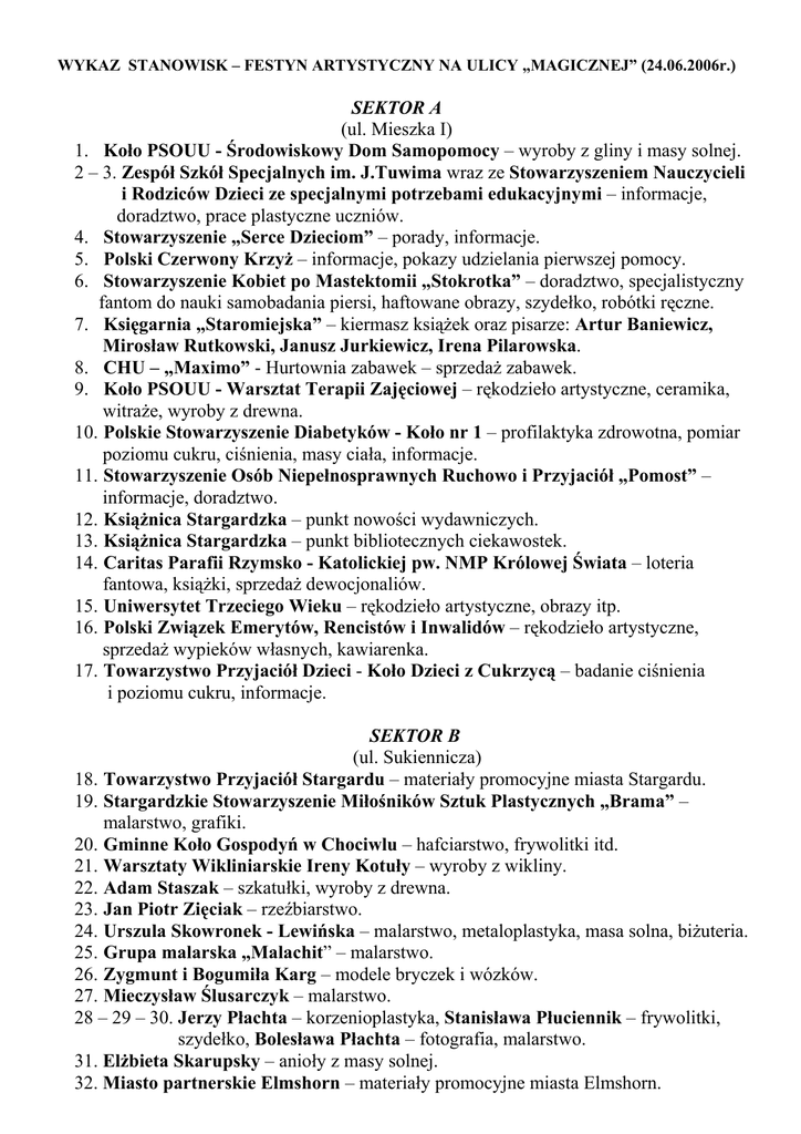 WYKAZ STANOWISK – FESTYN ARTYSTYCZNY NA ULICY „MAGICZNEJ” (24.06.2006r.) SEKTOR A (ul. Mieszka I) 1. Koło PSOUU - Środowiskowy Dom Samopomocy – wyroby z gliny i masy solnej. 2 – 3. Zespół Szkół Specjalnych im. J.Tuwima wraz ze Stowarzyszeniem Nauczycieli i Rodziców Dzieci ze specjalnymi potrzebami edukacyjnymi – informacje, doradztwo, prace plastyczne uczniów. 4. Stowarzyszenie „Serce Dzieciom” – porady, informacje. 5. Polski Czerwony Krzyż – informacje, pokazy udzielania pierwszej pomocy. 6. Stowarzyszenie Kobiet po Mastektomii „Stokrotka” – doradztwo, specjalistyczny fantom do nauki samobadania piersi, haftowane obrazy, szydełko, robótki ręczne. 7. Księgarnia „Staromiejska” – kiermasz książek oraz pisarze: Artur Baniewicz, Mirosław Rutkowski, Janusz Jurkiewicz, Irena Pilarowska. 8. CHU – „Maximo” - Hurtownia zabawek – sprzedaż zabawek. 9. Koło PSOUU - Warsztat Terapii Zajęciowej – rękodzieło artystyczne, ceramika, witraże, wyroby z drewna. 10. Polskie Stowarzyszenie Diabetyków - Koło nr 1 – profilaktyka zdrowotna, pomiar poziomu cukru, ciśnienia, masy ciała, informacje. 11. Stowarzyszenie Osób Niepełnosprawnych Ruchowo i Przyjaciół „Pomost” – informacje, doradztwo. 12. Książnica Stargardzka – punkt nowości wydawniczych. 13. Książnica Stargardzka – punkt bibliotecznych ciekawostek. 14. Caritas Parafii Rzymsko - Katolickiej pw. NMP Królowej Świata – loteria fantowa, książki, sprzedaż dewocjonaliów. 15. Uniwersytet Trzeciego Wieku – rękodzieło artystyczne, obrazy itp. 16. Polski Związek Emerytów, Rencistów i Inwalidów – rękodzieło artystyczne, sprzedaż wypieków własnych, kawiarenka. 17. Towarzystwo Przyjaciół Dzieci - Koło Dzieci z Cukrzycą – badanie ciśnienia i poziomu cukru, informacje. SEKTOR B (ul. Sukiennicza) 18. Towarzystwo Przyjaciół Stargardu – materiały promocyjne miasta Stargardu. 19. Stargardzkie Stowarzyszenie Miłośników Sztuk Plastycznych „Brama” – malarstwo, grafiki. 20. Gminne Koło Gospodyń w Chociwlu – hafciarstwo, frywolitki itd. 21. Warsztaty Wikliniarskie Ireny Kotuły – wyroby z wikliny. 22. Adam Staszak – szkatułki, wyroby z drewna. 23. Jan Piotr Zięciak – rzeźbiarstwo. 24. Urszula Skowronek - Lewińska – malarstwo, metaloplastyka, masa solna, biżuteria. 25. Grupa malarska „Malachit” – malarstwo. 26. Zygmunt i Bogumiła Karg – modele bryczek i wózków. 27. Mieczysław Ślusarczyk – malarstwo. 28 – 29 – 30. Jerzy Płachta – korzenioplastyka, Stanisława Płuciennik – frywolitki, szydełko, Bolesława Płachta – fotografia, malarstwo. 31. Elżbieta Skarupsky – anioły z masy solnej. 32. Miasto partnerskie Elmshorn – materiały promocyjne miasta Elmshorn. SEKTOR C (przy Bramie Pyrzyckiej od strony Placu Ducha Świętego) 33. Edward Pajewski – kowalstwo artystyczne. 34. Bractwo Rycerskie „Gryf” – rycerskie obozowisko, pokazy, konkursy. 35. Bogdan i Małgorzata Jastrzębscy – „Rajski Ogród”- rzeźby z drewna: zwierzęta i owady, warzywa i owoce, ludki, postacie z bajek i kreskówek. 36. Jacek Ewangelista – rośliny owadożerne, rośliny ozdobne. 37. Klub Sportowy „Mechanik” – rozgrywki szachowe. 38. Książnica Stargardzka – dziecięcy plener malarski, konkursy dla dzieci. 39. Krajowe Towarzystwo Autyzmu. Dzienny Ośrodek Rehabilitacyjno - Szkolno Wychowawczy – wystawa prac, plener plastyczny, konkursy dla dzieci. 40. Barbara Jaroszek – malowanie twarzy. 41. Antykwariat Pomorski – monety, banknoty, pocztówki, książki. 42. Bolesław Garczyński – odznaczenia i ordery. 43. Marcin Pardus – pocztówki. 44. Jacek Okraszewski – starocie: żelazka, lampy, artykuły gosp. domowego itp. 45. Andrzej Skrzypiec – biżuteria drewniana. 46. Marek Jurgowiak – pocztówki. 47. Dariusz Pokaczajło – monety, banknoty. SEKTOR D (ul. Mariacka przy Kolegiacie 48. Stargardzkie Stowarzyszenie Rewaloryzacji Zabytków Sakralnych – uroczyste otwarcie tarasu widokowego w Kolegiacie - godz. 10.30, sprzedaż biletów na taras widokowy i „cegiełek” na rzecz konserwacji zabytków, ceramika artystyczna.