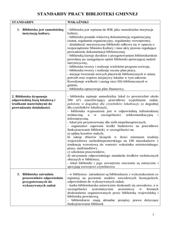 STANDARDY PRACY BIBLIOTEKI GMINNEJ STANDARDY 1. Biblioteka jest samodzielną instytucją kultury. 2. Biblioteka dysponuje odpowiednią bazą lokalową i środkami materialnymi do prowadzenia działalności. 3. Biblioteka zatrudnia pracowników odpowiednio przygotowanych do wykonywanych zadań WSKAŹNIKI - biblioteka jest wpisana do RIK jako samodzielna instytucja kultury, - biblioteka posiada właściwą dokumentację organizacyjną (statut, regulamin organizacyjny, regulaminy wewnętrzne), - działalność merytoryczna biblioteki odbywa się w oparciu o rozporządzenie Ministra Kultury i inne akty prawne regulujące prowadzenie dokumentacji bibliotecznej, - biblioteką kieruje dyrektor z przygotowaniem bibliotekarskim powołany po zasięgnięciu opinii biblioteki sprawującej nadzór merytoryczny, - biblioteka tworzy i realizuje wieloletni program rozwoju, - biblioteka tworzy i realizuje roczny plan pracy, - inicjuje tworzenie nowych placówek bibliotecznych w miarę potrzeb oraz wspiera inicjatywy lokalne w tym zakresie. Koordynuje wielkość i zasięg sieci filii bibliotecznych w gminie, - biblioteka opracowuje plan finansowy, - biblioteka zajmuje samodzielny lokal (o powierzchni około 200 m²) umożliwiający prawidłowe wypełnianie zadań, położony w dogodnej dla czytelników lokalizacji, (o dogodnej dla czytelników lokalizacji), - biblioteka wyposażona jest w odpowiednią infrastrukturę techniczną, a w szczególności: telekomunikacyjną i informatyczną, - lokal jest przystosowany dla osób niepełnosprawnych, - organizator zapewnia środki budżetowe na prawidłowe funkcjonowanie biblioteki, w szczególności na: a) opłatę kosztów stałych, b) zakup zbiorów (książek w ilości minimum średniej województwa zachodniopomorskiego na 100 mieszkańców z tendencją wzrostową do wartości wskaźnika ministerialnego; prasy, multimediów), c) szkolenia pracowników, d) utrzymanie odpowiedniego standardu środków technicznych obecnych w bibliotece, - lokal biblioteki i jego zewnętrzne otoczenie są estetyczne i sprzyjają rozwojowi czytelnictwa - w bibliotece zatrudnieni są bibliotekarze z wykształceniem co najmniej na poziomie studiów zawodowych licencjackich, odpowiednim do wykonywanych zadań, - kadra bibliotekarska ustawicznie doskonali się zawodowo, a w szczególności systematycznie uczestniczy w formach doskonalenia organizowanych przez bibliotekę wojewódzką i bibliotekę powiatową, - bibliotekarze znają aktualne przepisy prawa dotyczące funkcjonowania bibliotek 1 4. Biblioteka gromadzi materiały biblioteczne uwzględniając rozpoznane potrzeby środowiska. - biblioteka rozpoznaje problemy środowiska lokalnego, analizuje jego potrzeby i dostosowuje ofertę biblioteczną do tych potrzeb z uwzględnieniem potrzeb osób dotychczas nie korzystających z biblioteki, - kształtuje gusta czytelnicze przez odpowiednią strukturę zakupu, - aktualizuje i unowocześnia zbiory biblioteczne, - biblioteka promuje swój księgozbiór, - biblioteka analizuje trafność przygotowanej przez siebie oferty 5. Biblioteka pełni funkcję informacyjną. - biblioteka zapewnia dostęp do nowoczesnego warsztatu informacyjnego, w tym: a) katalogów bibliotecznych, b) komputerowych baz danych, c) odpowiednich zbiorów informacyjnych, d) bezpłatnego dostępu do Internetu, - biblioteka jest włączona w biblioteczną sieć komputerową na poziomie powiatowym, wojewódzkim, ogólnopolskim, - biblioteka jest ośrodkiem informacji regionalnej, lokalnej, - biblioteka promuje swoją działalność informacyjną 6. Zbiory biblioteczne dostępne są dla wszystkich czytelników. - biblioteka zapewnia dostęp do zbiorów dla różnych kategorii czytelników w czasie otwarcia dostosowanym do ich potrzeb, - biblioteka na równych prawach udostępnia swoje zbiory wszystkim czytelnikom bez względu na miejsce zamieszkania, - biblioteka ułatwia dostęp czytelnikom do zbiorów innych bibliotek w kraju i za granicą, m.in poprzez wypożyczenia międzybiblioteczne, - biblioteka tworzy w miarę potrzeb punkty biblioteczne na terenie gminy, - biblioteka likwiduje bariery w dostępie do księgozbioru, wypracowuje metody i sposoby dotarcia do czytelnika, 7. Biblioteka prowadzi działalność kulturalno-oświatową. - biblioteka jest animatorem działań kulturalnych w gminie, - biblioteka prowadzi działania popularyzujące czytelnictwo, - biblioteka współpracuje z organizacjami środowiskowymi i instytucjami w przeprowadzaniu imprez kulturalno oświatowych, - biblioteka bierze udział w działaniach kulturalno-oświatowych biblioteki powiatowej, - biblioteka promuje swoją działalność kulturalną i oświatową 8. Biblioteka aktywnie funkcjonuje w powiatowej sieci bibliotecznej. - biblioteka systematycznie kontaktuje się z biblioteką powiatową, - biblioteka zasięga opinii biblioteki powiatowej w sprawach merytorycznych organizacyjnych, - biblioteka przygotowuje na prośbę biblioteki powiatowej analizy potrzeb użytkowników na poziomie gminy, - kadra biblioteki uczestniczy w szkoleniach organizowanych przez bibliotekę powiatową, 2 - biblioteka zgłasza bibliotece powiatowej zapotrzebowanie na szkolenia, określając ich tematykę, - biblioteka współdziała w przygotowaniu kalendarza imprez kulturalnych na terenie powiatu i je promuje, - biblioteka przygotowuje sprawozdania ze stanu czytelnictwa w gminie, - biblioteka wspólnie z innymi bibliotekami w powiecie opracowuje plan rozwoju bibliotekarstwa na swoim terenie działania, - aktywnie uczestniczy w powiatowej sieci informatycznej bibliotek, 3