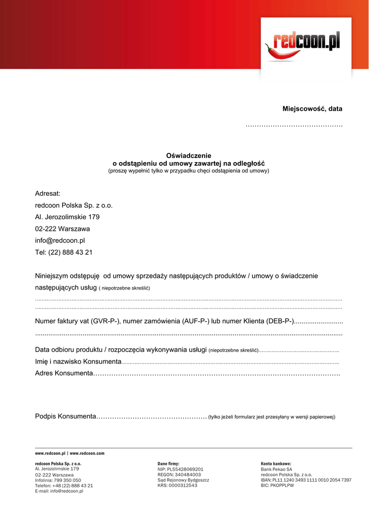 Miejscowość, data ……………………………………. Oświadczenie o odstąpieniu od umowy zawartej na odległość (proszę wypełnić tylko w przypadku chęci odstąpienia od umowy) Adresat: redcoon Polska Sp. z o.o. Al. Jerozolimskie 179 02-222 Warszawa [email protected] Tel: (22) 888 43 21 Niniejszym odstępuję od umowy sprzedaży następujących produktów / umowy o świadczenie następujących usług ( niepotrzebne skreślić) …………………………………………………………………………………………………………………………………………………………………… …………………………………………………………………………………………………………………………………………………………………… Numer faktury vat (GVR-P-), numer zamówienia (AUF-P-) lub numer Klienta (DEB-P-).......................... .................................................................................................................................................................. Data odbioru produktu / rozpoczęcia wykonywania usługi (niepotrzebne skreślić)…………………………………………. Imię i nazwisko Konsumenta…………………………………………………………………………………………………………………… Adres Konsumenta………………………………………………………………………………………………. Podpis Konsumenta…………………………………………. (tylko jeżeli formularz jest przesyłany w wersji papierowej) www.redcoon.pl | www.redcoon.com redcoon Polska Sp. z o.o. Al. Jerozolimskie 179 02-222 Warszawa Infolinia: 799 350 050 Telefon: +48 (22) 888 43 21 E-mail: [email protected] Dane firmy: NIP: PL55428069201 REGON: 340484003 Sąd Rejonowy Bydgoszcz KRS: 0000312543 Konto bankowe: Bank Pekao SA redcoon Polska Sp. z o.o. IBAN: PL11 1240 3493 1111 0010 2054 7397 BIC: PKOPPLPW