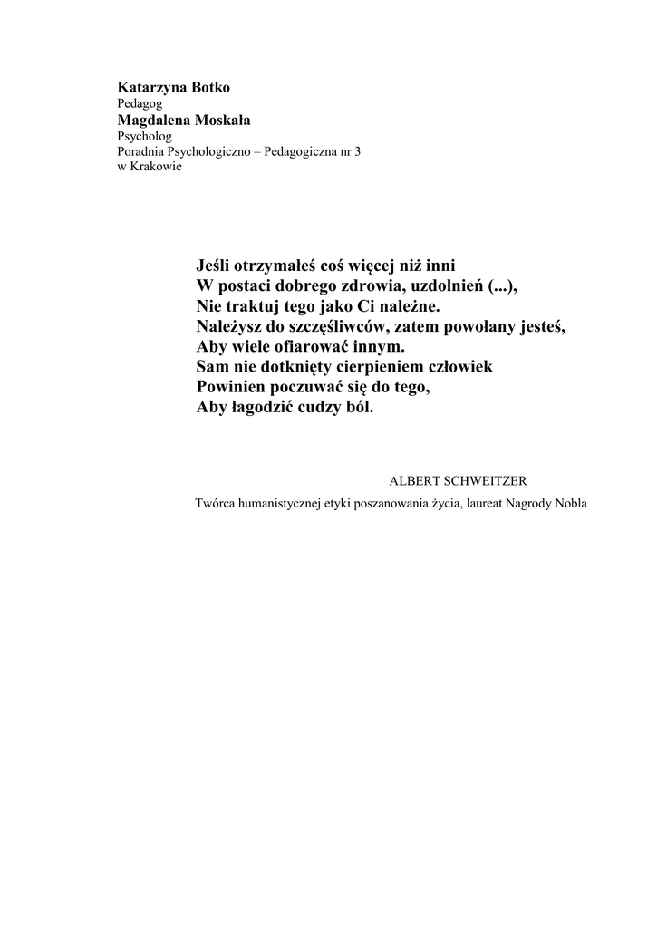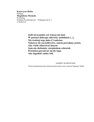 Katarzyna Botko Pedagog Magdalena Moskała Psycholog Poradnia Psychologiczno – Pedagogiczna nr 3 w Krakowie Jeśli otrzymałeś coś więcej niż inni W postaci dobrego zdrowia, uzdolnień (...), Nie traktuj tego jako Ci należne. Należysz do szczęśliwców, zatem powołany jesteś, Aby wiele ofiarować innym. Sam nie dotknięty cierpieniem człowiek Powinien poczuwać się do tego, Aby łagodzić cudzy ból. ALBERT SCHWEITZER Twórca humanistycznej etyki poszanowania życia, laureat Nagrody Nobla MŁODZIEŻOWY TELEFON ZAUFANIA – pierwszą pomocą psychologiczno – pedagogiczną. Anglikański pastor Chad Varah w 1958 roku powołał pierwszą w świecie telefoniczną placówkę pomocy człowiekowi, który znalazł się sam ze swoim problemem, ze swoim cierpieniem. Fakt, że pierwszą posługą początkującego duchownego było uczestnictwo w pogrzebie 14-letniej samobójczyni sprawił, iż jakiś czas później zamieścił on w gazecie londyńskiej ogłoszenie – jeśli chcesz popełnić samobójstwo, najpierw zadzwoń do mnie. Na podany numer zaczęli telefonować londyńczycy i jednocześnie zgłaszać się ochotnicy chcący dyżurować przy telefonach. Przyjęli nazwę SAMARYTANIE. Z czasem było ich tylu, że w każdym większym mieście w Anglii powstały telefony zaufania. Po dwudziestu latach działanie stwierdzono spadek liczby samobójstw o jedną trzecią. Idea Chad Vara rozprzestrzeniła się po całym świecie. W latach 60-tych Telefony Zaufania istniały już prawie we wszystkich krajach Europy. Przedstawiciele tych placówek spotkali się w roku 1960 w Genewie. Spotkanie to dało początek międzynarodowej współpracy, która zaowocowała stworzeniem w roku 1967 Międzynarodowej Federacji Pomocy Telefonicznej (IFOTES). Opracowano statut i normy pracy dla wszystkich placówek, które zostaną członkami Federacji, na której siedzibę wybrano Genewę. W Polsce ideę Chad Varacha pierwszy podjął prof. med. Tadeusz Kielanowski w roku 1967. Z jego pomocą powstał TZ w Gdańsku. W tym samym roku prof. Adam Bukowczyk, lek. psychiatra powołał TZ we Wrocławiu. Kraków był szóstym miastem z kolei. Inicjatorem powstania TZ był prof. Julian Aleksandrowicz i prof. Antoni Kępiński. Ponad 36 lat temu pracownicy naszej Poradni zainspirowani ideą specyficznej, anonimowej pomocy telefonicznej podjęli trud stworzenia kolejnej krakowskiej placówki, nastawionej głównie na kontakt z młodym rozmówcą. Od 1 kwietnia 1971 roku rozpoczął swoją działalność MŁODZIEŻOWY TELEFON ZAUFANIA pod numerem 9288. Od 1973 roku jest zarejestrowany w Międzynarodowej Federacji Pomocy Telefonicznej. Jest drugim, obok Telefonu Zaufania dla Dorosłych krakowskim telefonem zrzeszonym w tej federacji. Dyżuranci Młodzieżowego Telefonu Zaufania „spotykają się w rozmowie” z ludźmi potrzebującymi pomocy, z młodymi nie umiejącymi znaleźć wyjścia z trudnej sytuacji. Starają się ułatwić podjęcie decyzji, pomóc rozeznać istotę konfliktu, zmienić punkt widzenia, dodać odwagi, złagodzić lęk, natchnąć nadzieją na lepsze jutro. Ostatnie dane statystyczne potwierdzają nasze spostrzeżenia o bardzo złej kondycji psychofizycznej młodzieży i jej bezradności wobec złożonych problemów życiowych. Na przestrzeni lat znacznie wzrosła ilość rozmów telefonicznych, szczególnie w przypadku Młodzieżowego Telefonu Zaufania. Fakt ten przypuszczalnie świadczy o nasileniu się tzw. sieroctwa społecznego odczuwanego przez młodzież. Obserwuje się spadek poczucia bezpieczeństwa młodych ludzi, co przejawia się w trudnościach z nawiązaniem lub utrzymaniem więzi koleżeńskiej, wzroście agresji, lęku przed szkołą, podejmowaniu prób samobójczych. Obok aktualnych problemów dzieci i młodzieży pojawiły się nowe, niosące duże zagrożenie społeczne – aids, nadużycia seksualne, nieformalne grupy nacisku, alkoholizm, narkomania. Czy te smutne dane to bezpodstawne sądy o przejawach kryzysu współczesnych adolescentów? Kto najczęściej łączy się z numerem 9288? Co mówią o sobie nasi młodzi rozmówcy, jakie mają powody do płaczu, śmiechu, co budzi ich niepokój, lęk, co stanowi przyczynę buntu, prowokacji? Próbę znalezienia odpowiedzi na postawione pytania oparto o analizę rejestru przeprowadzonych rozmów Młodzieżowego Telefonu Zaufania w roku szkolnym 2006/2007. Skupiono się na połączeniach, które dotyczyły młodych rozmówców w przedziale od 12 do 20 roku życia. Odrębną grupę stanowią rozmowy z rodzicami młodzieży znajdującej się w okresie adolescencji. Analizę zagadnienia: 1. 2. 3. 4. 5. 6. treści rozmów przeprowadzono przyjmując następujące Problematyka erotyczno-seksualna (antykoncepcja, onanizm, ciąża) Obraz samego siebie (jak wyglądam?, jaki jestem?, kim jestem?) Współżycie w rodzinie Współżycie z rówieśnikami Problemy szkolne (trudności w nauce, konflikty z nauczycielami) Problematyka zdrowia (choroby, dolegliwości fizyczne, narkotyki, alkohol, zaburzenia łaknienia). Procentową analizę prezentują wykresy obejmujące zależność między ilością przeprowadzonych rozmów z młodzieżą i ich rodzicami, a wyróżnionymi empirycznie kategoriami. Procentowe zestawienie różnic w ilości przeprowadzonych rozmów z młodzieżą w poszczególnych kategoriach 25 ilość rozmów w % 20 15 10 5 0 Wśród przyjętych do analizy kategorii problemów najwięcej rozmów dotyczy problematyki erotyczno seksualnej. Najczęstsze pytania, wątpliwości związane są z antykoncepcją, onanizmem i ciążą. Najmniejsza ilość połączeń wystąpiła w kategorii związanej z tożsamością, z poszukiwaniem odpowiedzi na pytania: jak wyglądam?, jaki jestem?, kim jestem? W pozostałych kategoriach ilość rozmów jest zbliżona. Wykaz ilości przeprowadzonych rozmów z rodzicami adolescentów w poszczególnych kategoriach 12,0 ilość rozmów w % 10,0 8,0 6,0 4,0 2,0 0,0 Najwyższy wskaźnik, aż 11,9% to rozm
