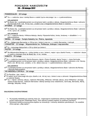 PORZĄDEK NABOŻEŃSTW 20 – 26 lutego 2017 PONIEDZIAŁEK – 20 lutego 1800 Za ++ rodziców Jana i Anielę Baron o radość życia wiecznego i za ++ z pokrewieństwa. KOLANOWICE 16 Do Bożej Op. z podziękowaniem za otrzymane łaski z prośba o dalsze, błogosławieństwo Boże i zdrowie dla Konrada Krok z ok. 75-tej rocz. urodzin oraz o błogosławieństwo Boże w rodzinie. 30 WTOREK – 21 lutego 1600 Do Bożej Op. z podziękowaniem za otrzymane łaski z prośba o dalsze, błogosławieństwo Boże i zdrowie w int. syna z ok. urodzin. KOLANOWICE 1730 Za ++ rodziców Martę i Wiktora Mateja, Martę i Ryszarda Kulisz, brata, bratową ++ dziadków i ++ z pokrewieństwa. ŚRODA – 22 lutego – Święto Katedry św. Piotra, Apostoła 1800 Za + Małgorzatę Barwaniec w 18-tą rocz. śmierci oraz za ++ z rodzin Barwaniec i Jończyk CZWARTEK – 23 lutego – Wspomnienie św. Polikarpa, biskupa i męczennika 1800 Za + Antoniego Matyschok w 30-ty dzień po śmierci. PIĄTEK – 24 lutego 1800 Do Miłosierdzia Bożego za + córkę Anielę w rocz. śmierci, męża i ojca Józefa Fronia, ++ rodziców i dusze w czyśćcu cierpiące oraz do Bożej Op. w int. wnuka. SOBOTA – 25 lutego 700 Za ++ rodziców Anastazję i Rocha Roswora, Marie i Piotra Świętek, Marię Tarara i + żonę Gertrudę. 1500 Z podziękowaniem za otrzymane łaski z prośbą o dalsze, błogosławieństwo Boże i zdrowie w int. Doroty Pech z ok. 80-tej rocz. urodzin, w int. dzieci oraz za ++ z pokrewieństwa z obu stron. KOLANOWICE 1700 Z podziękowaniem za otrzymane łaski z prośbą o dalsze, błogosławieństwo Boże i zdrowie dla Renaty i Henryka Rybczyńskich. VIII NIEDZIELA ZWYKŁA – 26 lutego 700 Za Parafian. (jęz. niem.) 830 O radość życia wiecznego dla ojca Józefa z ok. 44-tej rocz. śmierci oraz o zdrowie i błogosławieństwo Boże w rodzinie Skubis. 1030 Za ++ Marie i Alfonsa Jakusz, rodziców Weronikę, Wiktorię i Alfreda Jakusz, braci Wilhelma i Jerzego, siostrę Erykę Karwat, rodziców Bernarda i Albinę Szmieja oraz rodzeństwo, Gertrudę, Bernarda, Marię, Jadwigę, Matyldę i Annę. OGŁOSZENIA DUSZPASTERSKIE 1. W przyszłą niedzielę po trzeciej mszy św. rozpoczęcie trzydniowej adoracji Najświętszego Sakramentu przed rozpoczęciem Wielkiego Postu. Plan adoracji podany będzie na osobnych kartkach. 2. Dzisiejsza kolekta przeznaczona będzie na renowacje i remonty obiektów parafialnych. Za wszelkie ofiary gorące „Bóg zapłać”. PORZĄDEK NABOŻEŃSTW 27 lutego – 05 marca 2017 PONIEDZIAŁEK – 27 lutego – całodzienna adoracja Najświętszego Sakramentu 900 Do Najświętszego Sakramentu o przebłaganie i zadośćuczynienie za nasze niewierności i grzechy. 1800 Za + Helenę Grochol od rodziny Rapaczów i rodziny Wdowiczów z Jurkowa. WTOREK – 28 lutego – całodzienna adoracja Najświętszego Sakramentu 900 O zdrowie dla chorych naszej parafii oraz o umocnienie w dźwiganiu Krzyża swoich cierpień i o łaskę połączenia ich z Krzyżem Jezusa Chrystusa. 00 16 O dary Ducha Świętego dla Benedykta z ok. 10-tej rocz. urodzin, za jego rodziców, dziadków i chrzestnych oraz w int. dzieci 1-szo komunijnych. KOLANOWICE 17 Za + Augustyna Czernia w 1-szą rocz. śmierci i + żonę Klarę. (Formularz mszy św. ze Środy Popielcowej). 30 ŚRODA POPIELCOWA – 01 marca 900 Za dusze w czyśćcu cierpiące. 1800 Za Parafian. CZWARTEK – 02 marca 1730 Nabożeństwo Eucharystyczne. 1800 Za ++ żony Magdalenę i Alicję Gryglik, ++ rodziców z obu stron i ++ z pokrewieństwa. PIĄTEK – 03 marca 700 W int. Czcicieli Najświętszego Serca Pana Jezusa. 1715 Droga Krzyżowa. SOBOTA – 04 marca – Święto św. Kazimierza Królewicza 700 Do Matki Bożej Fatimskiej o mocną wiarę i czystość serc dla Dzieci Maryi, Wspólnoty Rycerza Niepokalanej i członków Róż Różańcowych naszej Parafii oraz za ++ członków z tych Wspólnot. KOLANOWICE 1700 Za ++ rodziców Jadwigę i Józefa Czok, dwóch braci, bratową, ojca Piotra Lukas, Zofię i Jana Wystub i ++ z rodzin z obu stron. I NIEDZIELA WIELKIEGO POSTU – 05 marca 700 Za ++ rodziców Józefa i Elżbietę Morawiec, teściów Pawła i Helenę Czopka oraz za ++ z pokrewieństwa o radość życia wiecznego. 830 Za + męża Rudolfa Gallus, rodziców Klinder i Gallus, szwagra Wernera i ++ z pokrewieństwa oraz do Bożej Op. M.B.N.P. o błogosławieństwo Boże i zdrowie w rodzinie syna. 1030 Za ++ rodziców Marie i Ludwika Tarara, Annę i Alojzego Curlok, brata Rajmunda i ++ z pokrewieństwa. 1500 Gorzkie Żale z kazaniem pasyjnym. OGŁOSZENIA DUSZPASTERSKIE 1. W przyszłą niedzielę, 05.03, po Gorzkich Żalach, nauki przedchrzcielne na plebani. 2. Za tydzień kolekta przeznaczona jest na W.S.D. w Opolu i inne instytucje diecezjalne. 3. W tym tygodniu przypada I czwartek, piątek i sobota miesiąca. W piątek dopołudnia odwiedziny chorych. Ogłoszenia i intencje można znaleźć w Internecie: www.osowiecslaski.pl lub www.kolanowice.com.pl www.wegry.turawa.pl