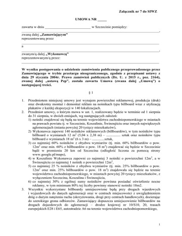 Załącznik nr 7 do SIWZ UMOWA NR _____ zawarta w dniu _________________________ w Szczecinie pomiędzy: ___________________________________________________________________________, zwaną dalej „Zamawiającym” reprezentowaną przez ___________________________________________________________________________ a ___________________________________________________________________________, zwanym/ą dalej „Wykonawcą” reprezentowanym/ą przez: ___________________________________________________________________________ W wyniku postępowania o udzielenie zamówienia publicznego przeprowadzonego przez Zamawiającego w trybie przetargu nieograniczonego, zgodnie z przepisami ustawy z dnia 29 stycznia 2004r. Prawo zamówień publicznych (Dz. U. z 2015 r., poz. 2164), zwanej dalej „ustawą Pzp”, została zawarta Umowa (zwana dalej „Umową”) o następującej treści. §1 1. 2. 3. Przedmiotem niniejszej umowy jest wynajem powierzchni reklamowej, produkcja (druk) oraz dwukrotny montaż i demontaż reklam na nośnikach typu billboard wraz z utylizacją plakatów z każdej ekspozycji w 140 lokalizacjach. Przedmiot umowy, o którym mowa w ust. 1, realizowany będzie w terminie od 1 sierpnia do 31 sierpnia, w dwóch emisjach, wg następujących założeń: 1) nośniki znajdować się będą na terenie województwa zachodniopomorskiego w miastach na prawach powiatu tj. w Szczecinie, Koszalinie, Świnoujściu oraz innych największych aglomeracjach (miasta powyżej 20 tysięcy mieszkańców), 2) Wykonawca zapewni 140 nośników reklamowych (billboardów), w tym nośników typu billboard o wymiarach 12 m2 (5,04 x 2,38 m) – ................ sztuk oraz nośników typu billboard o wymiarach 18 m2 (6 x 3 m) – ..............sztuk, 3) co najmniej 60% nośników z obydwu wymiarów (tj. min. 60% billboardów o pow. 12m2 oraz min. 60% z billboardów o pow. 18 m2) znajdować się będzie w Szczecinie bądź w promieniu 20 km od Szczecina (odległość liczona za pomocą strony www.google.pl/maps), 4) w Koszalinie Wykonawca zapewni co najmniej 3 nośniki o powierzchni 12m2, a w Świnoujściu co najmniej 1 nośnik o powierzchni 12m2, 5) co najmniej 25 % nośników z obydwu wymiarów (tj. min. 25% billboardów o pow. 12m2 oraz min. 25% billboardów o pow. 18 m2) znajdowała się będzie na terenie województwa zachodniopomorskiego, w miastach powyżej 20 tysięcy mieszkańców, z wyłączeniem Szczecina, Koszalina i Świnoujścia, 6) co najmniej 30% z ogólnej sumy nośników powinna posiadać oświetlenie nocne reklamy, w tym minimum 80% tej liczby powinny stanowić nośniki 18m2. Wszystkie wykorzystane billboardy umiejscowione będą przy drogach wjazdowych i wyjazdowych do danych aglomeracji oraz w centrach miejscowości z uwzględnieniem dróg o dużym natężeniu ruchu (skrzyżowania, drogi przy centrach handlowych), docierając do szerokiego grona odbiorców. Zamawiający dopuszcza umiejscowienie billboardów na drogach dojazdowych do aglomeracji – drodze krajowej nr 10/S10, 20, trasach europejskich E28 i E65, autostradzie A6 na terenie województwa zachodniopomorskiego, 1 4. 5. 6. 7. Zamawiający przewiduje dwie emisje/ekspozycje reklamy: od 1 do 15 sierpnia oraz od 15 do 31 sierpnia. Druga emisja reklamy musi odbyć się dokładnie na tych samych nośnikach. Zamawiający zastrzega, iż nie ma możliwość zmiany lokalizacji nośników pomiędzy emisjami. Reklama na nośnikach powinna być w pełni widoczna, tj. nie zasłonięta przez krzewy, drzewa oraz inne obiekty. Billboardy muszą być estetyczne, nieuszkodzone tzn. bez widocznych śladów uszkodzeń, malowideł na ramie i podstawie billboardu. Integralnym elementem umowy jest produkcja (druk) oraz dwukrotny montaż i demontaż reklam na nośnikach wraz z utylizacją plakatów z każdej ekspozycji. Przez termin montażu rozumie się pierwsze dwa dni robocze terminów emisji. Zamawiający przewiduje 5 różnych wariantów graficznych w dwóch rozmiarach na każdą z emisji. Wydruk wszystkich reklam 4 + 0 na papierze bilbordowym bluebeck 120g. Wykonawca zobowiązany jest do dostarczenia wydruku próbnego jednej reklamy w oryginalnym rozmiarze (12m2 lub 18m2), przed drukiem całego nakładu. Produkcja może nastąpić po pisemnej akceptacji wydruku próbnego przez Zamawiającego. Wykonawca jest zobowiązany do udostępnienia własnej lub dokonania zakupu/najmu powierzchni reklamowych dla potrzeb ekspozycji materiałów promocyjnych Zamawiającego we wskazanym terminie. §2 1. 2. 3. Wykonawca oświadcza, że posiada wszelkie przewidziane prawem uprawnienia oraz pozwolenia na wynajem powierzchni reklamowej, druk, wyklejenie i ekspozycję reklam na nośnikach, w tym odpowiednie doświadczenie zawodowe. Wykonawca zobowiązuje się do wykonania usługi rzetelnie, terminowo i ze szczególną starannością uwzględniającą odpowiednie umiejętności i wiedzę fachową. Wykonawca ponosi pełną odpowiedzialność za jakość świadczonych usług i za wykonanie ich zgodnie z najlepszą wiedzą. §3 1. 2. 3. 4. 5. Wydruk plakatów nastąpi na podstawie dostarczonych i zaakceptowanych przez Zamawiającego projektów graficznych. Zamawiający przekaże Wykonawcy projekty plakatów najpóźniej na 17 dni kalendarzowych przed planowaną ekspozycją, na wskazany przez Wykonawcę adres email. Wykonawca zobowiązany jest dostarczyć do akceptacji Zamawiającego, co najmniej 10 dni przed ekspozycją reklam, plan dotyczący ekspozycji. Plan musi zawierać dokładny adres umieszczenia każdego billboardu wraz z aktualnym zdjęciem, potwierdzającym lokalizację, stan techniczny oraz estetyczny nośnika wraz z opisem lokalizacji (w formie papierowej lub na nośniku CD). Zamawiający zadecyduje w ciągu 3 dni roboczych, który wariant graficzny zostanie umieszczony w poszczególnych lokalizacjach, przekazując powyższą informację na wskazany przez Wykonawcę adres e-mail. W okresie trwania ekspozycji Wykonawca zobowiązuje się do zapewnienia trwałości mo
