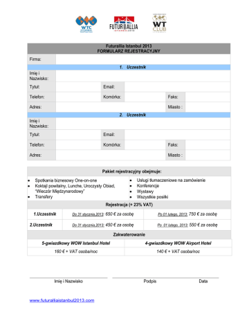 Futurallia Istanbul 2013 FORMULARZ REJESTRACYJNY Firma: 1. Uczestnik Imię i Nazwisko: Tytuł: Email: Telefon: Komórka: Faks: Adres: Miasto : 2. Uczestnik Imię i Nazwisko: Tytuł: Email: Telefon: Komórka: Faks: Adres: Miasto : Pakiet rejestracyjny obejmuje: Spotkania biznesowy One-on-one Koktajl powitalny, Lunche, Uroczysty Obiad, “Wieczór Międzynarodowy” Transfery Usługi tłumaczeniowe na zamówienie Konferencje Wystawy Wszystkie posiłki Rejestracja (+ 23% VAT) 1.Uczestnik 2.Uczestnik Do 31 stycznia,2013: 650 € za osobę Po 01 lutego, 2013: 750 € za osobę Do 31 stycznia,2013: 450 € za osobę Po 01 lutego, 2013: 550 € za osobę Zakwaterowanie 5-gwiazdkowy WOW Istanbul Hotel 4-gwiazdkowy WOW Airport Hotel 160 € + VAT osoba/noc 140 € + VAT osoba/noc Imię i Nazwisko www.futuralliaistanbul2013.com Podpis Data Futurallia Istanbul 2013 Ogólne warunki sprzedaży 1 - ZAKRES Niniejsze warunki zostały ustalone celem rejestracji przedsiębiorstw na forum biznesowe organizowane w Istambule w dniach 5, 6 i 7 czerwca 2013 roku i udziału w “Futurallia Istanbul 2013”. Dotyczą one osób oraz firm, pracodawców, pośredników i osób indywidulanych, które wyrażają chęć udziału w Futurallia Istanbul 2013 i dalej zwane są “uczestnikami”. World Trade Center Istanbul (WTC Istanbul), dalej zwany “organizatorem” Futurallia Istanbul 2013. 2 – REJESTRACJA Opłata rejestracyjna wpłacana przez “uczestnika” powinna obejmować usługi wspomniane w części “Pakiet rejestracyjny” na stronie pierwszej. Rejestracji można dokonać bezpośrednio przez “Lidera Delegacji” lub drogą pocztową, faksem, mailem oraz online na stronie http://www.futuralliaistanbul2013.com. Aby dokonać rejestracji, uczestnicy powinni przesłać opłatę na World Trade Center Istanbul lub do Lidera Delegacji. Gdy kwota zostanie otrzymana, rachunek na pełną kwotę zostanie przesłany do uczestnika. Rejestracja nie może być potwierdzona bez rachunku na pełną kwotę. Opłata rejestracyjna zapłacona przez uczestnika powinna obejmować usługi wspomniane w części “Pakiet rejestracyjny” na stronie pierwszej. Jakiekolwiek usługi nie objęte pakietem rejestracyjnym będą płatne przez uczestnika bezpośrednio u dostawcy usług. Organizator nie odpowiada za żadne długi zaciągnięte przez uczestnika. 3 - ZOBOWIĄZANIA a) b) c) d) e) Zobowiązania związane z wydarzeniem: Uczestnicy zgadzają się na wypełnienie dokumentów związanych z uczestnictwem w wydarzeniu, w ramach określonego limitu czasowego. Wypełnione dokumenty należy przesłać pocztą, faksem lub mailem. Organizator nie ponosi odpowiedzialności za niepełną lub niewłaściwą informację opublikowaną w katalogu Futurallia Istanbul 2013. Organizator zastrzega sobie prawo do odmówienia udziału uczestnikowi bez podawania powodu. Organizator zastrzega sobie prawo do odwołania udziału uczestnika oraz obciążenia go odpowiedzialnością za to odwołanie, jeżeli firma nie przekaże dokumentów wymaganych w celu wykonania usług, które zobowiązała się dostarczyć w określonych ramach czasowych – Rejestracja trwa do 6 maja 2013 roku. Korzystanie z Internetu podczas wydarzenia: Korzystając z dostępu do Internetu zapewnionego podczas Futurallia Istanbul 2013, użytkownik nie będzie mógł przesyłać lub zgrywać treści zakazanych, nielegalnych lub niemoralnych, niezgodnych z prawem lub porządkiem publicznym, które mogą naruszyć prawa stron trzecich, w szczególności w związku z prawem własności intelektualnej, literackiej, artystycznej lub fotograficznej. Uczestnik nie będzie mógł korzystać z Internetu w sposób nielegalny lub nadmierny, utrudniający dostęp do usług Internetowych. Organizatorzy nie są odpowiedzialni za szkody wynikające z korzystania z dostępu do Internetu, ani za zakłócenia lub przerwy w usługach. Odpowiedzialność Cywilna uczestników: Każdy uczestnik powinien zakupić, posiadać lub otrzymać od swojego pracodawcy, pośrednika lub osoby indywidualnej, ubezpieczenie odpowiedzialności cywilnej pokrywające wszystkie szkody dokonane przez strony trzecie podczas całego wydarzenia oraz akty i przewinienia uczestników, pracodawców lub pośredników, a także dotyczące ich własności i dóbr. Każdy uczestnik powinien również wykupić ubezpieczenie od wszelkiego ryzyka, w tym kradzieży, obejmujące wszystkie posiadane lub kontrolowane dobra. Jeżeli nie wskazano inaczej, uczestnik zgadza się na używanie swojego wizerunku dla celów komercyjnych, podczas filmowania wydarzenia. Po wydarzeniu: Firma zgadza się informować Organizatora o rezultatach wynikających z uczestnictwa w wydarzeniu, poprzez wypełnienie kwestionariusza przekazanego pod koniec wydarzenia lub Liderowi Delegacji. 4 - ANULOWANIE Opłata rejestracyjna może zostać zwrócona, jeśli anulacja jest dokonana przed 6 maja 2013 roku. Zwrot nie jest możliwy po 6 maja 2013 roku. Każde odwołanie spowodowane przez force majeure musi być złożone w formie pisemnej przez uczestnika i przesłane do organizatora wraz z dokumentami dowodowymi. Następujące przyczyny uważane są za force majeure: choroba, wypadek, śmierć krewnego, katastrofa naturalna oraz inne, wyjątkowe okoliczności. Proszę wziąć pod uwagę, że odmówienie wydania wizy nie jest powodem force majeure. Odpowiedzialnością uczestnika jest złożenie wniosku wizowego w określonych ramach czasowych i otrzymanie wizy przed 6 maja 2013 roku. 5 – PRAWO STOSOWANE – SPORY Warunki regulowane są przez prawo obowiązujące w Turcji, a każdy spór wynikający z niniejszej konwencji będzie rozstrzygany w Sądzie w Istambule (Turcja). www.futuralliaistanbul2013.com