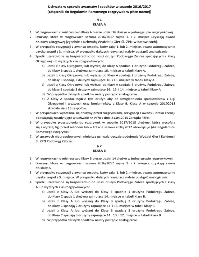 Uchwała w sprawie awansów i spadków w sezonie 2016/2017 (załącznik do Regulamin Ramowego rozgrywek w piłce nożnej) §1 KLASA A 1. W rozgrywkach o mistrzostwo Klasy A bierze udział 16 drużyn w jednej grupie rozgrywkowej. 2. Drużyny, które w rozgrywkach sezonu 2016/2017 zajmą 1. i 2. miejsce uzyskają awans do Klasy Okręgowej (zgodnie z uchwałą Wydziału Gier Śl. ZPN w Katowicach). 3. W przypadku rezygnacji z awansu zespołu, który zajął 1. lub 2. miejsce, awans automatycznie uzyska zespół z 3. miejsca. W przypadku dalszych rezygnacji należy postąpić analogicznie. 4. Spadki uzależnione są bezpośrednio od ilości drużyn Podokręgu Zabrze spadających z Klasy Okręgowej lub wyższych klas rozgrywkowych: a) Jeżeli z Klasy Okręgowej lub wyższej do Klasy A spadnie 1 drużyna Podokręgu Zabrze, do Klasy B spada 1 drużyna zajmująca 16. miejsce w tabeli Klasy A. b) Jeżeli z Klasy Okręgowej lub wyższej do Klasy A spadają 2 drużyny Podokręgu Zabrze, do klasy B spadają 2 drużyny zajmujące 16. i 15. miejsce w tabeli Klasy A c) Jeżeli z Klasy Okręgowej lub wyższej do Klasy A spadają 3 drużyny Podokręgu Zabrze, do klasy B spadają 3 drużyny zajmujące 16. 15. i 14. miejsce w tabeli Klasy A d) W przypadku dalszych spadków należy postąpić analogicznie. e) Z Klasy A spadać będzie tyle drużyn aby po uwzględnieniu spadkowiczów z Ligi Okręgowej i wyższych oraz beniaminków z Klasy B, Klasa A w sezonie 2017/2018 składała się z 16 zespołów. 5. W przypadkach wycofania się drużyny przed rozgrywkami, rezygnacji z awansu, braku licencji obowiązują zasady ujęte w uchwale nr V/70 z dnia 21.04.2015 Zarządu PZPN. 6. W przypadku przystąpienia do rozgrywek w sezonie 2017/2018 drużyny, która wycofała się z wyższej ligi przed sezonem lub w trakcie sezonu 2016/2017 obowiązuje §42 Regulaminu Ramowego Rozgrywek. 7. W sprawach nieuregulowanych niniejszą uchwałą decyzję podejmuje Wydział Gier i Ewidencji Śl. ZPN Podokręg Zabrze. §2 KLASA B 1. W rozgrywkach o mistrzostwo Klasy B bierze udział 14 drużyn w jednej grupie rozgrywkowej. 2. Drużyny, które w rozgrywkach sezonu 2016/2017 zajmą 1. i 2. miejsce uzyskają awans do klasy A. 3. W przypadku rezygnacji z awansu zespołu, który zajął 1. lub 2. miejsce, awans automatycznie uzyska zespół z 3. miejsca. W przypadku dalszych rezygnacji należy postąpić analogicznie. 4. Spadki uzależnione są bezpośrednio od ilości drużyn Podokręgu Zabrze spadających z klasy A lub wyższych klas rozgrywkowych: a) Jeżeli z Klasy A lub wyższej do Klasy B spadnie 1 drużyna Podokręgu Zabrze, do Klasy C spada 1 drużyna zajmująca 14. miejsce w tabeli Klasy B. b) Jeżeli z Klasy A lub wyższej do Klasy B spadają 2 drużyny Podokręgu Zabrze, do Klasy C spadają 2 drużyny zajmujące 14. i 13. miejsce w tabeli Klasy B. c) Jeżeli z Klasy A lub wyższej do Klasy B spadają 3 drużyny Podokręgu Zabrze, do Klasy C spadają 3 drużyny zajmujące 14. 13. i 12. miejsce w tabeli Klasy B. d) W przypadku dalszych spadków należy postąpić analogicznie. e) Z Klasy B spadać będzie tyle drużyn aby po uwzględnieniu spadkowiczów z Klasy A i wyższych oraz beniaminków z Klasy C, Klasa B w sezonie 2017/2018 składała się z 14 zespołów. 5. W przypadkach wycofania się drużyny przed rozgrywkami, rezygnacji z awansu, braku licencji obowiązują zasady ujęte w uchwale nr V/70 z dnia 21.04.2015 Zarządu PZPN. 6. W przypadku przystąpienia do rozgrywek w sezonie 2017/2018 drużyny, która wycofała się z wyższej ligi przed sezonem lub w trakcie sezonu 2016/2017 obowiązuje §42 Regulaminu Ramowego Rozgrywek. 7. W sprawach nieuregulowanych niniejszą uchwałą decyzję podejmuje Wydział Gier i Ewidencji Śl. ZPN Podokręg Zabrze. §3 KLASA C 1. W rozgrywkach o mistrzostwo Klasy C bierze udział 13 drużyn w jednej grupie rozgrywkowej. 2. Drużyny, które w rozgrywkach sezonu 2016/2017 zajmą 1. i 2. miejsce uzyskają awans do Klasy B. 3. W przypadku rezygnacji z awansu zespołu, który zajął 1. lub 2. miejsce, awans automatycznie uzyska zespół z 3. miejsca. W przypadku dalszych rezygnacji należy postąpić analogicznie. 4. W sprawach nieuregulowanych niniejszą uchwałą decyzję podejmuje Wydział Gier i Ewidencji Śl. ZPN Podokręg Zabrze. §4 A1 (Junior Starszy) 1. W rozgrywkach o mistrzostwo Podokręgowej Ligi Juniorów Starszych bierze udział 10 drużyn w jednej grupie rozgrywkowej, które grają systemem jesień – wiosna. 2. Drużyna, która w rozgrywkach sezonu 2016/2017 zajmie 1. miejsce uzyska tytuł mistrza Juniorów Starszych Podokręgu Zabrze. §5 B1 (Junior Młodszy) IV Liga Okręgowa Juniorów Młodszych (B1) – rocznik 2000 i młodsi Runda jesienna: 2 grupy po 8 zespołów, 14 kolejek 1. miejsca – baraż systemem mecz – rewanż o awans do III Ligi Wojewódzkiej Juniorów Młodszych. Runda wiosenna: 2 grupy po 6 zespołów, 10 kolejek 1. miejsca – baraż systemem mecz – rewanż o awans do III Ligi Wojewódzkiej Juniorów Młodszych. §6 C1 (Trampkarz Starszy) IV Liga Okręgowa Trampkarzy Starszych (C1) – rocznik 2002 i młodsi Runda jesienna: 2 grupy po 6 zespołów, 10 kolejek 1. miejsca – baraż systemem mecz – rewanż o awans do III Ligi Wojewódzkiej Trampkarzy Starszych. Runda wiosenna: 2 grupy po 6 zespołów, 10 kolejek. Bez spadków i awansów. §7 C2 (Trampkarz Młodszy) III Liga Wojewódzka Trampkarzy Młodszych (C2) – rocznik 2003 i młodsi Runda jesienna: 1 grupa, 8 zespołów, 14 kolejek 1. miejsce – awans do II Ligi Wojewódzkiej Trampkarzy Młodszych. 7. i 8. miejsce – spadek do IV Ligi Okręgowej Trampkarzy Młodszych Runda wiosenna: 1 grupa, 8 zespołów, 14 kolejek 1. miejsce – awans do II Ligi Wojewódzkiej Trampkarzy Starszych C1. 7. i 8. miejsce – spadek do IV Ligi Okręgowej Trampkarzy Starszych C1. IV Liga Okręgowa Trampkarzy Młodszych (C2) – rocznik 2003 i młodsi Runda jesienna: 1 grupa, 8 zespołów, 14 kolejek 1. miejsce – a