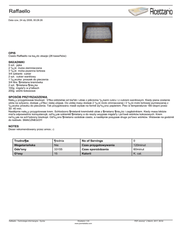 Raffaello Data czw, 24 sty 2008, 00:26:26 OPIS Ciasto Raffaello na ka¿d± okazje (26 kawa³ków) SK£ADNIKI 5 szt. jajka 2 ³y¿ki m±ka ziemniaczana 3 ³y¿ki m±ka pszenna tortowa 3/4 szklanki cukier 2 szt. cukier waniliowy 1 ³y¿eczka proszek do pieczenia 3/4 litra ¶mietana kremówka 2 szt. ¶mietana ¶nie¿ka 100g migda³y w p³atkach 200g wiórki kokosowe SPOSÓB PRZYRZADZENIA Nale¿y przygotowaæ biszkopt. ¯ó³tka oddzieliæ od bia³ek i ubiæ z piêcioma ³y¿kami cukru i z cukrem waniliowym. Kiedy piana zostanie ubita na sztywno, dodaæ ¿ó³tka i dalej ubijaæ. Do ubitej masy dodaæ 2 ³y¿ki m±ki zimniaczanej i 3 ³y¿ki m±ki tortowej wymieszanej z ³y¿eczk± proszku do pieczenia. Tak przygotowan± masê wylaæ na formê wy³o¿on± papierem. Piec w temperaturze 180 stopni przez 30- 40 min. Nastêpnie nale¿y przygotowaæ krem. Schlodzon± ¶mietanê kremówkê ubiæ z ¶mietan± ¶nie¿k± i zagêstnikiem. Kiedy masa bêdzie mia³a odpowiedni± konsystencjê, od³o¿yæ szklankê ¶mietany a do reszty wsypaæ migda³y i po³owê wiórków kokosowych. Krem na³o¿yæ na sch³odzony biszkopt. Od³o¿on± ¶mietan± ozdobiæ ciasto, a nastêpnie posypaæ drug± po³ow± wiórków. Wstawiæ na godzinê do lodówki. SMACZNEGO!!! NOTES Deser rekomendowany przez amos ;-) Trudno¶æ ¶rednia No of Servings 0 Wegetariañska Nie Czas przygotowywania 120minut Ods³ony 33155 Czas sporz±dzania 60minut G³osy 15 Kalorii K. cal. Raffaello - Technologia Informacyjna - Syców Ricettario 1.03 www.joomlaitalia.com PDF utworzy³ 2 March, 2017, 06:54