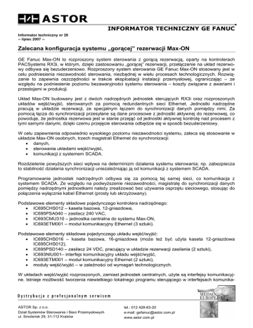 INFORMATOR TECHNICZNY GE FANUC Informator techniczny nr 28 -- lipiec 2007 -- Zalecana konfiguracja systemu „gorącej” rezerwacji Max-ON GE Fanuc Max-ON to rozproszony system sterowania z gorącą rezerwacją, oparty na kontrolerach PACSystems RX3i, w którym, dzięki zastosowaniu „gorącej” rezerwacji, przełączenie na układ rezerwowy odbywa się bezuderzeniowo. Rozproszony system sterowania GE Fanuc Max-ON stosowany jest w celu podniesienia niezawodność sterowania, niezbędnej w wielu procesach technologicznych. Rozwiązanie to zapewnia oszczędności w trakcie eksploatacji instalacji przemysłowej, ograniczając – ze względu na podniesienie poziomu bezawaryjności systemu sterowania – koszty związane z awariami i przestojami w produkcji. Układ Max-ON budowany jest z dwóch nadrzędnych jednostek sterujących RX3i oraz rozproszonych układów wejść/wyjść, sterowanych za pomocą redundantnych sieci Ethernet. Jednostki nadrzędne pracują w układzie rezerwacji, ze specjalnym łączem do synchronizacji danych pomiędzy nimi. Za pomocą łącza do synchronizacji przesyłane są dane procesowe z jednostki aktywnej do rezerwowej, co powoduje, że jednostka rezerwowa jest w stanie przejąć od jednostki aktywnej kontrolę nad procesem z tymi samymi danymi, dzięki czemu przejęcie sterowania odbędzie się w sposób bezuderzeniowy. W celu zapewnienia odpowiednio wysokiego poziomu niezawodności systemu, zaleca się stosowanie w układzie Max-ON osobnych, trzech magistrali Ethernet do synchronizacji: • danych, • sterowania układami wejść/wyjść, • komunikacji z systemem SCADA. Rozdzielenie powyższych sieci wpływa na determinizm działania systemu sterowania; np. zabezpiecza to stabilność działania synchronizacji uniezależniając ją od komunikacji z systemem SCADA. Programowanie jednostek nadrzędnych odbywa się za pomocą tej samej sieci, co komunikacja z systemem SCADA. Ze względu na podwyższenie niezawodności, magistralę do synchronizacji danych pomiędzy nadrzędnymi jednostkami należy zrealizować bez używania osprzętu sieciowego, stosując do połączenia wyłącznie kabel Ethernet (prosty lub skrzyżowany). Podstawowe elementy składowe pojedynczego kontrolera nadrzędnego: • IC695CHS012 – kaseta bazowa, 12-gniazdowa, • IC695PSA040 – zasilacz 240 VAC, • IC693CMU310 – jednostka centralna do systemu Max-ON, • IC693ETM001 – moduł komunikacyjny Ethernet (3 sztuki). Podstawowe elementy składowe pojedynczego układu wejść/wyjść: • IC695CHS016 – kaseta bazowa, 16-gniazdowa (może też być użyta kaseta 12-gniazdowa IC695CHS012), • IC695PSD140 – zasilacz 24 VDC, pracujący w układzie rezerwacji zasilania (2 sztuki), • IC693NIU001– interfejs komunikacyjny układu wejść/wyjść, • IC693ETM001 – moduł komunikacyjny Ethernet (2 sztuki), • moduły wejść/wyjść – w zależności od wymagań technologicznych. W układach wejść/wyjść rozproszonych, zamiast jednostek centralnych, użyte są interfejsy komunikacyjne. Istnieje możliwość tworzenia niewielkiego lokalnego programu sterującego w interfejsach komunika- ASTOR Sp. z o.o. Dział Systemów Sterowania i Sieci Przemysłowych ul. Smoleńsk 29, 31-112 Kraków tel.: 012 428-63-20 e-mail: [email protected] www.astor.com.pl cyjnych, realizującego procedury awaryjne, można również do interfejsów dołączać lokalnie urządzenia w sieciach komunikacyjnych Profibus DP, RS232/485 z protokołem Modbus RTU Master/Slave oraz Serial I/O. Aby dodatkowo zwiększyć niezawodność, stosuje się dwie magistrale do sterowania układami wejść/wyjść. Dlatego w układach wejść/wyjść zainstalowane są po dwa moduły Ethernet, z których pierwszy dołączony jest do pierwszej jednostki nadrzędnej, a drugi moduł Ethernet – do drugiej jednostki nadrzędnej. Dzięki takiej konfiguracji, uszkodzenie dowolnej magistrali nie spowoduje zatrzymania pracy systemu sterowania. Magistrale sterujące powinny być prowadzone różnymi trasami kablowymi, aby zminimalizować możliwość jednoczesnego uszkodzenia obu magistral. Do połączenia układu Max-ON z systemem wizualizacji wykorzystuje się fakt posiadania przez moduły Ethernet (IC695ETM001) dwóch portów. Obydwa porty posiadają ten sam adres IP (są z sobą połączone wbudowanym wewnętrznym niezarządzalnym switchem). Każdy z serwerów ma bezpośrednie połączenia kablowe z jednostką aktywną oraz z jednostką rezerwową. Kolejną zalecaną rezerwacją w układzie Max-ON jest rezerwacja zasilaczy w kasetach zawierających moduły wejść/wyjść, uzyskana dzięki zastosowaniu zasilaczy IC695PSD140. W jednej kasecie powinny być zainstalowane co najmniej 2 takie zasilacze. Ilość zasilaczy IC695PSD140 obecnych w jednej kasecie zależna jest od zapotrzebowania na moc modułów zainstalowanych w tej kasecie. Prawidłowo skonfigurowany system pod kątem mocy powinien gwarantować dalszą pracę po wyłączeniu lub uszkodzeniu jednego zasilacza. Sprawdzenia zapotrzebowania na moc kasety w konkretnej konfiguracji można dokonać samemu, przy pomocy oprogramowania Proficy Machine Edition lub kontaktując się z firmą ASTOR. Zastosowanie wielu zasilaczy w jednej kasecie daje również rezerwację źródeł zasilania, przez co awaria jednego źródła zasilania nie zatrzyma pracy systemu sterowania. Zamiast zasilaczy IC695PSD140 można stosować zasilacze IC695PSA140, jednakże IC695PSD140 są preferowane ze względu na mniejsze rozmiary (zasilacz IC695PSD140 zajmuje tylko jedno gniazdo w kasecie). Zasilacze IC695PSD140 zasilane są z napięcia 24VDC. System Max-ON umożliwia skonfigurowanie trybu pracy kontrolerów nadrzędnych. Kontrolery mogą zostać skonfigurowane jako równouprawnione bądź też jeden z nich może zostać wyróżniony. Konfiguracji tej dokonuje się programowo i nie jest konieczne stosowanie żadnego dodatkowego osprzętu dla korzystania z tej funkcjonalności. Kasety zawierające wej