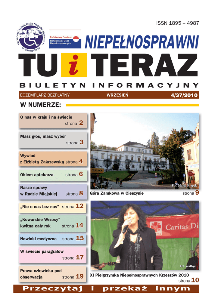 ISSN 1895 – 4987 NIEPEŁNOSPRAWNI TU i TERAZ B I U L E T Y N I N F O R M A C Y J N Y WRZESIEŃ EGZEMPLARZ BEZPŁATNY 4/37/2010 W NUMERZE: O nas w kraju i na świecie strona Masz głos, masz wybór 2 strona 3 Wywiad z Elżbietą Zakrzewską strona 4 Okiem aptekarza 6 Nasze sprawy w Radzie Miejskiej strona Fot. Marta Klepek strona 8 „Nic o nas bez nas” strona 12 „Kowarskie Wrzosy” kwitną cały rok strona 14 Nowinki medyczne strona 15 W świecie paragrafów strona 17 Prawa człowieka pod obserwacją strona Góra Zamkowa w Cieszynie strona 9 Fot. F Fot Fo ot. t. jjus justbye ustb tbye bye Fot. justbye 19 Przeczytaj XI Pielgrzymka Niepełnosprawnych Krzeszów 2010 strona 10 i przekaż innym O NAS W KRAJU I NA ŚWIECIE BEZ RĄK I NÓG PRZEZ KANAŁ LA MANCHE z niepełnosprawnością. Dojazd dla nich opłacany jest z ministerialnej dotacji. Ponadto studenci mogą tutaj korzystać ze specjalnie wyposażonych laboratoriów, a uniwersyteckie Centrum Adaptacji Materiałów Dydaktycznych dla Niewidomych przygotowuje, wykorzystując alfabet Braille’a, elektroniczne adaptacje podręczników oraz udźwiękowioną grafikę dotykową. 42-letni Francuz Philippe Croizon, który stracił ręce i nogi w wyniku amputacji po porażeniu prądem w 1994 roku, przepłynął kanał La Manche. O pokonaniu kanału myślał jeszcze leżąc w szpitalnym łóżku. Spełnił swoje marzenie po 16 latach. Wystartował z angielskiego Folkestone i późnym wieczorem dopłynął do francuskiego brzegu PODWÓJNE SALTO NA WÓZKU! w okolicach Calais. Zajęło mu to 13,5 godziny – Amerykanin Aaron Fotheringham jako pierwo 2,5 mniej niż przewidywał. Przepłynięcie umoż- szy na świecie wykonał podwójne salto w tył na liwiły mu specjalne protezy u nóg, zakończone wózku inwalidzkim. płetwami. Dziewiętnastolatek, który od urodzenia cierpi na rozszczep kręgosłupa, usiadł na wózek w wiePODWOŻĄ NA ZAJĘCIA ku 3 lat. Gdy miał 8, zaczął chodzić do skate parku Choć o wyborze studiów często decyduje re- ze swoim starszym bratem, który uprawiał ewonoma uczelni, wiele z nich wciąż pozostaje nie- lucje na rowerze BMX. Aaron dołączył do niego dostępnych dla studentów z niepełnosprawnością. i rozpoczął naukę skoków i ewolucji na wózku. W wielopiętrowych budynkach brakuje wind W wieku 14 lat wykonał pierwsze salto. i dostosowanych toalet, a dotarcie na zajęcia do kampusu sprawia trudności. Coraz więcej uczelni JĘZYK MIGOWY PRZEZ KOMÓRKĘ dostrzega problem i podejmuje działania, mające Pomimo że komórki są wyposażone w kamery na celu ułatwienie dostępu do sal wykładowych i duże ekrany, transmisja na żywo obrazu wideo osobom niepełnosprawnym ruchowo. o wysokiej rozdzielczości jest często niemożliwa Lubelski Uniwersytet Marii Curie-Skłodow- ze względu na niską transmisję danych. W opraskiej, gdzie jest 484 niepełnosprawnych studen- cowanym przez naukowców z Waszyngtonu systów, planuje uruchomienie bezpłatnego transportu temie MobileASL, specjalne oprogramowanie z miejsca zamieszkania na zajęcia i z powrotem. rozpoznaje pole obrazu, w którym użytkownik Inne pomysły uczelni to Dni Adaptacyjne oraz zi- telefonu pokazuje znaki migowe i zachowuje domowy obóz sportowy, który poprowadzą zawod- brą jakość tej części kosztem reszty. System może nicy z kadry paraolimpijskiej. działać na dowolnym telefonie, który jest wyposaBezpłatne busy funkcjonują już na Katolickim żony w ekran i kamerę po tej samej stronie. Uniwersytecie Lubelskim, gdzie studiuje 476 osób Opracował gel NIEPEŁNOSPRAWNI TU i TERAZ B I U L E T Y N I N F O R M A C Y J N Y DOFINANSOWANY ZE ŚŚRODKÓW PFRON DOFINANSO Wydawca: Karkonoski Sejmik Osób Niepełnosprawnych Koordynator Projektu: Krystyna Ogrodnik-Turakiewicz Partner: Stowarzyszenie „Działajmy Razem” – TRIANON PL Redaktor naczelna: Justyna Bytnar, stale współpracują Andrzej Grzelak, Agnieszka Baszczyńska, Krystyna Susabowska, Stanisław Stryjewski. Adres wydawcy i redakcji: 58-500 Jelenia Góra, ul. Grabowskiego 7, tel.: 75 75 242 54, tel./fax 75 75 231 83, e-mail: [email protected] • www.kson.pl Skład i druk: NYC SERWIS, 58-500 Jelenia Góra, ul. Wojska Polskiego 13, tel. 75 75 25 663 Nakład 2500 egz. Redakcja nie zwraca materiałów nie zamówionych oraz zastrzega sobie prawo do skracania i redakcyjnego opracowania materiałów przyjętych do druku. 2 TU i TERAZ Biuro Porad Obywatelskich pomaga i edukuje Biuro zostało utworzone w 2005 r. przez Stowarzyszenie Ośrodek Edukacji Makrobiotycznej dzięki pracy społecznej członków stowarzyszenia i wolontariuszy oraz pomocy sponsorów, którzy umożliwili remont i wyposażenie wynajmowanego od gminy lokalu. Biuro Porad Obywatelskich (BPO) mieści się w Jeleniej Górze przy ul. Złotniczej 8/1. Zajmuje się udzielaniem bezpłatnych porad w sprawach mieszkaniowych, rodzinnych, świadczeń socjalnych, świadczeń z ubezpieczenia społecznego, zatrudnienia i bezrobocia mieszkańcom Jeleniej Góry i powiatu. Działa w oparciu o środki własne (składki członkowskie), ale przede wszystkim dzięki grantom uzyskiwanym w drodze W Polsce działa obecnie 38 Biur funkcjonujących według jednakowych standardów. W Województwie Dolnośląskim działają trzy biura tego typu: we Wrocławiu, Jeleniej Górze i Wałbrzychu. Ideą Związku Biur Porad Obywatelskich jest, aby w każdym powiecie działało BPO oraz sieć Punktów Poradnictwa Obywatelskiego. W Polsce stowarzyszenia prowadzące Biura muszą uzyskiwać Fot. justbye środki na działalność w drodze konkursów z fundacji krajowych konkursów, a np. w Anglii są włączone w państwową sieć pomocy i samorządu. Stowarzyszenie osobom niezamożnym, co daje im Ośrodek Edukacji Makrobiotyczstabilność i możliwość rozwoju. nej jest członkiem Związku Biur Porad Obywatelskich w WarszaDanuta Rybicka-Jakubiec wie, należącego do ogólnoświaPrezes Stowarzyszenia towej sieci The National AssociaOśrodek Edukacji Ma