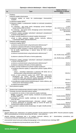 Operacje w obrocie dewizowym – klienci indywidualni Tytuł Lp. 1. 2. Przekazy. Polecenia wypłaty otrzymywane: 1) polecenia wypłaty na kwoty nie przekraczające równowartości ) 10 EUR* , 1) 2) polecenia wypłaty SEPA , 3) polecenia wypłaty z przekazaniem środków na rachunek prowadzony w SK banku: a) z instrukcją – gdy koszty banku zlecającego ponosi beneficjent (opcja kosztowa BEN lub SHA), b) z instrukcją – gdy koszty banku zlecającego ponosi zleceniodawca (opcja kosztowa OUR), 4) Polecenia wypłaty pomiędzy rachunkami walutowymi prowadzonymi 2) w ramach Grupy BPS S.A. , 5) Opłaty i prowizje dodatkowe do poleceń wypłaty otrzymanych: a) brak w treści polecenia wypłaty numeru rachunku odbiorcy w standardzie IBAN ( płatność NON-STP). Polecenia wypłaty wysyłane: 1) 1) polecenia wypłaty SEPA , ) a) złożone za pośrednictwem usług bankowości elektronicznej** , b) złożone w placówce SK banku w formie papierowej, 2) polecenia wypłaty wysyłane w walucie obcej do innego banku w kraju lub do banku zagranicznego w walucie obcej lub PLN w trybie standardowym: ) a) złożone za pośrednictwem usług bankowości elektronicznej** , b) złożone w placówce SK banku w formie papierowej. 3. 4. 5. 6. 3) Polecenia wypłaty pomiędzy rachunkami walutowymi prowadzonymi 2) w ramach Grupy BPS S.A. : ) a) złożone za pośrednictwem usług bankowości elektronicznej** , b) złożone w placówce SK banku w formie papierowej. 4) Opłaty i prowizje dodatkowe do poleceń wypłaty wysyłanych: a) wysyłanie polecenia wypłaty (z wyłączeniem poleceń wypłaty SEPA) w trybie: pilnym – transakcja realizowana w placówce SK banku lub za pośrednictwem usług bankowości elektronicznej, b) brak w treści polecenia wypłaty kodu SWIFT (BIC code) banku beneficjenta lub numeru rachunku bankowego beneficjenta w strukturze IBAN, gdy polecenie wypłaty kierowane jest do kraju, w którym ten standard obowiązuje (płatność NON-STP, c) zryczałtowana opłata banków pośredniczących i banku odbiorcy, gdy koszty ponosi zleceniodawca (OUR), d) nadanie komunikatu SWIFT. Zwrot polecenia wypłaty. Wydanie kopii zrealizowanego polecenia wypłaty ( komunikatu SWIFT). Pozostałe czynności dotyczące poleceń wypłaty: 1) uzupełnienie lub zmiany w treści polecenia wypłaty wysłanego, Uwaga: w przypadku poleceń wypłaty, niezależnie od prowizji pobiera się opłatę SWIFT-ową. 2) anulowanie polecenia wypłaty wysłanego lub odzyskanie środków przez SK bank, 3) czynności wyjaśniające/reklamacyjne dotyczące poleceń wypłaty w obrocie dewizowym (w przypadku błędu po stronie SK banku lub korespondenta opłaty nie pobiera się). Inne czynności w zakresie obrotu dewizowego, nie ujęte w taryfie prowizji i opłat. Opłata w PLN lub równowartość w walucie obcej 5,00 zł 15,00 zł 0,10% min. 20,00 zł max. 100,00 zł wg odrębnej taryfy dla banków 10,00 zł 30,00 zł 12,00 zł 15,00 zł 0,20% min. 40,00 zł max. 250,00 zł 0,30% min. 50,00 zł max. 300,00 zł 16,00 zł 20,00 zł 120,00 zł 50,00 zł 100,00 zł 15,00 zł 0,15% min. 40,00 zł max. 100,00 zł 10,00 zł 50,00 zł + koszty banków trzecich 50,00 zł + koszty banków trzecich 50,00 zł + koszty banków trzecich wg umowy min.50,00 zł Wyjaśnienia: 1) zlecenie płatnicze jest realizowane o ile spełnia wszystkie warunki polecenia wypłaty SEPA. Warunki polecenia wypłaty SEPA są przedstawione na stronie internetowej SK banku – www.skbank.pl. 2) zlecenie płatnicze realizowane jest o ile zarówno rachunek odbiorcy, jak i zleceniodawcy prowadzony jest w Zrzeszonych Bankach Spółdzielczych lub Banku BPS S.A. ) równowartość kwoty liczona jest według obowiązującego w dniu rozliczenia kursu średniego NBP. * ) ** w momencie udostępnienia tej funkcjonalności przez SK bank.