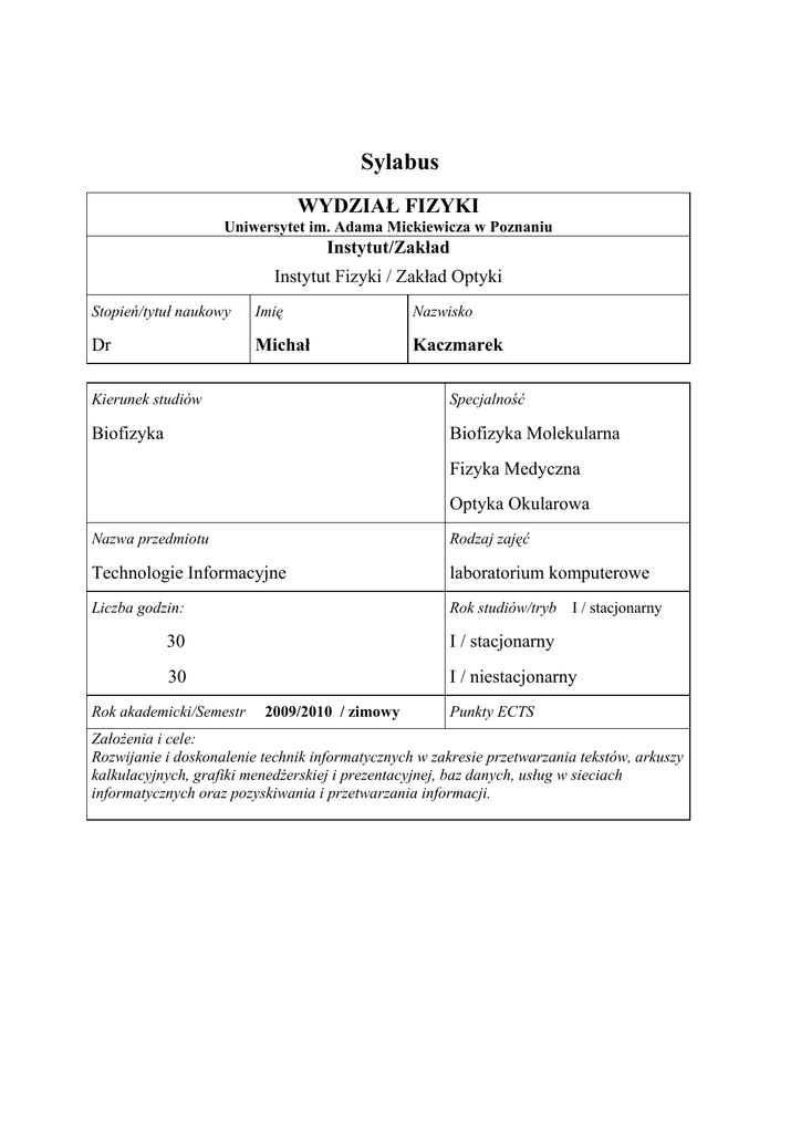 Sylabus WYDZIAŁ FIZYKI Uniwersytet im. Adama Mickiewicza w Poznaniu Instytut/Zakład Instytut Fizyki / Zakład Optyki Stopień/tytuł naukowy Imię Nazwisko Dr Michał Kaczmarek Kierunek studiów Specjalność Biofizyka Biofizyka Molekularna Fizyka Medyczna Optyka Okularowa Nazwa przedmiotu Rodzaj zajęć Technologie Informacyjne laboratorium komputerowe Liczba godzin: Rok studiów/tryb I / stacjonarny 30 I / stacjonarny 30 I / niestacjonarny Rok akademicki/Semestr 2009/2010 / zimowy Punkty ECTS Założenia i cele: Rozwijanie i doskonalenie technik informatycznych w zakresie przetwarzania tekstów, arkuszy kalkulacyjnych, grafiki menedżerskiej i prezentacyjnej, baz danych, usług w sieciach informatycznych oraz pozyskiwania i przetwarzania informacji. Szczegółowa tematyka zajęć 1. Podstawy technik informatycznych. / 10 % 2. Środowisko systemowe na przykładzie MsWindows: praca z ikonami, praca z oknami, zarządzanie plikami i katalogami. / 10 % 3. Przetwarzanie tekstów (praca z edytorem Microsoft Word): otwieranie, zapisywanie i zamykanie dokumentu, korzystanie z pasków narzędzi, dodawanie i usuwanie elementów pasków narzędzi, formatowanie tekstu, wykorzystanie narzędzi do rysowania, praca z tabelami, korzystanie z edytora równań, wykorzystanie poznanych elementów Worda do tworzenia tekstu naukowego, tworzenie hiperłączy. / 20% 4. Grafika menedżerska i prezentacyjna (praca z aplikacją Microsoft PowerPoint): tworzenie pojedyńczego slajdu, umieszczanie tekstu i jego formatowanie, kopiowanie, przenoszenie i usuwanie slajdu, obrazy i rysunki w slajdach, umieszczanie wykresów i diagramów, wprowadzanie efektu animacji do tekstu, rysunków i obrazów, przygotowanie pokazu slajdów. / 20% 5. Arkusz kalkulacyjny Microsoft Excel: formatowanie komórek, kopiowanie, przenoszenie, usuwanie, automatyczne wypełnianie komórek danymi, tworzenie formuł, zastosowanie funkcji do rozwiązywania problemów, tworzenie wykresów. / 25% 6. Bazy danych (praca z aplikacją Microsoft Access); tworzenie i zapisywanie tabeli, dodawanie i usuwanie rekordów z tabeli, definiowanie kluczy, relacje między tabelami, praca z formularzami, tworzenie kwerend. / 15% 7. Usługi w sieciach informatycznych: praca z przeglądarką internetową, wyszukiwanie informacji, projektowanie stron WWW (praca z aplikacją FrontPage), korzystanie z poczty elektronicznej. / 10% Sposób oceniania (wymagania) Udział w ocenie końcowej ocena ciągła (bieżące przygotowanie do zajęć i aktywność) 20% śródsemestralne kolokwia pisemne/ustne końcowe zaliczenie pisemne/ustne 70% egzamin pisemny egzamin ustny kontrola obecności 10% praca końcowa semestralna/roczna inne: Literatura podstawowa 1. 2. 3. 4. 5. 6. 7. Michael Miller, „ABC komputera i internetu“, Helion, 2002. M.Halvorson, „Podręcznik Microsoft Office 2000 Professional”, Read Me,1999. Aleksandra Kula, „ABC Word 2003 PL”, Helion, 2004. Tom Negrino, „PowerPoint-tworzenie prezentacji”, Helion, 2005. Matthew Mac Donald, „Excel”, Helion, 2005. Tomasz Nabiałek, „ABC…Accesa”, Kraków 1999. Matthew Mac Donald, „Tworzenie stron WWW”, Helion, 2006. Literatura rozszerzona 1. Steve Schwartz, „Acces 2003 PL”, Helion, 2004. 2. Joel Sklar, „Zasady tworzenia stron WWW”, Wydawnictwo RM, 2000. 3. Nat McBride, „FrontPage 2000 to proste”, Wydawnictwo RM, 2000. 4. „Wielka Księga Wskazówek”, Komputer Świat, 4 (2005).