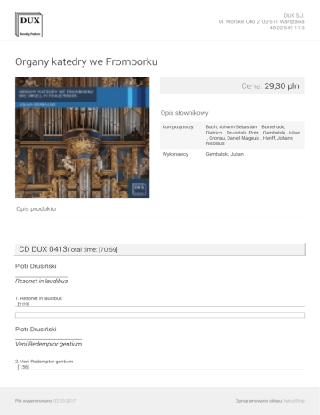 DUX S.J. Ul. Morskie Oko 2, 02-511 Warszawa +48 22 849 11 3 Organy katedry we Fromborku Cena: 29,30 pln Opis słownikowy Kompozytorzy Bach, Johann Sebastian ∎, Buxtehude, Dietrich ∎, Drusiński, Piotr ∎, Gembalski, Julian ∎, Gronau, Daniel Magnus ∎, Hanff, Johann Nicolaus ∎ Wykonawcy Gembalski, Julian ∎ Opis produktu CD DUX 0413Total time: [70:59] Piotr Drusiński Resonet in laudibus 1. Resonet in laudibus [2:03] Piotr Drusiński Veni Redemptor gentium 2. Veni Redemptor gentium [1:56] Plik wygenerowano: 02-03-2017 Oprogramowanie sklepu: AptusShop DUX S.J. Ul. Morskie Oko 2, 02-511 Warszawa +48 22 849 11 3 Dietrich Buxtehude Preludium i fuga in E 3. Praeludium et Fuga in e [8:21] Dietrich Buxtehude Es ist das Heil uns kommen her 4. „Es ist das Heil uns kommen her“ [2:40] Daniel Magnus Gronau Wariacje na temat Ein feste Burg 5. Wariacje na temat pieśni / Variations on a theme „Ein feste Burg“ Chorale in contrapunto doppio [6:11] 6. Variatio prima [1:41] 7. Variatio seconda [1:47] 8. Variatio terza [1:44] 9. Variatio quarta [2:36] Johann Nicolaus Hanff Auf meinen lieben Gott Plik wygenerowano: 02-03-2017 Oprogramowanie sklepu: AptusShop DUX S.J. Ul. Morskie Oko 2, 02-511 Warszawa +48 22 849 11 3 10. Johann Nicolaus Hanff (1665-1712) „Auf meinen lieben Gott“ [1:29] Johann Sebastian Bach Toccata E-dur BWV 566 11. Johann Sebastian Bach (1685-1750) Toccata E-dur / Toccata in E major BWV 566 [10:41] Julian Gembalski Improwizacja I: Fantazja romantyczna na temat pieśni „Z dawna Polski...“ 12. Improwizacja I: Fantazja romantyczna na temat pieśni „Z dawna Polski...“ Improvisation I: Romantic Fantasy on a theme „Queen of Poland for Ages Past“ [7:09] Julian Gembalski Suita improvisata Katedra XXXVI 13. Chorał / Chorale [5:37] 14. Witraże / Stained Glass [4:55] 15. Epitafium Kopernika / Copernicus’ Epitaph [3:36] 16. Modlitwa wieczorna / Evening Prayer [3:53] 17. Pieśń pochwalna / Song of Praise [4:37] Wykonawcy: Julian Gembalski /organy/ Plik wygenerowano: 02-03-2017 Powered by TCPDF (www.tcpdf.org) Oprogramowanie sklepu: AptusShop