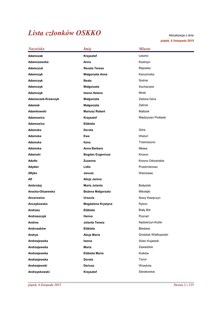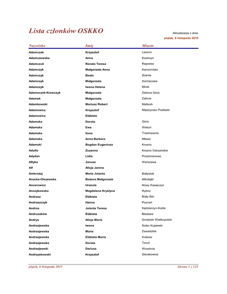 Lista członków OSKKO Aktualizacja z dnia : piątek, 6 listopada 2015 Nazwisko Imię Miasto Adamczak Krzysztof Leszno Adamczewska Anna Kostrzyn Adamczuk Renata Teresa Rejowiec Adamczyk Małgorzata Anna Karczmiska Adamczyk Beata Sośnie Adamczyk Małgorzata Sochaczew Adamczyk Iwona Helena Mirsk Adameczek-Krawczyk Małgorzata Zielona Góra Adamek Małgorzata Zabrze Adamkowski Mariusz Robert Malbork Adamowicz Krzysztof Międzyrzec Podlaski Adamowicz Elżbieta Adamska Dorota Góra Adamska Ewa Wieluń Adamska Ilona Trzemeszno Adamska Anna Barbara Mława Adamski Bogdan Eugeniusz Krosno Adułło Zuzanna Krosno Odrzańskie Adydan Lidia Przeźmierowo Aftyka Janusz Warszawa Alf Alicja Janina Ambrożej Maria Jolanta Białystok Anacka-Olszewska Bożena Małgorzata Mikołajki Ancerowicz Urszula Nowy Kawęczyn Anczykowska Magdalena Krystyna Rybno Andrasz Elżbieta Biały Bór Andraszczyk Hanna Poznań Andros Jolanta Teresa Kędzierzyn-Koźle Andruszków Elżbieta Bledzew Andrys Alicja Maria Grodzisk Wielkopolski Andrzejewska Iwona Solec Kujawski Andrzejewska Maria Zawadzkie Andrzejewska Elżbieta Maria Kraków Andrzejewska Dorota Toruń Andrzejewski Dariusz Września Andrzyskowski Krzysztof Sierakowice piątek, 6 listopada 2015 Strona 1 z 125 Nazwisko Imię Miasto Anklewicz Krzysztof Piotr Świdnica Antman Artur Piotr Kobierzyce Antol Mariusz Jan Radzyń Podlaski Antolak Wincenty Czarny Dunajec Antoniewicz Mirosława Świecie Antoniszewska Ewa Sztum Antończyk Anna Mizerów Antosiak Monika Łódź Antoszkiewicz Piotr Olsztyn Aparta Lidia Łódź Aranowska-Ptaszek Beata Warszawa Archacka Jolanta Krystyna Szczytno Arcimowicz Anna Małgorzata Kalisz Pomorski Arciszewska Krystyna Oleśnica Arciszewski Włodzimierz Lublin Arent Regina Łebcz Artecka Barbara Biała Podlaska August Renata Aleksandra Podgórzyn Augustak Halina Lublin Augustyn Małgorzata Anna Brzeg Augustyniak-Brągiel Elżbieta Jolanta Częstochowa Augustynik Agnieszka Renata Somianka Axmann-Fabia Dorota Duszniki Zdrój Babańca Agnieszka Renata Garbatka-Letnisko Babarowski Waldemar Sieniawka Babczyńska Alina Będzin Babiarz Józef Cmolas 269a Babiuch Małgorzata Bożena Olkusz Babska Grażyna Teresa Grabica Bachoński Piotr Zielona Góra Bachowska Renata Józefa Wieliczka Badeńska Beata Ewa Radom Badocha Piotr Gliwice Badowska Małgorzata Police Baeck-Kamińska Katarzyna Jelenia Góra Bagińska-Jóźwiak Jolanta Bagińska-Rogowska Bożena Łomża Bagińska-Żyta Agata Edyta Głogów Bajdur Małgorzata Częstochowa piątek, 6 listopada 2015 Strona 2 z 125 Nazwisko Imię Miasto Bajena Alfred Siemiatycze Bajor Anna Łęka Opatowska Bajor Dorota Elbląg Bajorek Jan Leszek Olsztyn Bajorek-Bieś Klementyna Tylicz Bajorska Jolanta Kobylnica Bajorska Stanisława Kazimiera Rzeszów Bajsarowicz Grażyna Dzierżoniów Bakalarski Jacek Marek Międzybrodzie Bialskie Bakowski Jerzy Paweł Katowice Balawejder Maria Teresa Rzeszów Balcerek-Kałek Anna Mosina Balcerzak Piotr Kępno Balicki Krzysztof Stanisław Szczecin Balonek Stanisława Zator Bałos Urszula Maria Juszczyn Bałucińska Barbara Weronika Wiślinka Bałuka Krzysztof Roman Tyszowce Bałuszyńska Elżbieta Izabella Kraków Banasiak-Wiśniewska Agnieszka Janów Banasińska Jolanta Olkusz Banaszak Alina Chocz Banaszek Jacek Wieliszew Banaszkiewicz Jolanta Słupsk Banaszkiewicz Halina Maria Pszczew Banaszkiewicz Hieronim Gębice Banaś Mariola Nowa Sól Bandoła Barbara Elżbieta Wola Baniak Henryk Marek Szydłowiec Bantle Marek Edward Sulechów Bany Henryka Ryki Bańkowska Eligia Marta Olecko Bańkowska Alicja Czyżew Bar Mirosław Przemyśl Baracz Anna Elżbieta Puławy Baran Bogusława Bochnia Baran Tadeusz Kazimierz Przemyśl Baran Aniceta Lesko Baran Aleksandra Kazimiera Świętochłowice piątek, 6 listopada 2015 Strona 3 z 125 Nazwisko Imię Baran Mariusz Baran Emilia Ostrów Wielkopolski Baran Jarosław Tadeusz Grabica Baran-Mazurkiewicz Jadwiga Jarosław Baranowicz Alina Głogów Baranowska Marzena Małgorzata Świnoujście Baranowska Magdalena Bydgoszcz Barańska Beata Łetownia Barańska Małgorzata Beata Psary Barańska-Sorn Mirella Będzin Barański Ireneusz Grabów Barasiński Jacek Marek Barcikowska Małgorzata Ostrołęka Bardzik Marzena Boguchwała Bargieł Małgorzata Dorota Dąbrowa Górnicza Barnowska Małgorzata Dąbrowa Górnicza Barszcz-Skowronek Jolanta Nałęczów Barsznica Jan Iwonicz-Zdrój Bartczak Jolanta Gościcino Bartkiewicz Anna Irena Bartkiewicz Robert Adam Radom Bartkowiak Paulina Magdalena Rawicz Bartkowicz Ewa Rzeszów Bartlewicz Joanna Łódź Bartnicka Urszula Mińsk Mazowiecki Bartnicki Paweł Studno Bartnikowska Ewa Wałbrzych Bartos Wiesława Władysława Malechowo Bartosik Grażyna Katowice Bartosik Anna Maria Żelazków Bartosik Bożena Łódź Bartos-Piątkowska Małgorzata Maszewo Duże Bartoszek Joanna Agnieszka Paniówki Bartoszewska Wioletta Małgorzata Koszalin Bartoszewski Jarosław Piotr Tczew Barwacz Andrzej Adam Lisia Góra Barylska Elżbieta Sosnowiec Bas Włodzimierz Stargard Szczeciński Basaj Jolanta Anita Radom piątek, 6 listopada 2015 Miasto Strona 4 z 125 Nazwisko Imię Miasto Batyra Mariusz Opole Lubelskie Bazak Zofia Warszawa Bazydło Arkadiusz Marian Kowala Bączyńska Lilianna Żagań Bąk Beata Małgorzata Niedrzwica Duża Bąk Anna Rogalin Bąk Jolanta Ewa Oświęcim Bąk Monika Joanna Wiązowna Becela Leszek Antoni Nowogard Bednarczyk Elżbieta Korczyna Bednarczyk Renata Teresa Józefów Bednarek Stanisław Marek Blizanów Bednarkiewicz Bogusława Warszawa Bednarska-Bajer Monika Sosnowiec Bednarska-Wnuk Izabela Łódź Bednarski Mirosław Warszawa Bednarski Artur Łaszczów Bednarz Monika Biłgoraj Bednarz Jolanta Teresa Gdańsk Bedner Jolanta Bek Bogusław Michał Radom Bekisz Irena Szczecinek Belgrau Józef Żukowo Belniak Jacek Wiktor Suchowola Bełza Agata Maria Cieszków Bem Dorota Bożena Sosnowiec Bembnowicz Ewa Barbara Kożuchów Bereta Katarzyna Magdalena Kluczbork Berg Mariola Wałbrzych Berlińska Bożena Śniadowo