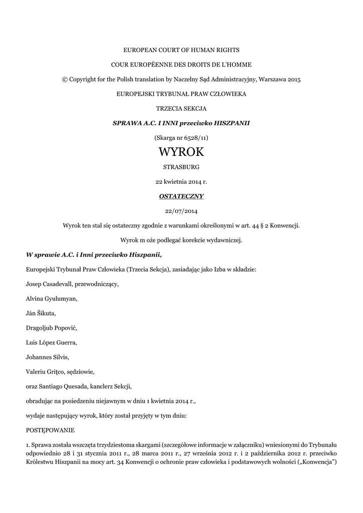 EUROPEAN COURT OF HUMAN RIGHTS COUR EUROPÉENNE DES DROITS DE L’HOMME © Copyright for the Polish translation by Naczelny Sąd Administracyjny, Warszawa 2015 EUROPEJSKI TRYBUNAŁ PRAW CZŁOWIEKA TRZECIA SEKCJA SPRAWA A.C. I INNI przeciwko HISZPANII (Skarga nr 6528/11) WYROK STRASBURG 22 kwietnia 2014 r. OSTATECZNY 22/07/2014 Wyrok ten stał się ostateczny zgodnie z warunkami określonymi w art. 44 § 2 Konwencji. Wyrok m oże podlegać korekcie wydawniczej. W sprawie A.C. i Inni przeciwko Hiszpanii, Europejski Trybunał Praw Człowieka (Trzecia Sekcja), zasiadając jako Izba w składzie: Josep Casadevall, przewodniczący, Alvina Gyulumyan, Ján Šikuta, Dragoljub Popović, Luis López Guerra, Johannes Silvis, Valeriu Griţco, sędziowie, oraz Santiago Quesada, kanclerz Sekcji, obradując na posiedzeniu niejawnym w dniu 1 kwietnia 2014 r., wydaje następujący wyrok, który został przyjęty w tym dniu: POSTĘPOWANIE 1. Sprawa została wszczęta trzydziestoma skargami (szczegółowe informacje w załączniku) wniesionymi do Trybunału odpowiednio 28 i 31 stycznia 2011 r., 28 marca 2011 r., 27 września 2012 r. i 2 października 2012 r. przeciwko Królestwu Hiszpanii na mocy art. 34 Konwencji o ochronie praw człowieka i podstawowych wolności („Konwencja”) przez trzydzieści osób pochodzenia saharyjskiego („skarżący”). Przewodniczący Sekcji podjął decyzję o nieujawnianiu tożsamości skarżących (art. 47 § 3 Regulaminu Trybunału). 2. Skarżących reprezentowali odpowiednio (szczegółowe informacje w załączniku) E. Gracia Cano, M. Valiente Ots i B. Alfonso Camacho, adwokaci z ramienia organizacji pozarządowej CEAR (Hiszpańska Komisja ds. Pomocy Uchodźcom). Rząd hiszpański („Rząd”) reprezentował jego przedstawiciel, F. de A. Sanz Gandasegui, pełnomocnik rządu, szef Departamentu ds. Praw Człowieka w Ministerstwie Sprawiedliwości. 3. Skargi dotyczą procedury wydalenia skarżących do Maroka (Sahara Zachodnia). Skarżący, którzy są pochodzenia saharyjskiego, obawiają się, że po wydaleniu padliby ofiarą represji ze strony władz marokańskich. Należeli oni bowiem do obozu demonstrantów Gadaym Izik zlikwidowanego 8 listopada 2010 r. Skarżący powołują się na art. 2, 3 i 13 Konwencji. 4. W dniach 31 stycznia, 1 lutego, 30 i 31 marca 2011 r., 27 września oraz 2 października 2012 r. urzędujący przewodniczący podjął decyzję o zastosowaniu art. 39 Regulaminu Trybunału oraz o wskazaniu Rządowi, że w interesie stron oraz dla sprawnego przebiegu postępowania przed Trybunałem pożądane byłoby, aby skarżący nie zostali wydaleni podczas trwania postępowania przed Trybunałem. 5. W dniach 7 listopada i 1 grudnia 2011 r. oraz 2 i 3 października 2012 r. skargi zostały zakomunikowane Rządowi. FAKTY I. OKOLICZNOŚCI SPRAWY 6. Skarżącymi są osoby pochodzenia saharyjskiego ubiegające się o ochronę międzynarodową. A. Okoliczności faktyczne, które miały miejsce przed przyjazdem skarżących do Hiszpanii 7. W dniu 10 października 2010 r. grupa osób pochodzenia saharyjskiego rozłożyła namioty w obozie Gadaym Izik, usytuowanym 12 km na wschód od Al-Ujun na terenie Sahary Zachodniej, na znak protestu przeciwko swoim warunkom życia i marginalizacji, a także w celu domagania się pracy i odpowiedniego zakwaterowania. W opinii władz Maroka obóz powstał nielegalnie i bez zezwolenia. Dnia 8 listopada 2010 r., kiedy marokańskie siły bezpieczeństwa wkroczyły w celu przeprowadzenia przymusowej ewakuacji i zlikwidowania obozu, na miejscy doszło do starć. W wyniku aktów przemocy zginęło jedenastu członków sił bezpieczeństwa i dwóch Saharyjczyków. Zgodnie z raportem Amnesty International („Des civils sahraouis jugés devant un tribunal militaire au Maroc : un procès vicié à la base” [Saharyjska ludność cywilna sądzona przed sądem wojskowym w Maroku – proces zasadniczo wadliwy], dokument z dnia 1 lutego 2013 r.) siły bezpieczeństwa w ciągu kilku dni zatrzymały około 200 Saharyjczyków. Kolejne zatrzymania miały miejsce w grudniu 2010 r. 8. Po likwidacji obozu skarżący dopłynęli na prowizorycznych łodziach na brzeg Fuerteventury w archipelagu Wysp Kanaryjskich w dniach od 5 stycznia 2011 r. do 19 sierpnia 2012 r. Kilka dni po przybyciu złożyli oni wnioski o udzielenie ochrony międzynarodowej w Biurze ds. Azylu i Uchodźców Ministerstwa Spraw Wewnętrznych. B. Wnioski o udzielenie ochrony międzynarodowej 9. Skarżący przedstawili następujące fakty: 1. Skarga nr 6528/11 , A C. 10. W chwili złożenia wniosku o udzielenie ochrony międzynarodowej skarżący przedłożył zdjęcie przedstawiające go w towarzystwie innego saharyjskiego aktywisty, trzymającego flagę Frontu Polisario. Utrzymywał on przy tym, że brat tego aktywisty został spalony żywcem przez marokańskie władze w 2005 r. Skarżący podniósł, że w 2008 r. padł ofiarą złego traktowania, kiedy został zatrzymany przez marokańską policję w swoim domu rodzinnym i kiedy osądzono go w ramach niesprawiedliwego procesu, w wyniku którego został skazany na karę pozbawienia wolności za handel narkotykami. Stwierdził on przy tym, że młodzi saharyjscy aktywiści są zwykle oskarżani o tego rodzaju czyny i skazywani bez poszanowania przewidzianej w prawie gwarancji sprawiedliwego procesu. Skarżący odbył karę w „czarnym więzieniu” w Al-Ujun, gdzie, jak twierdzi, był wykorzystywany seksualnie i traktowany w poniżający sposób. 2. Skarga nr 6529/11 , M.L. 11. Skarżący utrzymuje, że podczas aresztowania w obozie demonstrantów w listopadzie 2010 r. został brutalnie pobity przez przedstawicieli władz marokańskich. Następnie został przetransportowany w miejsce położone niedaleko Río de Oro, skąd udało mu się uciec. Twierdzi on przy tym, że jego siostra również została zatrzymana, a potem wypuszczona na wolność. 3. Skarga nr 6530/11 , M.A.E.K. 12. Skarżący twierdzi, że podczas likwidacji obozu