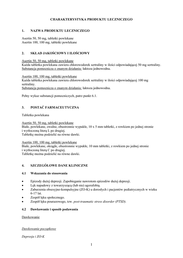 CHARAKTERYSTYKA PRODUKTU LECZNICZEGO 1. NAZWA PRODUKTU LECZNICZEGO Asertin 50, 50 mg, tabletki powlekane Asertin 100, 100 mg, tabletki powlekane 2. SKŁAD JAKOŚCIOWY I ILOŚCIOWY Asertin 50, 50 mg, tabletki powlekane Każda tabletka powlekana zawiera chlorowodorek sertraliny w ilości odpowiadającej 50 mg sertraliny. Substancja pomocnicza o znanym działaniu: laktoza jednowodna. Asertin 100, 100 mg, tabletki powlekane Każda tabletka powlekana zawiera chlorowodorek sertraliny w ilości odpowiadającej 100 mg sertraliny. Substancja pomocnicza o znanym działaniu: laktoza jednowodna. Pełny wykaz substancji pomocniczych, patrz punkt 6.1. 3. POSTAĆ FARMACEUTYCZNA Tabletka powlekana Asertin 50, 50 mg, tabletki powlekane Białe, powlekane, owalne, obustronnie wypukłe, 10 x 5 mm tabletki, z rowkiem po jednej stronie i wytłoczoną literą L po drugiej. Tabletkę można podzielić na równe dawki. Asertin 100, 100 mg, tabletki powlekane Białe, powlekane, okrągłe, obustronnie wypukłe, 10 mm tabletki, z rowkiem po jednej stronie i wytłoczoną literą C po drugiej. Tabletkę można podzielić na równe dawki. 4. SZCZEGÓŁOWE DANE KLINICZNE 4.1 Wskazania do stosowania Epizody dużej depresji. Zapobieganie nawrotom epizodów dużej depresji. Lęk napadowy z towarzyszącą (lub nie) agorafobią. Zaburzenia obsesyjno-kompulsyjne (ZO-K) u dorosłych i pacjentów pediatrycznych w wieku 6-17 lat. Zespół lęku społecznego. Zespół lęku pourazowego, tzw. post-traumatic stress disorder (PTSD). 4.2 Dawkowanie i sposób podawania Dawkowanie Dawkowanie początkowe Depresja i ZO-K 1 Dawka początkowa leku Asertin wynosi 50 mg na dobę. Lęk napadowy, PTSD i zespół lęku społecznego Leczenie należy rozpocząć od dawki 25 mg/dobę. Po upływie jednego tygodnia dawkę należy zwiększyć do 50 mg raz na dobę. Wykazano, że ten schemat dawkowania powoduje zmniejszenie częstości objawów niepożądanych charakterystycznych dla początkowej fazy leczenia zaburzenia lękowego z napadami lęku. Zwiększanie dawki Depresja, ZOK, lęk napadowy, zespół lęku społecznego i PTSD Gdy brak poprawy, dawkę początkową 50 mg leku można zwiększyć. Zmiany dawkowania należy wprowadzać w odstępach co najmniej jednego tygodnia, każdorazowo o 50 mg, aż do osiągnięcia dawki maksymalnej 200 mg na dobę. Ze względu na okres półtrwania eliminacji sertraliny, który wynosi 24 godziny, dawkowania nie należy zmieniać częściej niż raz na tydzień. Początek działania terapeutycznego może nastąpić w ciągu 7 dni. Aby osiągnąć trwały efekt terapeutyczny, zwłaszcza w leczeniu pacjentów z ZO-K, niezbędny jest jednak dłuższe leczenie. Leczenie podtrzymujące Podczas długotrwałego leczenia dawkowanie leku należy utrzymywać na poziomie najniższej skutecznej dawki, modyfikując dawkowanie w zależności od odpowiedzi terapeutycznej. Depresja W celu zapobiegania nawrotom epizodów dużej depresji może być wskazane leczenie długotrwałe. W większości przypadków dawka zalecana do zapobiegania nawrotom epizodów depresyjnych jest taka sama, jak dawka stosowana w leczeniu aktualnego epizodu. Pacjenci chorzy na depresję wymagają leczenia przez okres co najmniej 6 miesięcy, aby objawy ustąpiły. Lęk napadowy i ZO-K Należy monitorować długotrwałe leczenie lęku napadowego i ZO-K, ponieważ dla tych zaburzeń nie wykazano efektu zapobiegania nawrotom. Dzieci i młodzież Stosowanie u dzieci i młodzieży z zaburzeniami obsesyjno-kompulsyjnymi Wiek 13-17 lat: dawka początkowa 50 mg raz na dobę. Wiek 6-12 lat: dawka początkowa 25 mg raz na dobę. Po upływie tygodnia dawkowanie można zwiększyć do 50 mg raz na dobę. Gdy brak pożądanej odpowiedzi na leczenie, dawkowanie można dalej zwiększać jednorazowo o 50 mg/dobę, w zależności od potrzeb. Maksymalna dawka wynosi 200 mg na dobę. Przy zwiększaniu dawki powyżej 50 mg należy wziąć pod uwagę zazwyczaj mniejszą masę ciała dzieci od masy ciała dorosłych. Nie należy zmieniać dawkowania częściej niż raz na tydzień. Nie wykazano skuteczności stosowania leku w przypadkach dużej depresji u dzieci. Brak danych dotyczących stosowania leku u dzieci poniżej 6 roku życia (patrz także punkt 4.4). Stosowanie u pacjentów w podeszłym wieku Należy zachować ostrożność przy ustalaniu dawkowania u osób w podeszłym wieku ze względu na ryzyko wystąpienia hiponatremii (patrz punkt 4.4). Stosowanie u pacjentów z niewydolnością wątroby Stosowanie sertraliny u pacjentów z chorobami wątroby wymaga ostrożności. U pacjentów z upośledzeniem czynności wątroby należy stosować mniejsze dawki leku bądź wydłużyć okres 2 pomiędzy kolejnymi dawkami (patrz punkt 4.4). Sertraliny nie należy stosować u pacjentów z ciężkim zaburzeniem czynności wątroby ze względu na brak danych klinicznych (patrz punkt 4.4). Stosowanie u pacjentów z niewydolnością nerek Nie ma konieczności zmian dawkowania u pacjentów z niewydolnością nerek (patrz punkt 4.4). Objawy odstawienia po przerwaniu leczenia sertraliną Terapii nie należy przerywać w sposób nagły. Przy odstawianiu leczenia sertraliną, dawkę należy stopniowo zmniejszać przez okres co najmniej jednego do dwóch tygodni, aby zmniejszyć ryzyko wystąpienia objawów odstawienia (patrz punkty 4.4 i 4.8). Jeśli po zmniejszeniu dawki bądź odstawieniu leku wystąpią objawy, których pacjent nie toleruje, należy rozważyć ponowne wdrożenie uprzednio stosowanego dawkowania. Następnie lekarz prowadzący może zalecić bardziej stopniowe zmniejszenie dawki. Sposób podawania Tabletki powlekane Asertin należy przyjmować raz na dobę, rano lub wieczorem. Tabletki powlekane Asertin można przyjmować z posiłkiem lub niezależnie od posiłku. 4.3 Przeciwwskazania Nadwrażliwość na substancję czynną lub na którąkolwiek substancję pomocniczą wymienioną w punkcie 6.1. Przeciwwskazane jest jednoczesne stosowanie sertraliny z nieodwracalnymi inh