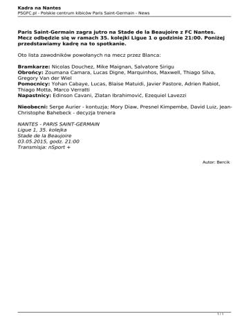 Kadra na Nantes PSGFC.pl - Polskie centrum kibiców Paris Saint-Germain - News Paris Saint-Germain zagra jutro na Stade de la Beaujoire z FC Nantes. Mecz odbędzie się w ramach 35. kolejki Ligue 1 o godzinie 21:00. Poniżej przedstawiamy kadrę na to spotkanie. Oto lista zawodników powołanych na mecz przez Blanca: Bramkarze: Nicolas Douchez, Mike Maignan, Salvatore Sirigu Obrońcy: Zoumana Camara, Lucas Digne, Marquinhos, Maxwell, Thiago Silva, Gregory Van der Wiel Pomocnicy: Yohan Cabaye, Lucas, Blaise Matuidi, Javier Pastore, Adrien Rabiot, Thiago Motta, Marco Verratti Napastnicy: Edinson Cavani, Zlatan Ibrahimović, Ezequiel Lavezzi Nieobecni: Serge Aurier - kontuzja; Mory Diaw, Presnel Kimpembe, David Luiz, JeanChristophe Bahebeck - decyzja trenera NANTES - PARIS SAINT-GERMAIN Ligue 1, 35. kolejka Stade de la Beaujoire 03.05.2015, godz. 21:00 Transmisja: nSport + Autor: Bercik 1/1 Powered by TCPDF (www.tcpdf.org)