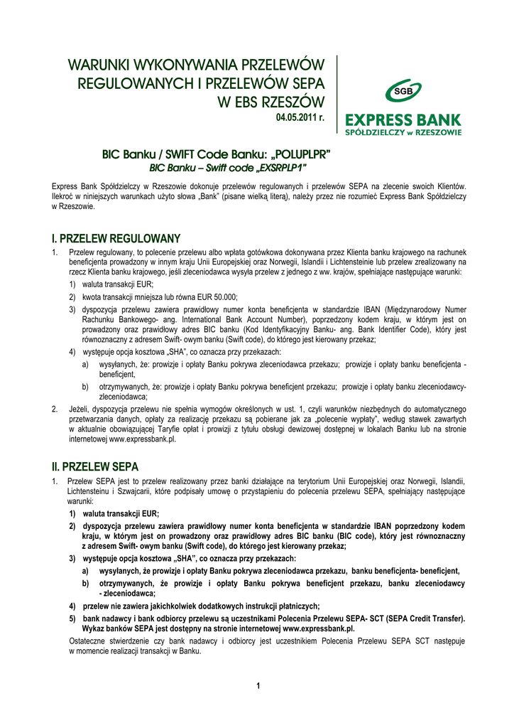WARUNKI WYKONYWANIA PRZELEWÓW REGULOWANYCH I PRZELEWÓW SEPA W EBS RZESZÓW 04.05.2011 r. BIC Banku / SWIFT Code Banku: „POLUPLPR” BIC Banku – Swift code „EXSRPLP1” Express Bank Spółdzielczy w Rzeszowie dokonuje przelewów regulowanych i przelewów SEPA na zlecenie swoich Klientów. Ilekroć w niniejszych warunkach użyto słowa „Bank” (pisane wielką literą), należy przez nie rozumieć Express Bank Spółdzielczy w Rzeszowie. I. PRZELEW REGULOWANY 1. 2. Przelew regulowany, to polecenie przelewu albo wpłata gotówkowa dokonywana przez Klienta banku krajowego na rachunek beneficjenta prowadzony w innym kraju Unii Europejskiej oraz Norwegii, Islandii i Lichtensteinie lub przelew zrealizowany na rzecz Klienta banku krajowego, jeśli zleceniodawca wysyła przelew z jednego z ww. krajów, spełniające następujące warunki: 1) waluta transakcji EUR; 2) kwota transakcji mniejsza lub równa EUR 50.000; 3) dyspozycja przelewu zawiera prawidłowy numer konta beneficjenta w standardzie IBAN (Międzynarodowy Numer Rachunku Bankowego- ang. International Bank Account Number), poprzedzony kodem kraju, w którym jest on prowadzony oraz prawidłowy adres BIC banku (Kod Identyfikacyjny Banku- ang. Bank Identifier Code), który jest równoznaczny z adresem Swift- owym banku (Swift code), do którego jest kierowany przekaz; 4) występuje opcja kosztowa „SHA”, co oznacza przy przekazach: a) wysyłanych, że: prowizje i opłaty Banku pokrywa zleceniodawca przekazu; prowizje i opłaty banku beneficjenta beneficjent, b) otrzymywanych, że: prowizje i opłaty Banku pokrywa beneficjent przekazu; prowizje i opłaty banku zleceniodawcyzleceniodawca; Jeżeli, dyspozycja przelewu nie spełnia wymogów określonych w ust. 1, czyli warunków niezbędnych do automatycznego przetwarzania danych, opłaty za realizację przekazu są pobierane jak za „polecenie wypłaty”, według stawek zawartych w aktualnie obowiązującej Taryfie opłat i prowizji z tytułu obsługi dewizowej dostępnej w lokalach Banku lub na stronie internetowej www.expressbank.pl. II. PRZELEW SEPA 1. Przelew SEPA jest to przelew realizowany przez banki działające na terytorium Unii Europejskiej oraz Norwegii, Islandii, Lichtensteinu i Szwajcarii, które podpisały umowę o przystąpieniu do polecenia przelewu SEPA, spełniający następujące warunki: 1) waluta transakcji EUR; 2) dyspozycja przelewu zawiera prawidłowy numer konta beneficjenta w standardzie IBAN poprzedzony kodem kraju, w którym jest on prowadzony oraz prawidłowy adres BIC banku (BIC code), który jest równoznaczny z adresem Swift- owym banku (Swift code), do którego jest kierowany przekaz; 3) występuje opcja kosztowa „SHA”, co oznacza przy przekazach: a) wysyłanych, że prowizje i opłaty Banku pokrywa zleceniodawca przekazu, banku beneficjenta- beneficjent, b) otrzymywanych, że prowizje i opłaty Banku pokrywa beneficjent przekazu, banku zleceniodawcy - zleceniodawca; 4) przelew nie zawiera jakichkolwiek dodatkowych instrukcji płatniczych; 5) bank nadawcy i bank odbiorcy przelewu są uczestnikami Polecenia Przelewu SEPA- SCT (SEPA Credit Transfer). Wykaz banków SEPA jest dostępny na stronie internetowej www.expressbank.pl. Ostateczne stwierdzenie czy bank nadawcy i odbiorcy jest uczestnikiem Polecenia Przelewu SEPA SCT następuje w momencie realizacji transakcji w Banku. 1 2. 3. Jeżeli, dyspozycja przelewu nie spełnia wymogów określonych: 1) w ust. 1 punkt 1 do 4, , opłaty za realizację przekazu są pobierane jak za „polecenie wypłaty”, według stawek zawartych w aktualnie obowiązującej Taryfie opłat i prowizji z tytułu obsługi dewizowej dostępnej w lokalach Banku, 2) w ust. 1 punkt 5, jednocześnie spełniając pozostałe wymogi, opłaty za realizację przekazu są pobierane jak za „przelew regulowany”, według stawek zawartych w aktualnie obowiązującej Taryfie opłat i prowizji z tytułu obsługi dewizowej dostępnej w lokalach Banku. Przelew SEPA zlecany w Banku jest realizowany wyłącznie w terminie określonym w Rozdziale III ust. 2 punkt 2. Nie ma możliwości realizacji przelewu SEPA w trybie niestandardowym. III. PRZELEW REGULOWANY I PRZELEW SEPA 1. 2. 3. 4. W przypadku przelewu regulowanego i przelewu SEPA Bank obciąża rachunek zleceniodawcy w dacie złożenia zlecenia, chyba że w samym zleceniu Klient wskazał przyszłą datę realizacji, przypadającą w dzień roboczy, wówczas obciążenie rachunku zleceniodawcy następuje we wskazanej dacie, z uwzględnieniem poniższych punktów: 1) wszystkie dane zawarte w zleceniu są sformułowane w sposób nie budzący wątpliwości i umożliwiający jego realizację, a Klient zapewnił środki pieniężne niezbędne do jego wykonania, 2) zlecenie zostało złożone w dzień roboczy lub przyszła data realizacji jest dniem roboczym. Wykonanie przelewu regulowanego i przelewu SEPA następuje poprzez uznanie rachunku banku beneficjenta w terminie: 3) do końca piątego dnia roboczego, następującego po dniu przyjęcia przez Bank zlecenia przelewu regulowanego, 4) do końca drugiego dnia roboczego, następującego po dniu przyjęcia przez Bank zlecenia przelewu SEPA. Bank wykonuje otrzymany przelew regulowany i przelew SEPA poprzez uznanie rachunku beneficjenta nie później niż do końca dnia roboczego następującego po dniu uznania rachunku Banku. Opłaty Z tytułu realizacji przelewu regulowanego i przelewu SEPA Bank pobiera od zleceniodawcy prowizje i opłaty, których wysokość i zasady pobierania zawarte są w Taryfie opłat i prowizji Banku. W przypadku przelewu regulowanego mogą wystąpić również koszty banku pośredniczącego w realizacji płatności z zastrzeżeniem, że ich wysokość zależy od kraju siedziby banku beneficjenta. Koszty banku pośredniczącego obciążają beneficjenta. Bank zastrzega sobie prawo swobodnego wyboru banku (banków) pośredniczących w realizacji przelewu regulowanego. Bank może nie uwzględnić sugestii zlecenio