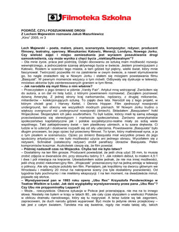 PODRÓŻ, CZYLI POSZUKIWANIE DROGI Z Lechem Majewskim rozmawia Jakub Mazurkiewicz „Kino” 2005, nr 3 Lech Majewski – poeta, malarz, pisarz, scenarzysta, kompozytor, reżyser, producent filmowy, teatralny, operowy. Mieszkaniec Katowic, Wenecji, Londynu, Nowego Jorku. Czy wielość zajęć i miejsc zamieszkania jest wyrazem poszukiwania drogi samookreślenia, czy może wynika z chęci bycia „nieklasyfikowalnym”? – Dla mnie życie, praca jest podróżą. Dzięki obcowaniu ze sztuką mam możliwość rozwoju wewnętrznego, a jednocześnie szansę aktywnego bycia w świecie. Jestem prowincjuszem z Katowic. Rosłem w szarości tego miasta, a tam gdzieś był piękny, wielki świat, który mnie fascynował. Twórczość pozwoliła mi na zaistnienie w owym świecie, a nawet stymulowanie go, bo nagle znalazłem się w Nowym Jorku i stałem się mózgiem powstawania filmu „Basquiat”. W pewnym momencie wszyscy o tym mówili. Odbywały się dyskusje w telewizji, mnóstwo aktorów było zainteresowanych graniem w tym filmie. – Jak narodziła się myśl filmu o nim właśnie? – Przeczytałem o jego śmierci w piśmie „Vanity Fair”. Artykuł mną wstrząsnął. Zwróciłem się do autora, a on dał mi listę ludzi, z którymi powinienem rozmawiać. Zacząłem poznawać dziwną Amerykę. Z jednej strony kraj narkomanów, nędzarzy, z drugiej milionerów, miliarderów – kolekcjonujących sztukę. To zajęło dwa lata. Narodził się z tego projekt, w którym chcieli grać i Harvey Keitel, i Dennis Hopper. Film zjednoczył nowojorski underground, ten obecny we wszystkich modnych pismach. W Nowym Jorku trudno o większy overground niż underground nowojorski (śmiech). Składałem „Basquiatem” hołd Wojaczkowi. Skojarzyłem ich jako soulbrothers. To byli ludzie, którzy mieli tę samą odwagę przeciwstawiania się stereotypom i martwocie społeczeństwa. Zarówno amerykańskie społeczeństwo kapitalistyczne jak i polskie socjalistyczno-realne miały ze sobą wiele wspólnego. Taki zaklajstrowany świat – tam plastikowy uśmiech, a tu szara drętwota. Ci ludzie w to uderzyli i dosłownie rozpadli się od siły uderzenia. Powstawanie „Basquiata” było długim procesem, bo jego ojciec był przeciwny filmowi. To tyran, który maltretował syna, a ja o tym pisałem w scenariuszu. Ojciec po śmierci Basquiata miał wszystkie prawa do jego spuścizny artystycznej – nie było możliwości użycia ani jednego obrazu. Wycofałem się z reżyserii, Schnabel (ostateczny reżyser) zrobił parafrazy obrazów Basquiata. Pełen kompromisów koszmar. Aczkolwiek cieszę się, że film powstał. – Później nadszedł czas na Wojaczka. Chyba też nie byto łatwo? – Dostaliśmy na ten film grosze. Producent powiedział, że jeśli chcę użyć 35 mm, to muszę zrobić zdjęcia w dwanaście dni, przy stosunku taśmy 3:1. Jak robiłem debiut, to miałem 4,5:1 i dwa i pół miesiąca na kręcenie. Uświadomiłem sobie jednak, że nie ma innej możliwości, jeśli chcę zrobić niekomercyjny film. „Wojaczek” przeznaczony był na jedną emisję w telewizji o północy. Ale siły wyższe polubiły ten film. Pamiętam, jak kręciliśmy na dworcu głównym we Wrocławiu i mieliśmy 20 minut na nakręcenie sceny (na tyle dostaliśmy pozwolenie). Od tygodnia było pochmurno i nie mieliśmy ekspozycji. I na ten moment, na dwadzieścia minut, pojawiło się słońce. – Wyreżyserował pan w 1993 roku operę „Ubu Rex” Krzysztofa Pendereckiego w Teatrze Wielkim w Łodzi. Jak dziś wyglądałby wyreżyserowany przez pana „Ubu Rex”? Czy Ubu nie przypominałby Leppera? – Może... rzeczywiście. Obecna sytuacja w Polsce jest przerażająca, nie ma na to innego słowa. Niestety nie byłem w kraju w latach 80., ale cały czas słyszałem o wielkości Polaków w obliczu dramatu narodowego, który się tu rozgrywał. A teraz ludzie są tak zagonieni, zapracowani, że duch narodu gdzieś wyparował. Być może to jedynie okres przejściowy – tak jest z całym światem. Tandeta ma się świetnie, nigdy nie miała takiej siły, takich mechanizmów rozpowszechniania jak dzisiaj... Jim Sheridan na festiwalu na Bermudach powiedział, że Internet istnieje dzięki pornografii... – Technika, media niszczą, psują to, co wartościowe – mówi o tym Klaudia w „Ogrodzie rozkoszy ziemskich”. – Stwierdzenie strasznie niebezpieczne, ponieważ są to banały. A tymczasem kultura masowa jest naprawdę największym zagrożeniem dla człowieka, niszczącym bardziej niż tytoń, alkohol i narkotyki razem wzięte. Producenci tandetnych kiczów powinni iść do więzienia na dwadzieścia lat za terror duchowy! Podobno ludzie chcą takich kiczów. Aż nie chce się wierzyć, że są aż tak ogłupieni. Być może to demokracja rozpieprza wszystko. Nietzsche powiedział: demokracja stworzona jest po to, by przeciętni pokonali wybitnych. W latach 80. w Polsce wszyscy mówili o tym jak jest strasznie, ale jednocześnie wielu ryzykowało życiem, karierą, przyszłością swoją i swoich dzieci. Ci, którzy nadawali ton, byli ludźmi o wysokim morale i etyce, a nie byle jakimiś pomiotami z oper mydlanych, teleturniejów i reality show. – Ale ich celem była demokracja. – Odpowiem nie wprost. Mieszkam ostatnio w Paryżu i co rusz napotykam ślady tego, że była kiedyś rewolucja francuska. Jak się jedzie przez Paryż to wszędzie jest napisane libérté, egalité, fraternité – a efektem tego był Napoleon, czyli totalne odwrócenie równości, braterstwa i wolności. Cała Francja jest jednym wielkim pomnikiem ku czci Napoleona. Przy jego trumnie ludzie stają i płaczą. Jeżeli Mazowiecki jest dzisiaj autorytetem zerowym, a Lepper ogromnym autorytetem, to nie trzeba tego komentować. – Zgodzi się pan na etykietkę – malarz filmowy? „Ogród rozkoszy ziemskich” byłby tego potwierdzeniem – inspirowany malarstwem Hieronima Boscha. – Tak właśnie się czułem. Jakbym trzymał pędze