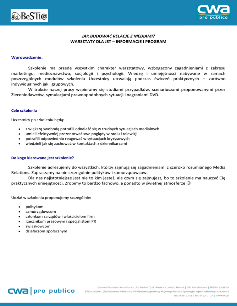 JAK BUDOWAĆ RELACJE Z MEDIAMI? WARSZTATY DLA JST – INFORMACJE I PROGRAM Wprowadzenie: Szkolenie ma przede wszystkim charakter warsztatowy, wzbogacony zagadnieniami z zakresu marketingu, medioznawstwa, socjologii i psychologii. Wiedzę i umiejętności nabywane w ramach poszczególnych modułów szkolenia Uczestnicy utrwalają podczas ćwiczeń praktycznych – zarówno indywidualnych jak i grupowych. W trakcie naszej pracy wspieramy się studiami przypadków, scenariuszami proponowanymi przez Zleceniodawców, symulacjami prawdopodobnych sytuacji i nagraniami DVD. Cele szkolenia Uczestnicy po szkoleniu będą: z większą swobodą potrafili odnaleźć się w trudnych sytuacjach medialnych umieli efektywniej prezentować swe poglądy w radiu i telewizji potrafili odpowiednio reagować w sytuacjach kryzysowych wiedzieli jak się zachować w kontaktach z dziennikarzami Do kogo kierowane jest szkolenie? Szkolenie adresujemy do wszystkich, którzy zajmują się zagadnieniami z szeroko rozumianego Media Relations. Zapraszamy na nie szczególnie polityków i samorządowców. Dla nas najistotniejsze jest nie to kim jesteś, ale czym się zajmujesz, bo to szkolenie ma nauczyć Cię praktycznych umiejętności. Zrobimy to bardzo fachowo, a ponadto w świetnej atmosferze Udział w szkoleniu proponujemy szczególnie: politykom samorządowcom członkom zarządów i właścicielom firm rzecznikom prasowym i specjalistom PR związkowcom działaczom społecznym Szczegółowy program szkolenia: 1) Tajemnica sukcesu w kontaktach z mediami: a) b) c) d) media – ich siła i słabości, reguły współpracy z dziennikarzami, otwartość, rzetelność, wiarygodność – elementy budowania relacji z mediami, elementy prawa prasowego; 2) Wystąpienia przed kamerą: a) b) c) d) przygotowanie do wystąpienia przed kamerą, rozmowa z dziennikarzem w przestrzeni zamkniętej, rozmowa z dziennikarzem w plenerze, reguły kadrowania i wybierania planu; 3) Kryzys medialny, czyli jak przeżyć trzęsienie ziemi w JST: a) b) c) d) kryzys, czyli coś spodziewanego i normalnego, co się stanie, gdy schowamy głowę w piasek, analiza potencjalnych sytuacji kryzysowych, komunikaty i oświadczenia w sytuacjach kryzysowych; 4) Public Relations w JST: a) b) c) d) budowanie pozytywnego wizerunku JST, skuteczne działania promocyjne w urzędzie, portale JST i media społecznościowe, współpraca z Fundacją na rzecz Wsparcia Innowacji w JST; Oferta obejmuje: 8 godzin szkolenia prowadzonego przez trenera Cezarego Wojtczaka materiały szkoleniowe dla Uczestników szkolenia (w formacie PDF) pen drive’y z materiałami szkoleniowymi i ofertą Fundacji certyfikaty dla Uczestników szkolenia Cezary Wojtczak – notka biograficzna: Z wykształcenia dziennikarz i menadżer. Prezes Fundacji na rzecz Wsparcia Innowacji w Jednostkach Samorządu Terytorialnego. Ekspert w dziedzinie szeroko rozumianej komunikacji. Autor innowacyjnego projektu szkoleniowego „Mistrzowskie wystąpienia publiczne”, w którym realizuje swą pasję jaką są publiczne prezentacje. Posiada Kartę Prezenterską Telewizji Polskiej. Doradza firmom w zakresie Media Relations, szkoli rzeczników prasowych, dziennikarzy, samorządowców i biznesmenów. W 2009 roku uznany przez miesięcznik „PRESS” za jednego z najlepszych dziennikarzy w regionie kujawsko-pomorskim. Do roku 2015 realizował cykliczne programy edukacyjno-publicystyczne emitowane na ogólnopolskiej antenie TVP Regionalna. W latach 2015-2016 prezes Zarządu i Redaktor Naczelny Polskiego Radia PiK. Członek Rady Programowej TVP Bydgoszcz.