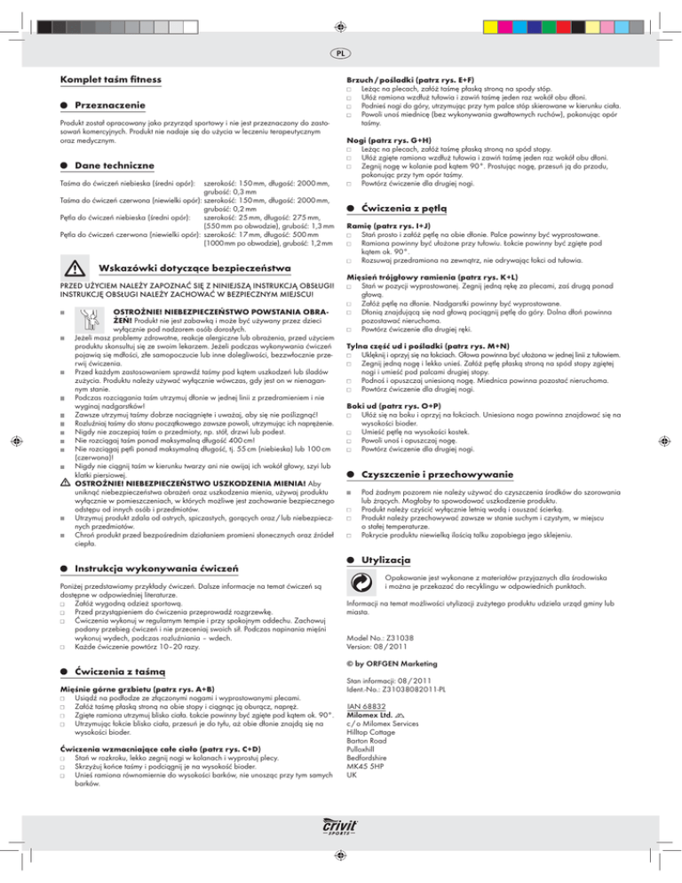Komplet taśm fitness Przeznaczenie Produkt został opracowany jako przyrząd sportowy i nie jest przeznaczony do zastosowań komercyjnych. Produkt nie nadaje się do użycia w leczeniu terapeutycznym oraz medycznym. Dane techniczne Taśma do ćwiczeń niebieska (średni opór): szerokość: 150 mm, długość: 2000 mm, grubość: 0,3 mm Taśma do ćwiczeń czerwona (niewielki opór): szerokość: 150 mm, długość: 2000 mm, grubość: 0,2 mm Pętla do ćwiczeń niebieska (średni opór): szerokość: 25 mm, długość: 275 mm, (550 mm po obwodzie), grubość: 1,3 mm Pętla do ćwiczeń czerwona (niewielki opór): szerokość: 17 mm, długość: 500 mm (1000 mm po obwodzie), grubość: 1,2 mm Wskazówki dotyczące bezpieczeństwa PRZED UŻYCIEM NALEŻY ZAPOZNAĆ SIĘ Z NINIEJSZĄ INSTRUKCJĄ OBSŁUGI! INSTRUKCJĘ OBSŁUGI NALEŻY ZACHOWAĆ W BEZPIECZNYM MIEJSCU! OSTROŻNIE! NIEBEZPIECZEŃSTWO POWSTANIA OBRAŻEŃ! Produkt nie jest zabawką i może być używany przez dzieci wyłącznie pod nadzorem osób dorosłych. Jeżeli masz problemy zdrowotne, reakcje alergiczne lub obrażenia, przed użyciem produktu skonsultuj się ze swoim lekarzem. Jeżeli podczas wykonywania ćwiczeń pojawią się mdłości, złe samopoczucie lub inne dolegliwości, bezzwłocznie przerwij ćwiczenia. Przed każdym zastosowaniem sprawdź taśmy pod kątem uszkodzeń lub śladów zużycia. Produktu należy używać wyłącznie wówczas, gdy jest on w nienagannym stanie. Podczas rozciągania taśm utrzymuj dłonie w jednej linii z przedramieniem i nie wyginaj nadgarstków! Zawsze utrzymuj taśmy dobrze naciągnięte i uważaj, aby się nie poślizgnąć! Rozluźniaj taśmy do stanu początkowego zawsze powoli, utrzymując ich naprężenie. Nigdy nie zaczepiaj taśm o przedmioty, np. stół, drzwi lub podest. Nie rozciągaj taśm ponad maksymalną długość 400 cm! Nie rozciągaj pętli ponad maksymalną długość, tj. 55 cm (niebieska) lub 100 cm (czerwona)! Nigdy nie ciągnij taśm w kierunku twarzy ani nie owijaj ich wokół głowy, szyi lub klatki piersiowej. OSTROŻNIE! NIEBEZPIECZEŃSTWO USZKODZENIA MIENIA! Aby uniknąć niebezpieczeństwa obrażeń oraz uszkodzenia mienia, używaj produktu wyłącznie w pomieszczeniach, w których możliwe jest zachowanie bezpiecznego odstępu od innych osób i przedmiotów. Utrzymuj produkt zdala od ostrych, spiczastych, gorących oraz / lub niebezpiecznych przedmiotów. Chroń produkt przed bezpośrednim działaniem promieni słonecznych oraz źródeł ciepła. Instrukcja wykonywania ćwiczeń Poniżej przedstawiamy przykłady ćwiczeń. Dalsze informacje na temat ćwiczeń są dostępne w odpowiedniej literaturze. Załóż wygodną odzież sportową. Przed przystąpieniem do ćwiczenia przeprowadź rozgrzewkę. Ćwiczenia wykonuj w regularnym tempie i przy spokojnym oddechu. Zachowuj podany przebieg ćwiczeń i nie przeceniaj swoich sił. Podczas napinania mięśni wykonuj wydech, podczas rozluźniania – wdech. Każde ćwiczenie powtórz 10–20 razy. Ćwiczenia z taśmą Mięśnie górne grzbietu (patrz rys. A+B) Usiądź na podłodze ze złączonymi nogami i wyprostowanymi plecami. Załóż taśmę płaską stroną na obie stopy i ciągnąc ją oburącz, napręż. Zgięte ramiona utrzymuj blisko ciała. Łokcie powinny być zgięte pod kątem ok. 90°. Utrzymując łokcie blisko ciała, przesuń je do tyłu, aż obie dłonie znajdą się na wysokości bioder. Ćwiczenia wzmacniające całe ciało (patrz rys. C+D) Stań w rozkroku, lekko zegnij nogi w kolanach i wyprostuj plecy. Skrzyżuj końce taśmy i podciągnij je na wysokość bioder. Unieś ramiona równomiernie do wysokości barków, nie unosząc przy tym samych barków. Brzuch / pośladki (patrz rys. E+F) Leżąc na plecach, załóż taśmę płaską stroną na spody stóp. Ułóż ramiona wzdłuż tułowia i zawiń taśmę jeden raz wokół obu dłoni. Podnieś nogi do góry, utrzymując przy tym palce stóp skierowane w kierunku ciała. Powoli unoś miednicę (bez wykonywania gwałtownych ruchów), pokonując opór taśmy. Nogi (patrz rys. G+H) Leżąc na plecach, załóż taśmę płaską stroną na spód stopy. Ułóż zgięte ramiona wzdłuż tułowia i zawiń taśmę jeden raz wokół obu dłoni. Zegnij nogę w kolanie pod kątem 90°. Prostując nogę, przesuń ją do przodu, pokonując przy tym opór taśmy. Powtórz ćwiczenie dla drugiej nogi. Ćwiczenia z pętlą Ramię (patrz rys. I+J) Stań prosto i załóż pętlę na obie dłonie. Palce powinny być wyprostowane. Ramiona powinny być ułożone przy tułowiu. Łokcie powinny być zgięte pod kątem ok. 90°. Rozsuwaj przedramiona na zewnątrz, nie odrywając łokci od tułowia. Mięsień trójgłowy ramienia (patrz rys. K+L) Stań w pozycji wyprostowanej. Zegnij jedną rękę za plecami, zaś drugą ponad głową. Załóż pętlę na dłonie. Nadgarstki powinny być wyprostowane. Dłonią znajdującą się nad głową pociągnij pętlę do góry. Dolna dłoń powinna pozostawać nieruchoma. Powtórz ćwiczenie dla drugiej ręki. Tylna część ud i pośladki (patrz rys. M+N) Uklęknij i oprzyj się na łokciach. Głowa powinna być ułożona w jednej linii z tułowiem. Zegnij jedną nogę i lekko unieś. Załóż pętlę płaską stroną na spód stopy zgiętej nogi i umieść pod palcami drugiej stopy. Podnoś i opuszczaj uniesioną nogę. Miednica powinna pozostać nieruchoma. Powtórz ćwiczenie dla drugiej nogi. Boki ud (patrz rys. O+P) Ułóż się na boku i oprzyj na łokciach. Uniesiona noga powinna znajdować się na wysokości bioder. Umieść pętlę na wysokości kostek. Powoli unoś i opuszczaj nogę. Powtórz ćwiczenie dla drugiej nogi. Czyszczenie i przechowywanie Pod żadnym pozorem nie należy używać do czyszczenia środków do szorowania lub żrących. Mogłoby to spowodować uszkodzenie produktu. Produkt należy czyścić wyłącznie letnią wodą i osuszać ścierką. Produkt należy przechowywać zawsze w stanie suchym i