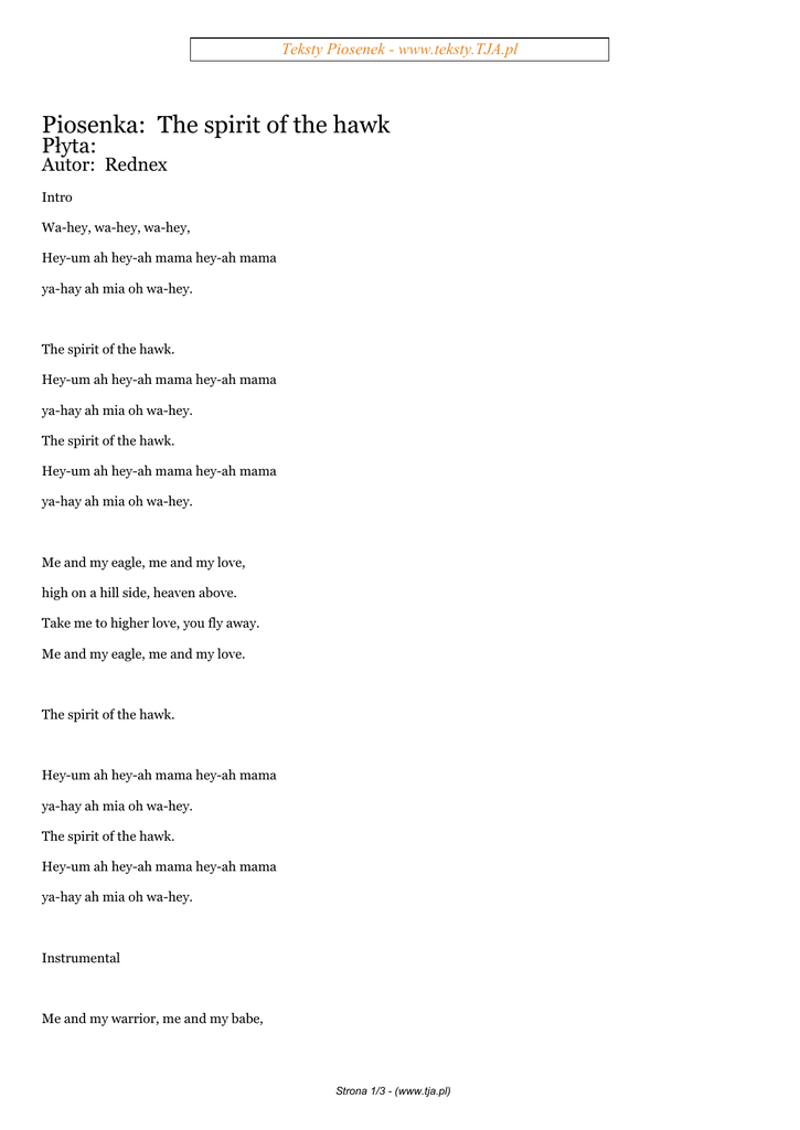 Teksty Piosenek - www.teksty.TJA.pl Piosenka: The spirit of the hawk Płyta: Autor: Rednex Intro Wa-hey, wa-hey, wa-hey, Hey-um ah hey-ah mama hey-ah mama ya-hay ah mia oh wa-hey. The spirit of the hawk. Hey-um ah hey-ah mama hey-ah mama ya-hay ah mia oh wa-hey. The spirit of the hawk. Hey-um ah hey-ah mama hey-ah mama ya-hay ah mia oh wa-hey. Me and my eagle, me and my love, high on a hill side, heaven above. Take me to higher love, you fly away. Me and my eagle, me and my love. The spirit of the hawk. Hey-um ah hey-ah mama hey-ah mama ya-hay ah mia oh wa-hey. The spirit of the hawk. Hey-um ah hey-ah mama hey-ah mama ya-hay ah mia oh wa-hey. Instrumental Me and my warrior, me and my babe, Strona 1/3 - (www.tja.pl) Teksty Piosenek - www.teksty.TJA.pl he gotta fly for more, we are the same. He gotta fly for love, fly away. Me and my warrior, me and my babe. The spirit of the hawk. Hey-um ah hey-ah mama hey-ah mama ya-hay ah mia oh wa-hey. The spirit of the hawk. Hey-um ah hey-ah mama hey-ah mama ya-hay ah mia oh wa-hey. The spirit of the hawk. Hey-um ah hey-ah mama hey-ah mama ya-hay ah mia wa-hay-ah mama. Hey-um ah hey-ah mama hey-ah mama ya-hay ah mia, hey-ah mama /wa-hey/ The spirit of the hawk. Bridge My people, some of them have run away to the hills and have no shelter. (wa-hey) No food, no one knows where they are, Hear me my chiefs, I am tired.(wa-hey) My heart is sick and sad, I will fight no more. Instrumental Hey-um ah hey-ah mama hey-ah mama ya-hay ah mia oh wa-hey. The spirit of the hawk. Hey-um ah hey-ah mama hey-ah mama ya-hay ah mia oh wa-hey. The spirit of the hawk. Strona 2/3 - (www.tja.pl) Teksty Piosenek - www.teksty.TJA.pl Hey-um ah hey-ah mama hey-ah mama ya-hay ah mia hey-ah mama. Hey-um ah hey-ah mama hey-ah mama ya-hay ah mia hey-ah mama. Hey-um ah hey-ah mama hey-ah mama ya-hay ah mia hey-ah mama. (fade) ***************************************** Polecamy Strony: www.opisy.tja.pl - Codzienie nowe opisy na GG www.rozmowki.tja.pl - Śmieszne Rozmówki www.tapeciarnia.pl - Mnustwo fajnych tapet na pulpit www.teledyski.tja.pl - Zawsze najnowsze teledyski www.lol2.pl - Śmieszne Filmiki, Kabarety www.wkinach.pl - Co jest grane w kinach ? Strona 3/3 - (www.tja.pl)