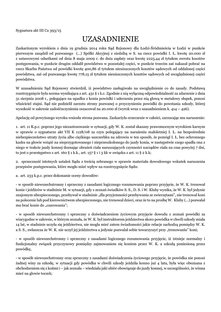 Sygnatura akt III Ca 393/15 UZASADNIENIE Zaskarżonym wyrokiem z dnia 19 grudnia 2014 roku Sąd Rejonowy dla Łodzi-Śródmieścia w Łodzi w punkcie pierwszym zasądził od pozwanego (...) Spółki Akcyjnej z siedzibą w S. na rzecz powódki I. Ł. kwotę 20.000 zł z ustawowymi odsetkami od dnia 8 maja 2009 r. do dnia zapłaty oraz kwotę 2225,44 zł tytułem zwrotu kosztów postępowania, w punkcie drugim oddalił powództwo w pozostałej części, w punkcie trzecim zaś nakazał pobrać na rzecz Skarbu Państwa od powódki kwotę 400,86 zł tytułem nieuiszczonych kosztów sądowych od oddalonej części powództwa, zaś od pozwanego kwotę 778,15 zł tytułem nieuiszczonych kosztów sądowych od uwzględnionej części powództwa. W uzasadnieniu Sąd Rejonowy stwierdził, iż powództwo zasługiwało na uwzględnienie co do zasady. Podstawą rozstrzygnięcie była norma wynikająca z art. 431 § 1 k.c. Zgodnie z nią wyłączną odpowiedzialność za zdarzenie z dnia 31 sierpnia 2008 r., polegające na upadku z konia powódki i uderzeniu przez nią głową w metalowy słupek, ponosi właściciel stajni. Sąd nie podzielił zarzutu strony pozwanej o przyczynieniu powódki do powstania szkody, której wysokość w zakresie zadośćuczynienia oszacował na 20.000 zł (wyrok wraz z uzasadnieniem k. 414 – 426). Apelację od powyższego wyroku wniosła strona pozwana. Zaskarżyła orzeczenie w całości, zarzucając mu naruszenie: 1. art. 11 K.p.c. poprzez jego niezastosowanie w sytuacji, gdy W. K. został skazany prawomocnym wyrokiem karnym w sprawie o sygnaturze akt VII K 1128/08 za czyn polegający na narażeniu małoletniej I. Ł. na bezpośrednie niebezpieczeństwo utraty życia albo ciężkiego uszczerbku na zdrowiu w ten sposób, że pomógł I. Ł. bez ochronnego kasku na głowie wsiąść na nieprzygotowanego i nieprzeszkolonego do jazdy konia, w następstwie czego spadła ona z niego w trakcie jazdy konnej doznając obrażeń ciała naruszających czynności narządów ciała na czas powyżej 7 dni, to jest o przestępstwo z art. 160 § 1 k.k., art. 157 § 1 i 3 kk w związku z art. 11 § 2 k.k; 2. sprzeczność istotnych ustaleń Sądu z treścią zebranego w sprawie materiału dowodowego wskutek naruszenia przepisów postępowania, które mogło mieć wpływ na rozstrzygnięcie Sądu: a. art. 233 k.p.c. przez dokonanie oceny dowodów: - w sposób niewszechstronny i sprzeczny z zasadami logicznego rozumowania poprzez przyjęcie, że W. K. trenował konie i jeźdźców w stadninie M. w sytuacji, gdy z zeznań świadków S. S., D. S. i W. Kluby wynika, że W. K. był jedynie znajomym ubezpieczonego, przebywał w stadninie „dla przyjemności przebywania ze zwierzętami”, nie trenował koni na polecenie lub pod kierownictwem ubezpieczonego, nie trenował dzieci, oraz że to na prośbę W. Kluby (...) pozwalał mu brać konie do „czarowania”; - w sposób niewszechstronny i sprzeczny z doświadczeniem życiowym przyjęcie dowodu z zeznań powódki za wiarygodne w zakresie, w którym zeznała, że W. K. był instruktorem jeździectwa skoro powódka w chwili szkody miała 14 lat, w stadninie uczyła się jeździectwa, nie mogła mieć zatem świadomości jakie relacje zachodzą pomiędzy W. K. a S. S., zwłaszcza że W. K. nie uczył jej jeździectwa a jedynie pozwalał sobie towarzyszyć przy „trenowaniu” koni; - w sposób niewszechstronny i sprzeczny z zasadami logicznego rozumowania przyjęcie, iż istnieje normalny i funkcjonalny związek przyczynowy pomiędzy zajmowaniem się koniem przez W. K. a szkodą poniesioną przez powódkę, - w sposób niewszechstronny oraz sprzeczny z zasadami doświadczenia życiowego przyjęcie, że powódka nie ponosi żadnej winy za szkodę, w sytuacji gdy powódka w chwili szkody jeździła konno już 4 lata, była więc obeznana z obchodzeniem się z końmi i – jak zeznała – wiedziała jaki ubiór obowiązuje do jazdy konnej, w szczególności, że winna mieć na głowie toczek; 3. naruszenie przepisów prawa materialnego: a. art. 429 k.c., art. 415 k.c. oraz art. 431 k.c. poprzez ich niewłaściwe zastosowanie jak i błędną wykładnię i przyjęcie przez Sąd I instancji, że S. S. powierzył W. Klubie wykonanie jakiejkolwiek czynności oraz że szkoda powódki wystąpiła w związku funkcjonalnym z czynnościami wykonywanymi w stadninie przez W. K.; b. art. 362 k.c. poprzez jego niezastosowanie i przyjęcie, że powódka nie przyczyniła się do powstania szkody w sytuacji, gdy okoliczności zdarzenia wskazują, iż powódka wbrew obowiązkowi nie założyła toczka na głowę, co zgodnie z opinią biegłej było główną przyczyną szkody; c. art. 445 § 1 k.c. w związku z art. 444 § 1 k.c. przez niewłaściwe zastosowanie, skutkujące przyznaniem na rzecz powódki kwoty zadośćuczynienia rażąco wygórowanej, a przez to nieodpowiedniej w stosunku do charakteru doznanej przez powódkę krzywdy oraz kwoty wypłaconej przez pozwanego w toku postępowania likwidacyjnego. W konsekwencji apelujący wnosił o zmianę zaskarżonego wyroku poprzez oddalenie powództwa, zmianę rozstrzygnięcia o kosztach procesu w zakresie stosownym do dokonanej zmiany wyroku i zasądzenie kosztów procesu w tym kosztów zastępstwa procesowego za II instancję według norm przepisanych (apelacja k. 435 – 440). Sąd Okręgowy dodatkowo ustalił: W momencie zdarzenia skutkującego szkodą powódki stajnie były otwarte, zbliżała się pora spędzania koni do stajni. S. S. znajdował się przy wejściu do stajni, pił herbatę. Nie widział, jak powódka wsiada na konia, zobaczył ją dopiero, kiedy jechała wyciągniętym kłusem na koniu w kierunku stajni (zeznania świadka S. S. k. 256 – 258). Razem ze S. S. przy wejściu do stajni czekała D. S.. Ona także dostrzegła powódkę, kiedy już jechała na koniu; wtedy już od co najmniej godziny nie trwały żadne zajęcia (zeznania świadka D. S. k. 258 – 259). Powyższe zeznania Sąd Ok