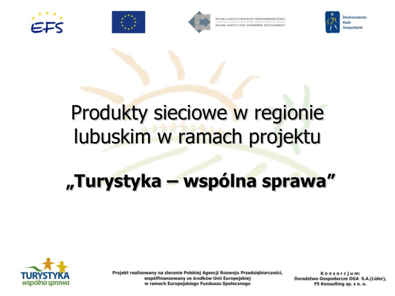Produkty sieciowe w regionie lubuskim w ramach projektu „Turystyka – wspólna sprawa” „Turystyka - wspólna sprawa" Pierwszy w Polsce kompleksowy projekt szkoleń i doradztwa dla branży turystycznej. Cel projektu: Poprawa konkurencyjności branży turystycznej oraz podniesienie umiejętności zawodowych osób w niej pracujących. Turystyka - wspólna sprawa (3 edycje): grudzień 2005 – grudzień 2007 5 województw: dolnośląskie kujawsko-pomorskie, podlaskie, pomorskie, świętokrzyskie. czerwiec 2006 – grudzień 2007 5 województw: śląskie, lubelskie, małopolskie, zachodniopomorskie, warmińsko-mazurskie. lipiec 2006 – grudzień 2007 6 województw: wielkopolskie, opolskie, łódzkie, mazowieckie, lubuskie, podkarpackie. Finansowanie: Projekt jest dofinansowany z Europejskiego Funduszu Społecznego, w ramach Sektorowego Programu Operacyjnego Rozwój Zasobów Ludzkich, realizowany na zlecenie Polskiej Agencji Rozwoju Przedsiębiorczości. TWS - III edycja (informacje podstawowe): Finansowanie: Europejski Fundusz Społeczny i budżet państwa Wkład własny przedsiębiorców (20 - 40% kosztów uczestnictwa) Zakres projektu: Konferencje, szkolenia i konsultacje dla przedstawicieli sektora turystycznego w sześciu województwach (w podziale na trzy Komponenty) Zakres częściowej odpłatności: Komponent I – konferencje, szkolenia i konsultacje Komponent II – szkolenia i konsultacje Komponent III – kursy językowe Obszar realizacji: 6 województw: lubuskie, wielkopolskie, mazowieckie, łódzkie, opolskie, podkarpackie Założenia dotyczące wskaźników: Równomierny podział uczestników między województwa „Równość płci”: połowa uczestników to kobiety Miejsce realizacji TWS - III edycja: Projekt jest realizowany w sześciu województwach: mazowieckim lubuskim, wielkopolskim, łódzkim, opolskim, podkarpackim. Projekt TWS - III edycja realizuje Konsorcjum: www.dga.pl www.f5.pl przy udziale: www.migutmedia.pl Adresaci projektu: • przedsiębiorstwa turystyczne • przedstawiciele jednostek samorządu terytorialnego • przedstawiciele organizacji pracodawców i przedsiębiorców wspierających rozwój turystyki Przedsiębiorstwa: • hotele i pensjonaty • gastronomia • firmy transportowe • biura podróży • usługi wspierające ofertę turystyczną Jednostki administracji publicznej: • starostwa powiatowe • urzędy marszałkowskie • urzędy wojewódzkie • urzędy miast i gmin Organizacje wspierające rozwój turystyki: Korzyści dla uczestników: Podniesienie kompetencji uczestników projektu Nowe możliwości rozwoju firm turystycznych Doradztwo w sprawach zarządzania firmą i ofertą usług Poznanie źródeł finansowania i promocji usług turystycznych Zwiększenie aktywności turystycznej Promocja regionu i jego gospodarzy Korzyści dla przedsiębiorstw: nowe możliwości rozwoju firmy, dzięki zróżnicowanej atrakcyjnej ofercie turystycznej w regionie podniesienie kompetencji zawodowych – specjalny program turystyczny doradztwo w zakresie zarządzania firmą i ofertą usług Korzyści dla samorządu i organizacji: zwiększenie aktywności podmiotów w regionie – większe wpływy do budżetów jednostek samorządu terytorialnego promocja regionu i jego przedstawicieli podniesienie kompetencji zawodowych – specjalny program turystyczny Niskie koszty uczestnictwa: Dofinansowanie z Europejskiego Funduszu Społecznego Małe i średnie przedsiębiorstwa: 80% dofinansowania Duże przedsiębiorstwa: 60% dofinansowania Samorządy i organizacje: 100% dofinansowania Zakres projektu – komponenty Komponent I Komponent II Komponent III – „Współpraca sieciowa” – „Zarządzanie turystyką” – „Szkolenia językowe” Wyróżniane ze względu na odmienne cele, grupy docelowe oraz zakres merytoryczny! Kursy językowe - III edycja: W każdej grupie tylko 9 osób! Kurs będzie trwał 96 godzin lekcyjnych! Grupy partnerskie - III edycja: W LUBUSKIM powstało VI grup partnerskich: 2. zielonogórska 3. żarsko-żagańska 4. militarna 5. Wschowa i Pojezierze Sławskie 6. Ujście Warty 7. gorzowska Grupa zielonogórska – powiat zielonogórski oraz • Obszar działania • Liderami Grupy Partnerskiej zostali • • krośnieński : - Artur Beling - Fundacja Rozwoju Kultury „Kombinat Kultury”, lider produktu turystycznego pod nazwą „Zielona Kraina Zabawy i Wina; - Zbigniew Majewski – Stowarzyszenie Turystyczno-Sportowe „Sokół”, lider produktu turystycznego pod nazwą „W Lubuskie Na Konie, Ryby i Grzyby” Członkowie grupy • • • • • • • • • • • • • • Włodzimierz Sroka- Gospodarstwo Agroturystyczne „Letnica” Roman Grad- „Winnica Julia” Przemysław Karwowski- Zielonogórskie Stowarzyszenie Winiarskie Wiesława Gołębiowska – „Zajazd Pocztowy” Janusz Żarkowski – Restauracja Jefferson’s Mirosław Gancarz – Uniwersytecki Klub „Kotłownia” Krzysztof Żejmo – Hoga Sp. z o.o. Edyta Ogonowska – Hotel Onyx Elżbieta Wiśniewska – Lubuski Ośrodek Doradztwa Rolniczego w Kalsku Anna Sulima-Jagiełowicz – Wojewódzki Ośrodek Sportu i Rekreacji Sebastian Jagiełowicz – Stowarzyszenie Na Rzecz Rozwoju Wsi Drzonków Witold Czajka – Zakład Kartograficzny SYGNATURA Bogdan Roszkowski – Hotel Aura Tadeusz Walkowiak – Fundacja „Porozumienie Wzgórz Dalkowskich” Członkowie grupy • • • • • • • • • • • • • • • Aneta Szlachetka – 4 Róze Sp.j Bruno Aleksander Kieć – PHU Brutus-Arte Artur Beling – Fundacja Rozwoju Kultury „Kombinat Kultury” Jerzy Jaszczak – Lubuski Klub Sportowo-Turystyczny „Agros” Jerzy Jaszczak – Lokalna Grupa Działania Regionu Kozła Małgorzata Mucha – Neckermann Polska Centrum Turystyki Grzegorz Szalpuk – PWSZ w Sulechowie Instytut Turystyki i Rekreacji Włodzimierz Sroka – Lubuskie Stowarzyszenie Gospodarstw Agroturystycznych Jarosław Wnorowski – Zielonogórskie Centrum Informacji i Pr