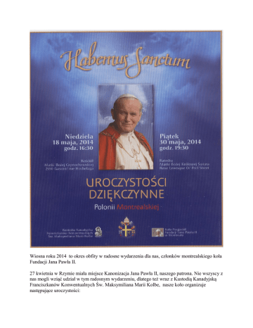 Wiosna roku 2014 to okres obfity w radosne wydarzenia dla nas, członków montrealskiego koła Fundacji Jana Pawła II. 27 kwietnia w Rzymie miała miejsce Kanonizacja Jana Pawła II, naszego patrona. Nie wszyscy z nas mogli wziąć udział w tym radosnym wydarzeniu, dlatego też wraz z Kustodią Kanadyjską Franciszkanów Konwentualnych Św. Maksymiliana Marii Kolbe, nasze koło organizuje następujące uroczystości: * w niedzielę, 18 maja o godz. 16.30 w kościele Matki Bożej Częstochowskiej odprawiona zostanie uroczysta Msza święta dziękczynna Polonii montrealskiej. Zbiega sie ona z Dniem Fundacji Jana Pawła II (17 maja - rocznica urodzin Papieża). * w piątek, 30 maja o godz. 19.30 w Katedrze Matki Bożej Królowej Świata (Peel/ Rene Levesque Ouest) ogólnomontrealska Msza dziękczynna za nowych Świętych: Jana XXIII oraz Jana Pawła II sprawowana przez arcybiskupa Christiana Lépine. Zapraszam do wzięcia udziału we wszystkich tych uroczystościach, a zwłaszcza w dniu 30 maja w katedrze, by nasza polonijna grupa wypadła godnie względem grupy montrealczyków włoskiego pochodzenia, świętujących kanonizację Jana XXIII. Uprzejmie prosimy o przyniesienie chorągiewek polskich i papieskich czy portretów naszego papieża, przypięcia biało-czerwonych kokardek oraz o udział pocztów sztandarowych Polonii. Pokażmy podczas tych uroczystości jak dumni jesteśmy z naszego Rodaka – nowego Świętego. Dlatego proszę o propagowanie apelu w kręgu swoich znajomych, organizacji, parafii. Jednocześnie zachęcam do wstępowania do naszej Fundacji, gdyż Ojciec Święty w październiku 1998 roku powiedział: „Przychodząc na pomoc Fundacji noszącej moje imię, dajecie wyraz waszemu oddaniu i życzliwości dla Papieża. Bardzo wam za to dziękuję. Odwzajemniam tę życzliwośc polecając Bogu ...” Za wszystkie dary otrzymacie Państwo pokwitowania podatkowe, a nazwiska ofiarodawców zostaną wymienione w Biuletynie Polonijnym oraz Biuletynie Fundacji. Stefan Władysiuk Prezes montrealskiego Koła Przyjaciół Fundacji Jana Pawła II Zapraszam na naszą stronę internetowa http://www.fjp2.ca. Zachęcam do obejrzenia zdjęć z naszego Srebrnego Jubileuszu oraz albumu Jan Paweł II we wspomnieniach Polonii montrealskiej.