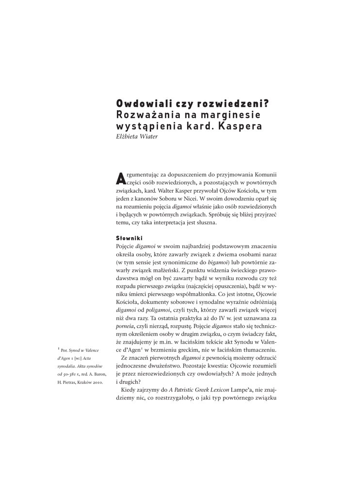 Owdowiali czy rozwiedzeni? Rozważania na marginesie w y s t ą p i e n i a k a r d . Ka s p e ra Elżbieta Wiater rgumentując za dopuszczeniem do przyjmowania Komunii części osób rozwiedzionych, a pozostających w powtórnych związkach, kard. Walter Kasper przywołał Ojców Kościoła, w tym jeden z kanonów Soboru w Nicei. W swoim dowodzeniu oparł się na rozumieniu pojęcia digamoi właśnie jako osób rozwiedzionych i będących w powtórnych związkach. Spróbuję się bliżej przyjrzeć temu, czy taka interpretacja jest słuszna. A Słowniki 1 Por. Synod w Valence d’Agen 1 [w:] Acta synodalia. Akta synodów od 50-381 r., red. A. Baron, H. Pietras, Kraków 2010. Pojęcie digamoi w swoim najbardziej podstawowym znaczeniu określa osoby, które zawarły związek z dwiema osobami naraz (w tym sensie jest synonimiczne do bigamoi) lub powtórnie zawarły związek małżeński. Z punktu widzenia świeckiego prawodawstwa mógł on być zawarty bądź w wyniku rozwodu czy też rozpadu pierwszego związku (najczęściej opuszczenia), bądź w wyniku śmierci pierwszego współmałżonka. Co jest istotne, Ojcowie Kościoła, dokumenty soborowe i synodalne wyraźnie odróżniają digamoi od poligamoi, czyli tych, którzy zawarli związek więcej niż dwa razy. Ta ostatnia praktyka aż do IV w. jest uznawana za porneia, czyli nierząd, rozpustę. Pojęcie digamos stało się technicznym określeniem osoby w drugim związku, o czym świadczy fakt, że znajdujemy je m.in. w łacińskim tekście akt Synodu w Valence d’Agen1 w brzmieniu greckim, nie w łacińskim tłumaczeniu. Ze znaczeń pierwotnych digamoi z pewnością możemy odrzucić jednoczesne dwużeństwo. Pozostaje kwestia: Ojcowie rozumieli je przez nierozwiedzionych czy owdowiałych? A może jednych i drugich? Kiedy zajrzymy do A Patristic Greek Lexicon Lampe’a, nie znajdziemy nic, co rozstrzygałoby, o jaki typ powtórnego związku Elżbieta Wiater Owdowiali czy rozwiedzeni?… chodzi Ojcom Kościoła2. Jedynym śladem sugerującym kierunek interpretacji są przytoczone stwierdzenia z IV w. mające charakter rozluźnienia dyscypliny. Wedle nich powtórnie owdowiała kobieta może zawrzeć więcej niż dwa małżeństwa – Ojcowie (Jan Chryzostom, Epifaniusz) odwoływali się tu do 1 Kor 7,39: żona związana jest tak długo, jak długo żyje jej mąż. Jeżeli mąż umrze, może poślubić kogo chce, byleby w Panu. Tym samym aby rozstrzygnąć, czy digamoi to rozwodnicy, czy owdowiali, warto zestawić ze sobą teksty, w których mowa o wdowcach i osobach, które są po rozpadzie pierwszego związku, oraz spojrzeć na kontekst kulturowy, aby określić, jaki był stosunek Kościoła do powtórnego związku za życia współmałżonka. 2 Por. digamoi, A Patristic Greek Lexicon, red. G. W. H. Lampe, Oxford University Press 1969, s. 364, kol. 1; gamos, tamże, s. 37, kol. 2, s. 38, kol. 1. Rozpad związku i zawarcie drugiego za życia współmałżonka W całym prawodawstwie wyraźnie widać odmienne traktowanie kobiet i mężczyzn. Jest to o tyle istotne, że mężczyźnie wolno było oddalić żonę, która była winna cudzołóstwa, i wejść w drugi związek, za to jeśli chrześcijanka opuszczała męża cudzołożnika, nie wolno jej było wyjść za innego3: „Jeśli chrześcijanka zostawi męża cudzołożnika i wyjdzie za innego, trzeba jej tego zabronić. Jeśli to zrobi, otrzyma Komunię dopiero, gdy umrze opuszczony mąż, chyba że choroba każe ją dopuścić”. Za to kobiety porzucające mężów „bez żadnego uprzedniego powodu” i współżyjące z innymi „nawet na końcu nie otrzymają Komunii”4. Ta sama sankcja dotyczyła chrześcijanki, która wyszła za mężczyznę, który bez powodu porzucił żonę (a wiemy z innych komentarzy, chociażby Orygenesa czy Hieronima, że mógł ją porzucić tylko w wypadku cudzołóstwa). Tyle mówi nam Synod w Elwirze. Ciekawą sekwencję kanonów znajdujemy w aktach z Synodu w Neocezarei (314-319). Owszem, w kanonie 3 jest zapis: Czas pokuty tych, którzy kilkakrotnie zawarli małżeństwo, jest jasno określony; jednakże można ją skrócić za dobre zachowanie i wiarę, co wspierałoby tezę kard. Kaspera. Jednak kanon wcześniejszy zawiera stwierdzenie: Niewiasta, która poślubia [kolejno] dwóch braci [chodzi o braci chrześcijan – przyp. E. W.], podlega ekskomunice do śmierci; jeśli przyrzeknie, że w razie wyzdrowienia zerwie 3 Por. np. Synod w Elwirze 9 [w:] Acta synodalia, op. cit. 4 Tamże. 5 Synod w Neocezarei 2-3 [w:] Acta synodalia, op. cit. 6 Bazyli Wielki, List kanoniczny do Amfilona, biskupa Ikonium I, 4, przekł. S. Kalinkowski [w:] Canones Christianitas / JARMARK ŚWIATOWOŚCI nielegalny związek, może być w drodze miłosierdzia dopuszczona do pokuty. Jeśli żona lub mąż pozostający w takim związku umrze, strona pozostała przy życiu podlega surowej pokucie5. Kanon ten wyraźnie potępia drugi związek zawarty za życia pierwszego małżonka, co więcej – mówi, że aby być dopuszczonym do pokuty za ten grzech, należy zerwać ten związek. I w razie obietnicy jego zerwania mowa jest zaledwie o dopuszczeniu do pokuty, nie Komunii, zaś po śmierci drugiej osoby z tego związku owdowiałą stronę czekała pokuta, a więc w domyśle – odsunięcie od Stołu Pańskiego. W tym świetle widać wyraźnie, że Ojcom synodalnym w kanonie 3 chodziło o związek zawierany przez osobę owdowiałą, co więcej – problemem rozstrzyganym w kanonie 2 nie był rozpad pierwszego związku, ale trwanie w drugim. Kard. Kasper powołuje się też na św. Bazylego, nie podając niestety, o które fragmenty z jego dzieł chodzi. Aby poznać stosunek biskupa Cezarei do problemów dyscyplinarnych związanych z małżeństwem, warto zajrzeć do Listu kanonicznego do Amfilona, biskupa Ikonium6, w którym święty referuje m.in. przyjęte rozstrzygnięcia dyscyplinarne dotyczące różnych kwestii porządkowych, w tym tych, którzy zawierają związek 