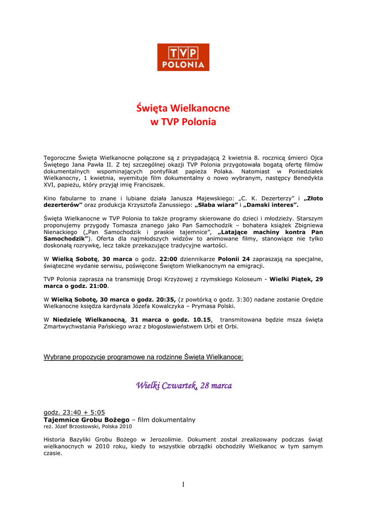 Święta Wielkanocne w TVP Polonia Tegoroczne Święta Wielkanocne połączone są z przypadającą 2 kwietnia 8. rocznicą śmierci Ojca Świętego Jana Pawła II. Z tej szczególnej okazji TVP Polonia przygotowała bogatą ofertę filmów dokumentalnych wspominających pontyfikat papieża Polaka. Natomiast w Poniedziałek Wielkanocny, 1 kwietnia, wyemituje film dokumentalny o nowo wybranym, następcy Benedykta XVI, papieżu, który przyjął imię Franciszek. Kino fabularne to znane i lubiane działa Janusza Majewskiego: „C. K. Dezerterzy” i „Złoto dezerterów” oraz produkcja Krzysztofa Zanussiego: „Słaba wiara” i „Damski interes”. Święta Wielkanocne w TVP Polonia to także programy skierowane do dzieci i młodzieży. Starszym proponujemy przygody Tomasza znanego jako Pan Samochodzik – bohatera książek Zbigniewa Nienackiego („Pan Samochodzik i praskie tajemnice”, „Latające machiny kontra Pan Samochodzik”). Oferta dla najmłodszych widzów to animowane filmy, stanowiące nie tylko doskonałą rozrywkę, lecz także przekazujące tradycyjne wartości. W Wielką Sobotę, 30 marca o godz. 22:00 dziennikarze Polonii 24 zapraszają na specjalne, świąteczne wydanie serwisu, poświęcone Świętom Wielkanocnym na emigracji. TVP Polonia zaprasza na transmisję Drogi Krzyżowej z rzymskiego Koloseum - Wielki Piątek, 29 marca o godz. 21:00. W Wielką Sobotę, 30 marca o godz. 20:35, (z powtórką o godz. 3:30) nadane zostanie Orędzie Wielkanocne księdza kardynała Józefa Kowalczyka – Prymasa Polski. W Niedzielę Wielkanocną, 31 marca o godz. 10.15, transmitowana będzie msza święta Zmartwychwstania Pańskiego wraz z błogosławieństwem Urbi et Orbi. Wybrane propozycje programowe na rodzinne Święta Wielkanoce: Wielki Czwartek, 28 marca godz. 23:40 + 5:05 Tajemnice Grobu Bożego – film dokumentalny reż. Józef Brzostowski, Polska 2010 Historia Bazyliki Grobu Bożego w Jerozolimie. Dokument został zrealizowany podczas świąt wielkanocnych w 2010 roku, kiedy to wszystkie obrządki obchodziły Wielkanoc w tym samym czasie. 1 Wielki Piątek, 29 marca godz. 14:25 Tajemnice Grobu Bożego – film dokumentalny reż. Józef Brzostowski, Polska 2010 Historia Bazyliki Grobu Bożego w Jerozolimie. Dokument został zrealizowany podczas świąt wielkanocnych w 2010 roku, kiedy to wszystkie obrządki obchodziły Wielkanoc w tym samym czasie. godz. 17:55 Jesteś, który Jesteś – koncert 2004 Pieśni wielkanocne w nowych aranżacjach i wykonaniach, przeplatane wierszami Romana Brandstaettera: "Madonna ateistów", "Apostrofa do św. Tomasza Apostoła", "O daj nam Panie natchnienie do wiary", "Jesteś, który jesteś", "Z rozmów z Bogiem", ilustrowanymi muzyką Józefa Skrzeka, a także: "Ludu, mój ludu" w wykonaniu Stanisława Sojki (a capella), "Zwycięzca śmierci" - wykonują Spirituals and Gospel Singers, "Modlitwa" - Grzegorz Markowski, Dariusz Kozakiewicz, Bronisław Duży, "O dniu radosny" - Anna Maria Jopek, "Zbawienie" - Natalia Kukulska, "List do Ciebie" - Grażyna Łobaszewska, Mieczysław Szcześniak, "Chrystus zmartwychwstan jest" Mieczysław Szcześniak, "Chrystusie" - Irena Santor, "Dałeś" - Ines Zaczek, "Pieśń o moim Chrystusie" - Stanisław Sojka, "Wesel się, Królowo" - Grażyna Łobaszewska. godz. 21:00 Transmisja Drogi Krzyżowej z Rzymskiego Koloseum godz. 23:35 + 5:00 Żurek – film fabularny reż. Ryszard Brylski, Polska 2003 W małym przygranicznym miasteczku mieszka Halina zmęczona życiem wdowa z 15-letnią córką Iwonką. Mąż Haliny, Witek, wzorowy ojciec i mąż, kilka miesięcy wcześniej popełnił samobójstwo. Rzucił się pod pociąg w akcie sprzeciwu przeciwko likwidacji połączenia kolejowego, co jego i jego kolegów pozbawiło pracy. Kiedy Iwonka, dziewczyna nieco opóźniona w rozwoju, cierpiąca na padaczkę, rodzi synka, Halina obiecuje Witusowi na grobie, że do Bożego Narodzenia odnajdzie ojca dziecka i ochrzci je, nadając mu imię biologicznego ojca. Nie jest to jednak proste, gdyż Iwonka uparcie odmawia wskazania, kto jej "to zrobił", a przymuszana przez matkę, zaczyna w końcu wskazywać rozmaitych kandydatów. Wszyscy oni zdecydowanie odrzucają pomówienie o ojcostwo, Iwonka sama zresztą wycofuje się z wcześniejszych oskarżeń. Matka, która pragnie dotrzymać danej mężowi obietnicy i zdjąć z rodziny odium hańby, uparcie jednak wędruje z córką i wnukiem od miejsca do miejsca w nadziei, że wreszcie trafi na właściwą osobę. Dąży do prawdy jak ćma do światła, nie myśląc, że może się poparzyć. 2 Wielka Sobota, 30 marca godz. 2:40 + 13:55 Opowieści weekendowe: Słaba wiara Film psychologiczny, reż. Krzysztof Zanussi, Polska 1996 Bohaterami filmu są małżonkowie, Olga i Tomasz, których jedynak, 10 - letni Karol, prawdopodobnie zachorował na białaczkę. Szczegółowe badania mają potwierdzić chorobę, bądź ją wykluczyć. Oczekiwanie na wyniki wywołuje w rodzicach silny stres. Postawieni w sytuacji krańcowej zaczynają desperacką rozmowę na tematy cierpienia i śmierci. Między małżonkami dochodzi do różnicy zdań. Olga oskarża Tomasza o brak wiary w Boga i cud. Tomasz nie dopuszcza zaś do siebie myśli, że jego "słaba wiara" może sprowadzić nieszczęście na syna... godz. 15:00 Moje życie dla Niego – film dokumentalny reż. Ewa Świecińska, Polska 2004 Filmowa opowieść o życiu i pracy zawodowej Arturo Mariego - "nadwornego" fotografa Jana Pawła II. Paweł II był piątym papieżem, którego pontyfikat dokumentował. Swoją pracę w Stolicy Apostolskiej zaczynał jako 16latek, rejestrując na kliszy wizerunki Piusa XII. Od początku pontyfikatu obecnego Jana Pawła II Mari należał do jego najbliższych i najbardziej zaufanych współpracowników. Film o nim jest nie tylko okazją do pokazania jego codziennej pracy, ale także do zaprezentowania ciekawych aspektów historii państwa watykańskiego i panujących tam stosunków. godz. 22:00 + 4:4