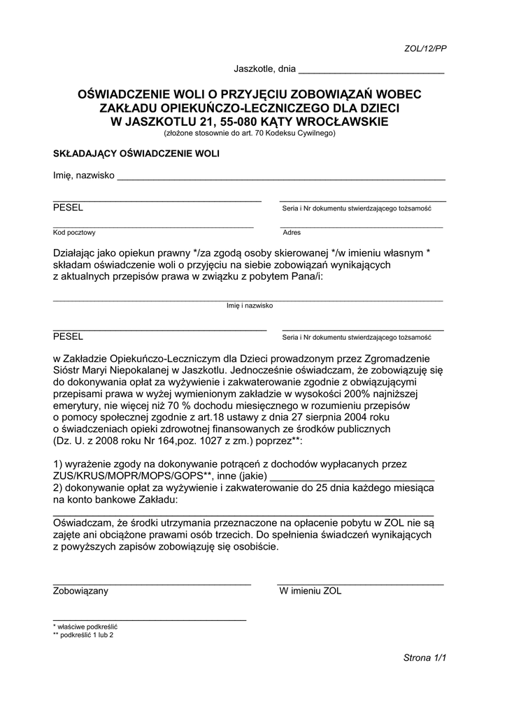 ZOL/12/PP Jaszkotle, dnia ____________________________ OŚWIADCZENIE WOLI O PRZYJĘCIU ZOBOWIĄZAŃ WOBEC ZAKŁADU OPIEKUŃCZO-LECZNICZEGO DLA DZIECI W JASZKOTLU 21, 55-080 KĄTY WROCŁAWSKIE (złożone stosownie do art. 70 Kodeksu Cywilnego) SKŁADAJĄCY OŚWIADCZENIE WOLI Imię, nazwisko _______________________________________________________________ ________________________________________ PESEL ________________________________ _____________________________________________________ Kod pocztowy ___________________________________________ Adres Seria i Nr dokumentu stwierdzającego tożsamość Działając jako opiekun prawny */za zgodą osoby skierowanej */w imieniu własnym * składam oświadczenie woli o przyjęciu na siebie zobowiązań wynikających z aktualnych przepisów prawa w związku z pobytem Pana/i: _______________________________________________________________________________________________________ Imię i nazwisko _________________________________________ PESEL _______________________________ Seria i Nr dokumentu stwierdzającego tożsamość w Zakładzie Opiekuńczo-Leczniczym dla Dzieci prowadzonym przez Zgromadzenie Sióstr Maryi Niepokalanej w Jaszkotlu. Jednocześnie oświadczam, że zobowiązuję się do dokonywania opłat za wyżywienie i zakwaterowanie zgodnie z obwiązującymi przepisami prawa w wyżej wymienionym zakładzie w wysokości 200% najniższej emerytury, nie więcej niż 70 % dochodu miesięcznego w rozumieniu przepisów o pomocy społecznej zgodnie z art.18 ustawy z dnia 27 sierpnia 2004 roku o świadczeniach opieki zdrowotnej finansowanych ze środków publicznych (Dz. U. z 2008 roku Nr 164,poz. 1027 z zm.) poprzez**: 1) wyrażenie zgody na dokonywanie potrąceń z dochodów wypłacanych przez ZUS/KRUS/MOPR/MOPS/GOPS**, inne (jakie) _____________________________ 2) dokonywanie opłat za wyżywienie i zakwaterowanie do 25 dnia każdego miesiąca na konto bankowe Zakładu: ___________________________________________________________________ Oświadczam, że środki utrzymania przeznaczone na opłacenie pobytu w ZOL nie są zajęte ani obciążone prawami osób trzecich. Do spełnienia świadczeń wynikających z powyższych zapisów zobowiązuję się osobiście. ______________________________________ Zobowiązany ________________________________ W imieniu ZOL __________________________________ * właściwe podkreślić ** podkreślić 1 lub 2 Strona 1/1