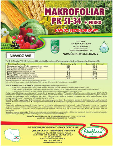 MAKROFOLIAR ® PK 51-34 + MIKRO NAWÓZ BEZCHLORKOWY CERTYFIKAT EN ISO 9001:2008 NR CERT. 80803789/3 certyfikat wydany przez: DEKRA CERTIFICATION Sp. z o.o. NAWÓZ KRYSTALICZNY Typ B.4.: Nawóz PK 51-34 z borem (B), miedzi¹ (Cu), ¿elazem (Fe), manganem (Mn), molibdenem (Mo) i cynkiem (Zn) Sk³adnik pokarmowy Piêciotlenek fosforu (P2O5) rozpuszczalny w wodzie Tlenek potasu (K2O) rozpuszczalny w wodzie Bor (B) rozpuszczalny w wodzie MiedŸ (Cu) rozpuszczalna w wodzie ¯elazo (Fe) rozpuszczalne w wodzie Mangan (Mn) rozpuszczalny w wodzie Molibden (Mo) rozpuszczalny w wodzie Cynk (Zn) rozpuszczalny w wodzie Zawartoœæ w g/kg 510 340 0,8 1,0 0,5 1,5 0,15 1,5 Zawartoœæ w % m/m 51,0 34,0 0,08 0,1 0,05 0,15 0,015 0,15 Wszystkie sk³adniki s¹ ca³kowicie rozpuszczalne w wodzie. Mikrosk³adniki pokarmowe: miedŸ (Cu), ¿elazo (Fe), mangan (Mn), cynk (Zn) schelatowane przez EDTA. MAKROFOLIAR PK 51-34 + MIKRO przeznaczony jest do dolistnego nawo¿enia: • wszystkich upraw rolniczych (rzepak, burak, ziemniak, zbo¿a, kukurydza, roœliny str¹czkowe i inne); • warzywniczych (kapusta, marchew, cebula, ogórek, kalafior, burak æwik³owy, sa³ata, warzywa str¹czkowe i inne); • sadowniczych (jab³oñ, grusza, wiœnia, œliwa, porzeczka, malina, agrest, truskawka i inne). Fosfor jest sk³adnikiem podstawowych zwi¹zków organicznych roœliny. Wchodzi w sk³ad kwasów nukleinowych (DNA, RNA), fosfolipidów, zwi¹zków energetycznych oraz zwi¹zków zapasowych roœliny. Nawo¿enie roœlin fosforem korzystnie wp³ywa na wzrost systemu korzeniowego oraz krzewienie siê zbó¿. Plonotwórcze dzia³anie fosforu przejawia siê tak¿e zwiêkszaniem liczby zawi¹zywanych nasion, skróceniem okresu dojrzewania roœliny. Niedobór fosforu powoduje: Zielononiebieski lub purpurowy odcieñ liœci. • Brunatnienie starszych liœci i pojawienie siê brunatnych plamek. • OpóŸnienie kwitnienia. • Zmniejszenie owocowania. • Zmniejszenie ogólnego wzrostu roœliny i skrócenie oraz pocienienie pêdów. Potas jako podstawowy sk³adnik pokarmowy bierze udzia³ w wielu procesach ¿yciowych roœlin. Wp³ywa korzystnie na: regulacjê gospodarki wodnej roœlin, wielkoœæ systemu korzeniowego, krzewienie oraz obfitoœæ kwitnienia. Zwiêksza odpornoœæ roœlin na choroby, szkodniki, przymrozki i suszê. Poprawia smak warzyw, owoców oraz jakoœæ bulw ziemniaka, które nie ciemniej¹ podczas gotowania. Niedobór potasu powoduje: Znaczne zmniejszenie wzrostu i plonowania roœlin. • Chlorozê starszych liœci i brunatnienie brzegów blaszek liœciowych. •Wyrastanie wiotkich pêdów i zamieranie ich wierzcho³ków. NAWÓZ MAKROFOLIAR PK 51-34+MIKRO GWARANTUJE UZYSKANIE WYSOKICH I DOBRYCH JAKOŒCIOWO PLONÓW! PRZEDSIÊBIORSTWO EKOLOGICZNE ,,EKOFLORA” Siewielec Tadeusz KRAŒNIK ul. Kolejowa 14, 23-200 Kraœnik, Poland tel. 81 825 24 42, 825 20 25, 825 20 27 fax 81 825 23 85 e-mail: [email protected] NIP 715-040-18-27 www.ekoflora.com.pl ® MAKROFOLIAR PK 51-34 + MIKRO ZASADY STOSOWANIA I DAWKI: Zalecana dawka nawozu w kg /ha Zalecana iloœæ cieczy opryskowej w litrach/ha Zbo¿a jare i ozime Stosowanie jesienne: 1. pocz¹tek krzewienia Stosowanie wiosenne: 1. koniec krzewienia 2. w fazie strzelania w ŸdŸb³o W ka¿dym oprysku 3 ÷ 4 250 2. Rzepak jary i ozimy Stosowanie jesienne: 1. druga po³owa paŸdziernika Stosowanie wiosenne: 1. po ruszeniu wegetacji wiosennej lub w fazie formowania ³odygi 2. faza zielonego zwartego p¹ka W ka¿dym oprysku 3 ÷ 5 250 3. Buraki cukrowe i pastewne 1. faza 6-8 liœci 2. 7-14 dni póŸniej 3. przed zwarciem miêdzyrzêdzi W ka¿dym oprysku 3 ÷ 5 250 4. Ziemniaki 1. faza zwierania miêdzyrzêdzi 2. przed kwitnieniem 3. po kwitnieniu W ka¿dym oprysku 3 ÷ 4 250 5. Kukurydza 1. faza 6-8 dobrze wyroœniêtych liœci 2. 7-14 dni póŸniej 3. 7-14 dni póŸniej W ka¿dym oprysku 3 ÷ 5 250 6. Roœliny motylkowe drobnonasienne i str¹czkowe 1. po ruszeniu wegetacji wiosennej lub w fazie 6-8 liœci 2. 14 dni póŸniej W ka¿dym oprysku 3 ÷ 4 250 W ka¿dym oprysku 3 ÷ 5 400 ÷ 600 Lp. Roœlina uprawna Terminy stosowania A. Roœliny uprawy polowej 1. B. Roœliny warzywne Warzywa gruntowe 2 – 3 opryski: 1. po 3 tygodniach od posadzenia rozsady lub ukorzenieniu siê roœlin z siewu 2. nastêpne co 7-14 dni 8. Drzewa owocowe 3 – 4 opryski: 1. przed kwitnieniem 2. po kwitnieniu 3. w okresie dojrzewania owoców co 10 – 14 dni W ka¿dym oprysku 3 ÷ 4 500 ÷ 1000 9. Truskawki, maliny, porzeczki, agrest, aronia 2 – 3 opryski: 1. przed kwitnieniem 2. w fazie rozwoju owoców co 7-14 dni W ka¿dym oprysku 3 ÷ 4 400 ÷ 600 £¹ki i pastwiska 2 – 3 opryski: co 10 -14 dni w fazie intensywnego wzrostu W ka¿dym oprysku 3 ÷ 4 200 ÷ 300 7. C. Roœliny sadownicze D. Inne uprawy 10. Przygotowanie cieczy u¿ytkowej Zalecan¹ dawkê Makrofoliar® PK 51-34 + MIKRO rozpuœciæ w wodzie w proporcji 1kg nawozu na 5 litrów wody i wlaæ do opryskiwacza nape³nionego wod¹ w 2/3 objêtoœci, przy stale w³¹czonym mieszadle. Zbiornik uzupe³niæ wod¹ do ¿¹danej objêtoœci. Ciecz zu¿yæ w ci¹gu kilku godzin od przygotowania. Ciecz u¿ytkowa winna mieæ temperaturê minimum 10 C °. Przy sporz¹dzaniu cieczy u¿ytkowej u¿ywaæ gumowych rêkawic i okularów ochronnych. Przestrzegaæ zasad higieny. Nie nale¿y wykonywaæ oprysków przy wysokich temperaturach, niskiej wilgotnoœci powietrza, jak równie¿ przed spodziewanym przymrozkiem i opadami deszczu. Oprysk najlepiej wykonywaæ w czasie pochmurnej, bezdeszczowej pogody, najkorzystniej wieczorem. Œrodki ostro¿noœci Chroniæ przed dzieæmi. W przypadku rozsypania zebraæ z powierzchni i sp³ukaæ wod¹. Nie spo¿ywaæ. W przypadku spo¿ycia skontaktowaæ siê z lekarzem. W przypadku zanieczyszczenia oczu przep³ukaæ du¿¹ iloœci¹ wody, a przy podra¿nieniu skontaktowaæ siê z lekarzem. PRZEDSIÊBIORSTWO EKOLOGICZNE ,,EKOFLORA” Siewielec Tadeusz KRAŒNIK ul. Kolejowa 14, 23-200 Kraœnik, Poland tel. 81 825 24 42, 825 20 25, 8