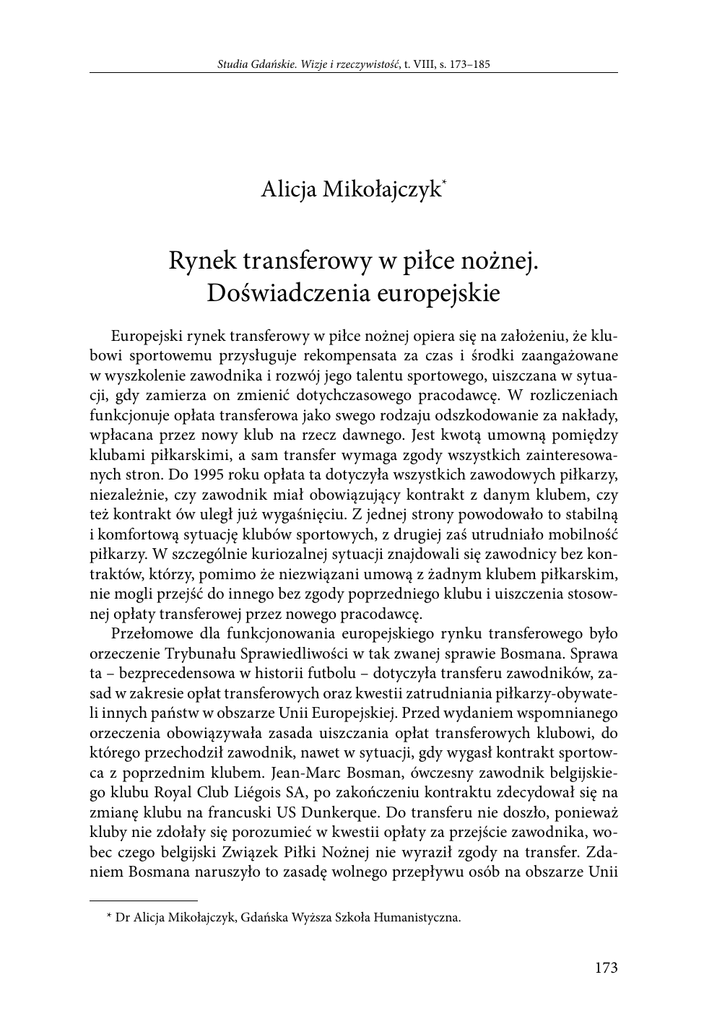 Studia Gdańskie. Wizje i rzeczywistość, t. VIII, s. 173–185 Alicja Mikołajczyk* Rynek transferowy w piłce nożnej. Doświadczenia europejskie Europejski rynek transferowy w piłce nożnej opiera się na założeniu, że klu bowi sportowemu przysługuje rekompensata za czas i środki zaangażowane w wyszkolenie zawodnika i rozwój jego talentu sportowego, uiszczana w sytua cji, gdy zamierza on zmienić dotychczasowego pracodawcę. W rozliczeniach funkcjonuje opłata transferowa jako swego rodzaju odszkodowanie za nakłady, wpłacana przez nowy klub na rzecz dawnego. Jest kwotą umowną pomiędzy klubami piłkarskimi, a sam transfer wymaga zgody wszystkich zainteresowa nych stron. Do 1995 roku opłata ta dotyczyła wszystkich zawodowych piłkarzy, niezależnie, czy zawodnik miał obowiązujący kontrakt z danym klubem, czy też kontrakt ów uległ już wygaśnięciu. Z jednej strony powodowało to stabilną i komfortową sytuację klubów sportowych, z drugiej zaś utrudniało mobilność piłkarzy. W szczególnie kuriozalnej sytuacji znajdowali się zawodnicy bez kon traktów, którzy, pomimo że niezwiązani umową z żadnym klubem piłkarskim, nie mogli przejść do innego bez zgody poprzedniego klubu i uiszczenia stosow nej opłaty transferowej przez nowego pracodawcę. Przełomowe dla funkcjonowania europejskiego rynku transferowego było orzeczenie Trybunału Sprawiedliwości w tak zwanej sprawie Bosmana. Sprawa ta – bezprecedensowa w historii futbolu – dotyczyła transferu zawodników, za sad w zakresie opłat transferowych oraz kwestii zatrudniania piłkarzy-obywate li innych państw w obszarze Unii Europejskiej. Przed wydaniem wspomnianego orzeczenia obowiązywała zasada uiszczania opłat transferowych klubowi, do którego przechodził zawodnik, nawet w sytuacji, gdy wygasł kontrakt sportow ca z poprzednim klubem. Jean-Marc Bosman, ówczesny zawodnik belgijskie go klubu Royal Club Liégois SA, po zakończeniu kontraktu zdecydował się na zmianę klubu na francuski US Dunkerque. Do transferu nie doszło, ponieważ kluby nie zdołały się porozumieć w kwestii opłaty za przejście zawodnika, wo bec czego belgijski Związek Piłki Nożnej nie wyraził zgody na transfer. Zda niem Bosmana naruszyło to zasadę wolnego przepływu osób na obszarze Unii * Dr Alicja Mikołajczyk, Gdańska Wyższa Szkoła Humanistyczna. 173 Alicja Mikołajczyk Europejskiej. Zawodnik skierował do sądu sprawę o odszkodowanie za utraco ny zarobek, wnioskując o wydanie orzeczenia w trybie prejudycjalnym przez Trybunał Sprawiedliwości Wspólnot Europejskich. W dniu 15 grudnia 1995 roku Trybunał Sprawiedliwości na podstawie artykułu 48 Traktatu Rzymskie go uznał roszczenie Bosmana za zasadne i stwierdził za niewłaściwe pobieranie opłat transferowych w przypadku przejścia zawodnika będącego obywatelem kraju członkowskiego UE do klubu z innego kraju członkowskiego po wygaś nięciu kontraktu w macierzystym klubie piłkarza. Ponadto orzekł, że kluby pił karskie nie mogą ograniczać liczby obcokrajowców w swoim składzie, o ile są to obywatele krajów członkowskich UE. Konsekwencje orzeczenia Europejskiego Trybunału Sprawiedliwości dla roz woju sportu szybko stały się widoczne. Kluby angielskie niebawem odnotowały znaczny wzrost liczby piłkarzy mających obywatelstwo kraju członkowskiego UE innego niż Wielka Brytania. Wzrosły też kwoty wydawane na transfer za granicznych zawodników do klubów angielskich. Cała ta sytuacja spowodowa ła, że kluby zaczęły podpisywać z piłkarzami kontrakty długoterminowe, by ograniczyć ryzyko częstej zmiany klubu przez sportowców. Sprawa Bosmana zliberalizowała rynek transferowy i, co ważniejsze, pokazała, że sport, pomimo swojej szczególnej roli, jaką odgrywa w społeczeństwie, jeśli zaangażowany jest w działalność gospodarczą, tak jak każdy pozostały sektor gospodarki stanowi przedmiot prawa Unii Europejskiej. Zgodnością przeprowadzanych transferów w piłce nożnej z obowiązującym na obszarze Unii Europejskiej prawem zainteresowała się Komisja Europejska, uznając regulacje FIFA w tym zakresie za sprzeczne z prawem Unii. W 2000 roku Unia Europejska wystąpiła przeciw FIFA, wzywając organizację do dosto sowania zasad transferów do obowiązujących regulacji prawnych UE. W marcu 2001 roku doszło do porozumienia pomiędzy komisarzami unijnymi a prze wodniczącymi FIFA i UEFA, 5 kwietnia 2001 roku zaś, podczas światowego kongresu FIFA w Buenos Aires, Komitet Wykonawczy FIFA przyjął nowe prze pisy regulujące międzynarodowe transfery piłkarskie (Principles for the amendment of FIFA rules regarding international transfers). W preambule przepisów zawarto zapisy wynikające z orzeczenia Trybunału Sprawiedliwości w sprawie Bosmana, umożliwiające zmianę klubu przez piłkarza po wygaśnięciu kontrak tu. Objęto ochroną nieletnich sportowców w zakresie dotyczącym możliwości przemieszczania się rodziny sportowca na terenie danego kraju, dostępu do Sprawa C-415/93 Trybunału Sprawiedliwości z dnia 15 grudnia 1995 roku w sprawie Union royale belge des sociétés de football association ASBL przeciwko Jean-Marc Bosman, Royal Club Liégeois SA przeciwko Jean-Marc Bosman i innym oraz Union des associations européennes de football (UEFA) przeciwko Jean-Marc Bosman, http://eur-lex.europa.eu/LexUriServ/LexUriServ. do?uri=CELEX:61993J0415:EN:HTML (dostęp: 28.02.2011 r.). G. Jarvie, Sport, culture and society: an introduction, Routledge, Abingdon 2006, s. 153. S. Gardiner, J. O’Leary, R. Welch, S. Boyes, U. Naidoo, Sports law, Cavendish Publishing Limited, London 2006, s. 513−516. 174 Rynek transferowy w piłce nożnej. Doświadczenia europejskie edukacji oraz zasad wypłaty rekompensaty za szkolenie zawodnika. Określono czas trwania kontraktów pomiędzy sportowcem a klubem, który może wyno sić od 1 roku do 5 lat. Ustalono okres ochronny kontraktów, wynoszący 3 lata dla zawodników po