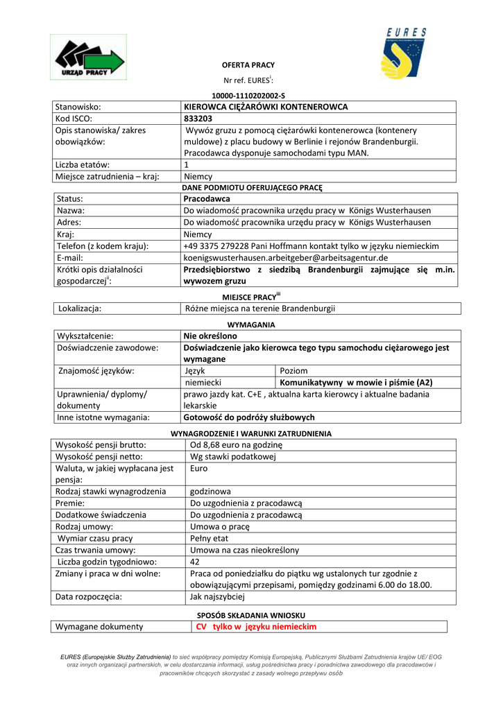 OFERTA PRACY i Nr ref. EURES : 10000-1110202002-S Stanowisko: Kod ISCO: Opis stanowiska/ zakres obowiązków: KIEROWCA CIĘŻARÓWKI KONTENEROWCA 833203 Wywóz gruzu z pomocą ciężarówki kontenerowca (kontenery muldowe) z placu budowy w Berlinie i rejonów Brandenburgii. Pracodawca dysponuje samochodami typu MAN. 1 Niemcy Liczba etatów: Miejsce zatrudnienia – kraj: DANE PODMIOTU OFERUJĄCEGO PRACĘ Status: Nazwa: Adres: Kraj: Telefon (z kodem kraju): E-mail: Krótki opis działalności gospodarczejii: Pracodawca Do wiadomość pracownika urzędu pracy w Königs Wusterhausen Do wiadomość pracownika urzędu pracy w Königs Wusterhausen Niemcy +49 3375 279228 Pani Hoffmann kontakt tylko w języku niemieckim [email protected] Przedsiębiorstwo z siedzibą Brandenburgii zajmujące się m.in. wywozem gruzu MIEJSCE PRACY iii Lokalizacja: Różne miejsca na terenie Brandenburgii Wykształcenie: Doświadczenie zawodowe: Nie określono Doświadczenie jako kierowca tego typu samochodu ciężarowego jest wymagane Język Poziom niemiecki Komunikatywny w mowie i piśmie (A2) prawo jazdy kat. C+E , aktualna karta kierowcy i aktualne badania lekarskie Gotowość do podróży służbowych WYMAGANIA Znajomość języków: Uprawnienia/ dyplomy/ dokumenty Inne istotne wymagania: WYNAGRODZENIE I WARUNKI ZATRUDNIENIA Wysokość pensji brutto: Wysokość pensji netto: Waluta, w jakiej wypłacana jest pensja: Rodzaj stawki wynagrodzenia Premie: Dodatkowe świadczenia Rodzaj umowy: Wymiar czasu pracy Czas trwania umowy: Liczba godzin tygodniowo: Zmiany i praca w dni wolne: Data rozpoczęcia: Od 8,68 euro na godzinę Wg stawki podatkowej Euro godzinowa Do uzgodnienia z pracodawcą Do uzgodnienia z pracodawcą Umowa o pracę Pełny etat Umowa na czas nieokreślony 42 Praca od poniedziałku do piątku wg ustalonych tur zgodnie z obowiązującymi przepisami, pomiędzy godzinami 6.00 do 18.00. Jak najszybciej SPOSÓB SKŁADANIA WNIOSKU Wymagane dokumenty CV tylko w języku niemieckim EURES (Europejskie Służby Zatrudnienia) to sieć współpracy pomiędzy Komisją Europejską, Publicznymi Służbami Zatrudnienia krajów UE/ EOG oraz innych organizacji partnerskich, w celu dostarczania informacji, usług pośrednictwa pracy i poradnictwa zawodowego dla pracodawców i pracowników chcących skorzystać z zasady wolnego przepływu osób Język, w którym muszą być sporządzone przedkładane dokumenty: Do kogo należy wysłać dokumenty: niemiecki Anna Uberman - Asystent EURES WUP Zielona Góra z podanym numerem referencyjnym oferty- 10000-111020202-S Kierowca ciężarówki -kontenerowca Gdzie należy wysłać dokumenty: Dane teleadresowe doradcy EURES lub przedstawiciela pracodawcy: Data publikacji: Termin przedkładania podań o pracę / zakończenia ważności oferty: [email protected] Anna Uberman Asystent EURES [email protected] Tel.: 68 456 77 09 Wojewódzki Urząd Pracy w Zielonej Górze Ul. Wyspiańskiego 15 Zielona Góra WAŻNOŚĆ 05.09.2014 Do odwołania Uprzejmie informujemy, że skontaktujemy się wyłącznie z wybranymi kandydatami. Umowa z zagranicznym pracodawcą zostanie zawarta zgodnie z prawem kraju zatrudnienia. Oznacza to, że wszystkie roszczenia odnośnie do warunków, które obejmuje umowa, można kierować wyłącznie do odpowiedniego sądu w kraju zatrudnienia. Publiczne służby zatrudnienia (EURES) nie mogą pośredniczyć ani reprezentować pracownika w sądzie kraju zatrudnienia w przypadku sporu z pracodawcą. Publiczne służby zatrudnienia (EURES) dokładają wszelkich starań, aby zapewnić rzetelność i wiarygodność ofert pracy zgłoszonych w lokalnym urzędzie pracy. Należy wyjaśnić, że oferta pracy została zgłoszona przez stronę trzecią i EURES nie odpowiada za ewentualne rozbieżności między warunkami pracy określonymi w ofercie pracy i warunkami oferowanymi przez potencjalnego pracodawcę. Publiczne służby zatrudnienia (EURES) informują, że będą zbierać, przetwarzać i przekazywać potencjalnym pracodawcom zgodnie z przepisami dotyczącymi ochrony danych osobowych wszystkie dane osobowe dostarczone przez osoby poszukujące pracy. i Nr ref. na portalu EURES www.eures.europa.eu . Dotyczy ofert pracy publicznych służb zatrudnienia, których bazy danych ofert pracy nie są połączone z portalem EURES. ii Informacje o firmie, takie jak: status prawny, sektor, typ działalności, rodzaj produktów lub świadczonych usług, data rozpoczęcia działalności gospodarczej, liczba pracowników itp. iii Miejsce, w którym będzie wykonywana praca. Należy wypełnić w przypadku gdy: 1) miejsce wykonywania pracy jest inne niż siedziba podmiotu oferującego pracę, 2) pracę oferuje agencja pośrednictwa pracy/ agencja pracy tymczasowej. EURES (Europejskie Służby Zatrudnienia) to sieć współpracy pomiędzy Komisją Europejską, Publicznymi Służbami Zatrudnienia krajów UE/ EOG oraz innych organizacji partnerskich, w celu dostarczania informacji, usług pośrednictwa pracy i poradnictwa zawodowego dla pracodawców i pracowników chcących skorzystać z zasady wolnego przepływu osób