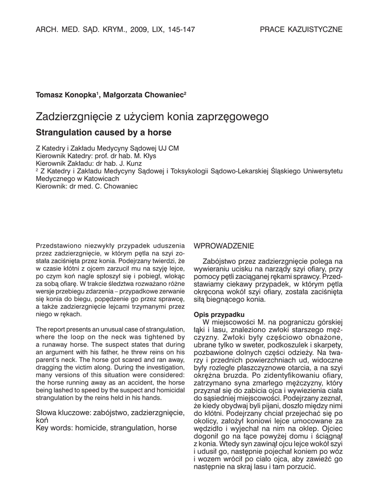 ARCH. MED. SĄD. KRYM., 2009, LIX, 145-147 PRACE KAZUISTYCZNE Tomasz Konopka1, Małgorzata Chowaniec2 Zadzierzgnięcie z użyciem konia zaprzęgowego Strangulation caused by a horse Z Katedry i Zakładu Medycyny Sądowej UJ CM Kierownik Katedry: prof. dr hab. M. Kłys Kierownik Zakładu: dr hab. J. Kunz 2 Z Katedry i Zakładu Medycyny Sądowej i Toksykologii Sądowo-Lekarskiej śląskiego Uniwersytetu Medycznego w Katowicach Kierownik: dr med. C. Chowaniec Przedstawiono niezwykły przypadek uduszenia przez zadzierzgnięcie, w którym pętla na szyi została zaciśnięta przez konia. Podejrzany twierdzi, że w czasie kłótni z ojcem zarzucił mu na szyję lejce, po czym koń nagle spłoszył się i pobiegł, wlokąc za sobą ofiarę. W trakcie śledztwa rozważano różne wersje przebiegu zdarzenia – przypadkowe zerwanie się konia do biegu, popędzenie go przez sprawcę, a także zadzierzgnięcie lejcami trzymanymi przez niego w rękach. The report presents an unusual case of strangulation, where the loop on the neck was tightened by a runaway horse. The suspect states that during an argument with his father, he threw reins on his parent’s neck. The horse got scared and ran away, dragging the victim along. During the investigation, many versions of this situation were considered: the horse running away as an accident, the horse being lashed to speed by the suspect and homicidal strangulation by the reins held in his hands. Słowa kluczowe: zabójstwo, zadzierzgnięcie, koń Key words: homicide, strangulation, horse WPROWADZENIE Zabójstwo przez zadzierzgnięcie polega na wywieraniu ucisku na narządy szyi ofiary, przy pomocy pętli zaciąganej rękami sprawcy. Przedstawiamy ciekawy przypadek, w którym pętla okręcona wokół szyi ofiary, została zaciśnięta siłą biegnącego konia. Opis przypadku W miejscowości M. na pograniczu górskiej łąki i lasu, znaleziono zwłoki starszego mężczyzny. Zwłoki były częściowo obnażone, ubrane tylko w sweter, podkoszulek i skarpety, pozbawione dolnych części odzieży. Na twarzy i przednich powierzchniach ud, widoczne były rozległe płaszczyznowe otarcia, a na szyi okrężna bruzda. Po zidentyfikowaniu ofiary, zatrzymano syna zmarłego mężczyzny, który przyznał się do zabicia ojca i wywiezienia ciała do sąsiedniej miejscowości. Podejrzany zeznał, że kiedy obydwaj byli pijani, doszło między nimi do kłótni. Podejrzany chciał przejechać się po okolicy, założył koniowi lejce umocowane za wędzidło i wyjechał na nim na oklep. Ojciec dogonił go na łące powyżej domu i ściągnął z konia. Wtedy syn zawinął ojcu lejce wokół szyi i udusił go, następnie pojechał koniem po wóz i wozem wrócił po ciało ojca, aby zawieźć go następnie na skraj lasu i tam porzucić. 146 Tomasz Konopka Sekcja zwłok, wykonana w Zakładzie Medycyny Sądowej w Katowicach, wykazała rozległe, płaszczyznowe ubytki naskórka barwy wiśniowej, obejmujące całą prawą część twarzy oraz przednie powierzchnie obydwu ud (ryc. 1), okrężną bruzdę na szyi, pęknięcie skóry na przedniej powierzchni szyi, wybroczyny krwawe pod spojówkami. Badanie wewnętrzne narządów szyi wykazało wylewy krwawe w torebce tarczycy i przydankach tętnic szyjnych oraz wokół chrząstki tarczowatej i kości gnykowej, które jednak nie okazywały złamań, a także podbiegnięcia krwawe na przedniej powierzchni kręgosłupa szyjnego. Ponadto stwierdzono obecność głęboko zaaspirowanej treści pokarmowej w drogach oddechowych oraz podbiegnięcie krwawe korzenia krezki jelita cienkiego i okolicy trzustki. Ryc. 1. Rozległe ubytki naskórka powstałe wskutek wleczenia ciała. Fig. 1. Extensive abrasions due to the body being dragged. W trzy miesiące później podejrzany odwołał swoje zeznania, twierdząc, że zostały mu narzucone przez przesłuchujących. Naprawdę zdarzenie miało wyglądać następująco: kiedy ojciec dogonił go na łące i ściągnął z konia, zaczęli się szarpać a ojciec mówił, że koń jest jego. Wtedy podejrzany miał powiedzieć „jak koń jest twój, to masz” i zarzucił mu lejce na szyję. Wskutek szamotaniny miało dojść do okręcenia lejc wokół szyi ojca, wtedy koń nagle przestraszył się, szarpnął i pobiegł w dół do zagrody, wlokąc ciało po trawie około 200 m. Nr 2 DYSKUSJA W przedstawionej sprawie opiniowały trzy zespoły biegłych i zgodnie przyjęto, że śmierć nastąpiła w mechanizmie zadzierzgnięcia ofiary, wleczonej za szyję przez konia. Ponadto część biegłych skłaniała się ku pierwszej wersji podejrzanego, mówiącej, że przed wleczeniem przez konia, ofiara była najpierw duszona przez niego lejcami. Na śmierć w wyniku wleczenia za szyję po ziemi, wskazywały z jednej strony okrężna bruzda i wylewy krwawe w tkankach miękkich szyi, z drugiej rozległe płaszczyznowe otarcia a właściwie szerokie ubytki dużych powierzchni naskórka na twarzy i przodzie ud (ryc. 1). Tego typu ślad, znany jest z sekcji zwłok ofiar wypadków drogowych – pieszych wleczonych przez pojazd. Istniały wprawdzie pewne wątpliwości, lejce były bowiem zapięte za wędzidło, co oznacza, że koń de facto musiał ciągnąć ciało pyskiem. Lejc używa się tylko do kierowania koniem, do ciągnięcia ciężarów zapina się uprząż umocowaną na klatce piersiowej zwierzęcia. W czasie eksperymentu, kiedy do dowodowych lejc (długości 6 m) umocowano manekina, koń nie chciał go ciągnąć. Biegły zootechnik stwierdził jednak, że w sytuacji stresującej dla zwierzęcia, jaką była szamotanina tuż przy nim dwóch pijanych osób, koń istotnie mógł pociągnąć pyskiem ciężar ciała ludzkiego, zwłaszcza, że ciągnął je po mokrej trawie, po lekkiej pochyłości w dół. W niniejszej sprawie można rozpatrywać trzy wersje zdarzenia. Według pierwszej z nich, ciągnięcie przez konia było tylko epizodem kończącym zabójstwo, rozpoczęte wcześniej przez syna ofiary. W te