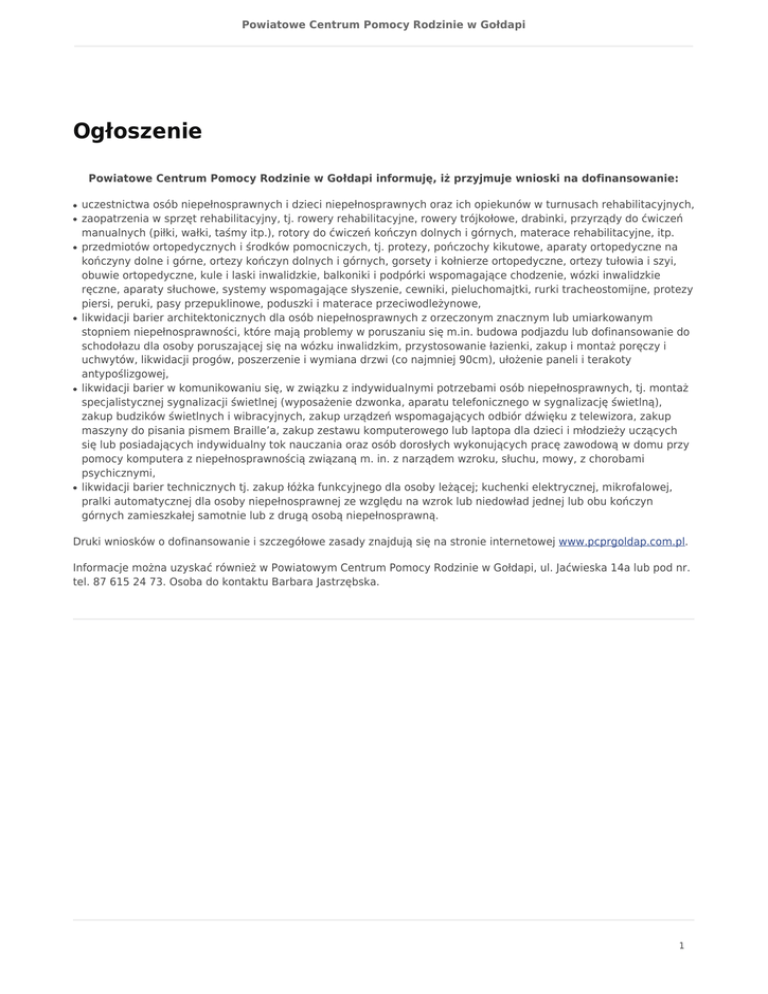 Powiatowe Centrum Pomocy Rodzinie w Gołdapi Ogłoszenie Powiatowe Centrum Pomocy Rodzinie w Gołdapi informuję, iż przyjmuje wnioski na dofinansowanie: ● ● ● ● ● ● uczestnictwa osób niepełnosprawnych i dzieci niepełnosprawnych oraz ich opiekunów w turnusach rehabilitacyjnych, zaopatrzenia w sprzęt rehabilitacyjny, tj. rowery rehabilitacyjne, rowery trójkołowe, drabinki, przyrządy do ćwiczeń manualnych (piłki, wałki, taśmy itp.), rotory do ćwiczeń kończyn dolnych i górnych, materace rehabilitacyjne, itp. przedmiotów ortopedycznych i środków pomocniczych, tj. protezy, pończochy kikutowe, aparaty ortopedyczne na kończyny dolne i górne, ortezy kończyn dolnych i górnych, gorsety i kołnierze ortopedyczne, ortezy tułowia i szyi, obuwie ortopedyczne, kule i laski inwalidzkie, balkoniki i podpórki wspomagające chodzenie, wózki inwalidzkie ręczne, aparaty słuchowe, systemy wspomagające słyszenie, cewniki, pieluchomajtki, rurki tracheostomijne, protezy piersi, peruki, pasy przepuklinowe, poduszki i materace przeciwodleżynowe, likwidacji barier architektonicznych dla osób niepełnosprawnych z orzeczonym znacznym lub umiarkowanym stopniem niepełnosprawności, które mają problemy w poruszaniu się m.in. budowa podjazdu lub dofinansowanie do schodołazu dla osoby poruszającej się na wózku inwalidzkim, przystosowanie łazienki, zakup i montaż poręczy i uchwytów, likwidacji progów, poszerzenie i wymiana drzwi (co najmniej 90cm), ułożenie paneli i terakoty antypoślizgowej, likwidacji barier w komunikowaniu się, w związku z indywidualnymi potrzebami osób niepełnosprawnych, tj. montaż specjalistycznej sygnalizacji świetlnej (wyposażenie dzwonka, aparatu telefonicznego w sygnalizację świetlną), zakup budzików świetlnych i wibracyjnych, zakup urządzeń wspomagających odbiór dźwięku z telewizora, zakup maszyny do pisania pismem Braille’a, zakup zestawu komputerowego lub laptopa dla dzieci i młodzieży uczących się lub posiadających indywidualny tok nauczania oraz osób dorosłych wykonujących pracę zawodową w domu przy pomocy komputera z niepełnosprawnością związaną m. in. z narządem wzroku, słuchu, mowy, z chorobami psychicznymi, likwidacji barier technicznych tj. zakup łóżka funkcyjnego dla osoby leżącej; kuchenki elektrycznej, mikrofalowej, pralki automatycznej dla osoby niepełnosprawnej ze względu na wzrok lub niedowład jednej lub obu kończyn górnych zamieszkałej samotnie lub z drugą osobą niepełnosprawną. Druki wniosków o dofinansowanie i szczegółowe zasady znajdują się na stronie internetowej www.pcprgoldap.com.pl. Informacje można uzyskać również w Powiatowym Centrum Pomocy Rodzinie w Gołdapi, ul. Jaćwieska 14a lub pod nr. tel. 87 615 24 73. Osoba do kontaktu Barbara Jastrzębska. 1
