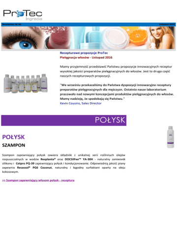 Newsletter Nr 65 Listopad 2016 Recepturowe propozycje ProTec Pielęgnacja włosów - Listopad 2016 Mamy przyjemność przedstawić Państwu propozycje innowacyjnych receptur wysokiej jakości preparatów pielęgnacyjnych do włosów. Jest to druga część naszych recepturowych propozycji. "We wrześniu przekazaliśmy do Państwa dyspozycji innowacyjne receptury preparatów pielęgnacyjnych dla mężczyzn. Ostatnio nasze laboratorium pracowało nad nowymi koncepcjami produktów pielęgnacyjnych do włosów. Mamy nadzieję, że spodobają się Państwu." Kevin Cousins, Sales Director POŁYSK POŁYSK SZAMPON Szampon zapewniający połysk zawiera składniki z unikalnej serii roślinnych olejów rozpuszczalnych w wodzie Resplanta® oraz DOCSilFee™ YA-30H - naturalny zamiennik silikonu i Cetpro PQ-39 zapewniający połysk i kondycjonowanie. Odpowiednią jakość piany zapewnia Resassol® PG6 Coconut, naturalny i łagodny surfaktant oparty na oleju kokosowym. >> Szampon zapewniający włosom połysk - receptura POŁYSK ODŻYWKA Nasza bogata, luksusowa odżywka zawiera składniki z unikalnej serii roślinnych olejów rozpuszczalnych w wodzie Resplanta® oraz DOCSilFee™ YA-30H (naturalny zamiennik silikonów), DOCNATURA CJSO (Camellia Japonica Seed Oil) i Cetpro PQ-39. Zapewnia włosom piękny blask i połysk, bez uczucia tłustości. >> Odżywka zapewniająca włosom połysk - receptura POŁYSK OLEJEK Olejek zapewniający połysk to luksusowa mieszanina 5 naturalnych olejów przeznaczonych do pielęgnacji wszystkich rodzajów włosów. Ulega szybkiej absorbcji, pozostawiając włosy gładkie, miękkie i pęknie błyszczące. Nietłuszczący produkt może być stosowany zarówno na włosy mokre, jak i suche. >> Olejek zapewniający włosom połysk - receptura OBJĘTOŚĆ OBJĘTOŚĆ SZAMPON W szamponie połączyliśmy nasze nowe rozpuszczalne w wodzie oleje roślinne Resplanta® ze składnikami zapewniającymi objętość: DOCQUAT-10V i Cetpro PQ-11. Właściwości piany poprawia Resassol® PG6 Coconut, naturalny i łagodny surfaktant oparty na oleju kokosowym. >> Szampon zwiększający objętość włosów - receptura OBJĘTOŚĆ SERUM Nasze serum do włosów zawiera AnaGain™, składnik o udowodnionej skuteczności reaktywacji wzrostu włosów poprzez bezpośrednie działanie na komórki brodawek skóry, które odgrywają kluczową rolę w cyklu wzrostu włosa. Serum zawiera również RootBioTec HW, który przywraca gęstość włosów dzięki inhibicji 5-reduktazy i stymuluje mieszki włosowe. Nasza Organiczna Gliceryna zapewnia nawilżenie. >> Serum zwiększające objetość włosów - receptura KOLOR KOLOR SZAMPON Luksusowy szampon nie zawierający olejów i silikonów. Floraesters K-20W Jojoba kondycjonuje włosy, ułatwiając układanie na mokro, pozostawia włosy miękkie i łatwe do układania. Skuteczność ochrony koloru przez Floraesters K-20W Jojoba została udowodniona w badaniach. >> Szampon chroniący kolor - receptura KOLOR ODŻYWKA Odżywka nie zawiera związków czwartorzędowych i silikonów. Floraesters K-100 Jojoba kondycjonuje włosy, zapobiega elektryzowaniu i chroni kolor. Połączenie Floramac 10, Floramac Macadamia Oil i Floralipids Moringa Butter zapewnia połysk, miękkość i ułatwia układanie. >> Odżywka chroniąca kolor włosów - receptura KOLOR OLEJEK Nasz specjalny lekki olejek przeznaczony jest do ochrony matowych i pozbawionych koloru włosów. Oat Lipid e jest bogaty w lipidy, włączając ceramidy i sterole, oraz naturalne antyoksydanty. Nietłuszczący produkt może być stosowany zarówno na włosy mokre, jak i suche. >> Olejek poprawiający kolor włosów - receptura NAWILŻANIE NAWILŻANIE SZAMPON Nasz szampon nawilżający pielęgnuje włosy suche i zniszczone, kondycjonuje i wygładza. Łączy unikalne rozpuszczalne w wodzie oleje Resplanta® z Floviva Baobab Oil i kationowymi kondycjonerami Cetpro. Zawiera również łagodny i naturalny surfaktant Resassol® PG6 Coconut. >> Szampon nawilżający - receptura NAWILŻANIE ODŻYWKA Odżywka nawilżająca jest specjalnie przeznaczona do pielęgnacji włosów suchych, zniszczonych, przywraca żywy blask i nawilża. Bogata receptura zawiera rozpuszczalne w wodzie oleje z serii Resplanta®, Floviva Baobab Oil, DOCSilFee™ YA-30H (naturalny zamiennik silikonów) i kationowe kondycjonery Cetpro. >> Odżywka nawilżająca - receptura NAWILŻANIE OLEJEK Lekki olejek o działaniu nawilżającym, idealny do pielęgnacji włosów suchych, zniszczonych i pozbawionych witalności. Zawiera 4 naturalne oleje nawilżające, pozostawia włosy nawilżone i pięknie lśniące. Nietłuszczący produkt może być stosowany zarówno na włosy mokre, jak i suche. >> Olejek nawilżający - receptura W celu otrzymania szerszych informacji, próbek lub oferty prosimy o kontakt. ProTec Ingredia Polska Sp. z o.o. ul. Berezyńska 6A, 03-904 Warszawa www.protecingredia.pl