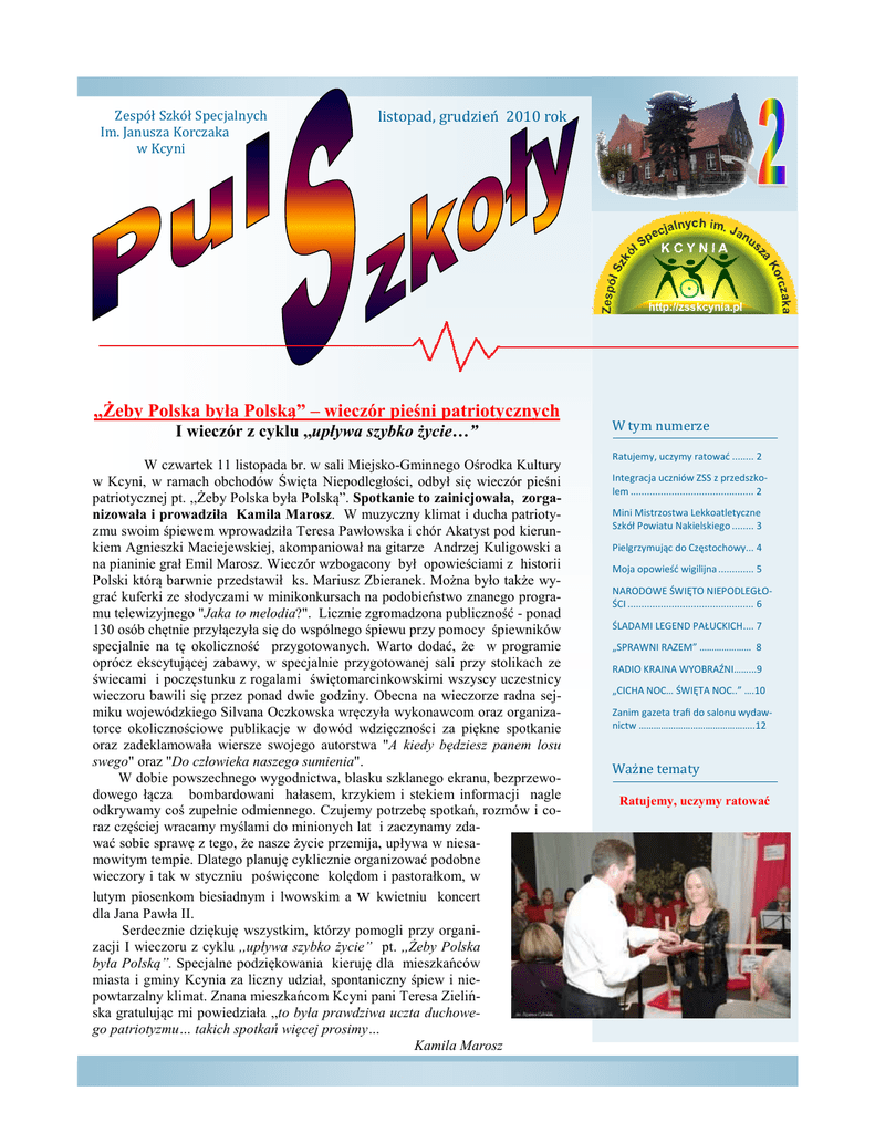 Zespó ł Szkó ł Specjalnych Im. Janusza Korczaka w Kcyni listopad, grudzień 2010 rok ,,Żeby Polska była Polską” – wieczór pieśni patriotycznych I wieczór z cyklu ,,upływa szybko życie…” W czwartek 11 listopada br. w sali Miejsko-Gminnego Ośrodka Kultury w Kcyni, w ramach obchodów Święta Niepodległości, odbył się wieczór pieśni patriotycznej pt. ,,Żeby Polska była Polską”. Spotkanie to zainicjowała, zorganizowała i prowadziła Kamila Marosz. W muzyczny klimat i ducha patriotyzmu swoim śpiewem wprowadziła Teresa Pawłowska i chór Akatyst pod kierunkiem Agnieszki Maciejewskiej, akompaniował na gitarze Andrzej Kuligowski a na pianinie grał Emil Marosz. Wieczór wzbogacony był opowieściami z historii Polski którą barwnie przedstawił ks. Mariusz Zbieranek. Można było także wygrać kuferki ze słodyczami w minikonkursach na podobieństwo znanego programu telewizyjnego "Jaka to melodia?". Licznie zgromadzona publiczność - ponad 130 osób chętnie przyłączyła się do wspólnego śpiewu przy pomocy śpiewników specjalnie na tę okoliczność przygotowanych. Warto dodać, że w programie oprócz ekscytującej zabawy, w specjalnie przygotowanej sali przy stolikach ze świecami i poczęstunku z rogalami świętomarcinkowskimi wszyscy uczestnicy wieczoru bawili się przez ponad dwie godziny. Obecna na wieczorze radna sejmiku wojewódzkiego Silvana Oczkowska wręczyła wykonawcom oraz organizatorce okolicznościowe publikacje w dowód wdzięczności za piękne spotkanie oraz zadeklamowała wiersze swojego autorstwa "A kiedy będziesz panem losu swego" oraz "Do człowieka naszego sumienia". W dobie powszechnego wygodnictwa, blasku szklanego ekranu, bezprzewodowego łącza bombardowani hałasem, krzykiem i stekiem informacji nagle odkrywamy coś zupełnie odmiennego. Czujemy potrzebę spotkań, rozmów i coraz częściej wracamy myślami do minionych lat i zaczynamy zdawać sobie sprawę z tego, że nasze życie przemija, upływa w niesamowitym tempie. Dlatego planuję cyklicznie organizować podobne wieczory i tak w styczniu poświęcone kolędom i pastorałkom, w lutym piosenkom biesiadnym i lwowskim a w kwietniu koncert dla Jana Pawła II. Serdecznie dziękuję wszystkim, którzy pomogli przy organizacji I wieczoru z cyklu ,,upływa szybko życie” pt. ,,Żeby Polska była Polską”. Specjalne podziękowania kieruję dla mieszkańców miasta i gminy Kcynia za liczny udział, spontaniczny śpiew i niepowtarzalny klimat. Znana mieszkańcom Kcyni pani Teresa Zielińska gratulując mi powiedziała ,,to była prawdziwa uczta duchowego patriotyzmu… takich spotkań więcej prosimy… Kamila Marosz W tym numerze Ratujemy, uczymy ratować ........ 2 Integracja uczniów ZSS z przedszkolem ............................................. 2 Mini Mistrzostwa Lekkoatletyczne Szkół Powiatu Nakielskiego ........ 3 Pielgrzymując do Częstochowy... 4 Moja opowieść wigilijna ............. 5 NARODOWE ŚWIĘTO NIEPODLEGŁOŚCI .............................................. 6 ŚLADAMI LEGEND PAŁUCKICH.... 7 „SPRAWNI RAZEM” ………………… 8 RADIO KRAINA WYOBRAŹNI……...9 „CICHA NOC… ŚWIĘTA NOC..” ….10 Zanim gazeta trafi do salonu wydawnictw ………………………………………..12 Waż ne tematy Ratujemy, uczymy ratować „RATUJEMYIUCZYMYRATOWAĆ” Dnia 20.10.2010r nauczyciele nauczania zintegrowanego: p. Elżbieta Kalka i p. Eugenia Berka wzięły udział w szkoleniu „Ratujemy i uczymy ratować”, prowadzonym przez instruktorów Fundacji Wielkiej Orkiestry Świątecznej Pomocy. Kurs miał miejsce w Szkole Podstawowej nr 43 w Bydgoszczy. Program szkolenia obejmował podstawy pierwszej pomocy czyli wzywanie pomocy, utratę przytomności oraz resuscytację krążeniowo-oddechową. Po ukończeniu kursu uczestnicy otrzymali certyfikat ukończenia szkolenia oraz nieodpłatne materiały dydaktyczne tj. podręcznik dla nauczyciela, książki dla dzieci oraz zestaw fantomów i wydawnictwa DVD. Darowane materiały pomogą w realizacji jakże odpowiedzialnego i trudnego zadania nauki dzieci pierwszej pomocy. "Integracja uczniów ZSS z przedszkolem" Dnia 22 listopada 2010 w Zerówce działającej przy Szkole Podstawowej im. J. Czochralskiego odbyły się zajęcia plastyczne uczniów ZSS w Kcyni i grupy przedszkolaków prowadzonej przez p. B. Piątkowską. Było to kolejne spotkanie, które miało na celu integracje uczniów z różnych środowisk społecznych. Tematem spotkania było przygotowanie prac plastycznych, nawiązujących do obecnej pory roku . Uczniowie przygotowali witraże pt:. „Jesienne pejzaże” . W ramach praktycznej realizacji programu nauczania przedmiotu "Funkcjonowanie osobiste i społeczne", uczniowie ZSS podczas zajęć opiekowali się młodszymi koleżankami i kolegami oraz pomagali wykonać prace plastyczne. Spotkania integracyjne pomagają uczniom lepiej przygotować się do funkcjonowania w dorosłym życiu. Cykl zajęć przygotowały i opracowały nauczycielki ZSS w Kcyni p. A.Maciejewska i p. A. Bembnista. 2 Mini Mistrzostwa Lekkoatletyczne Szkół Powiatu Nakielskiego 㩰Ŵ Dnia 19.10.2010 r. w naszej szkole miały miejsce Mini Mistrzostwa Lekkoatletyczne Szkół Powiatu Nakielskiego. Zawody odbyły się w ramach realizacji kolejnego etapu projektu na zajęcia pozalekcyjne pod nazwą „Śladami Jana Pawła II w sporcie i turystyce ”. Celem imprezy było rozwijanie sprawności fizycznej i kształtowanie pozytywnych cech osobowości młodzieży biorącej udział w zawodach. Zawodnicy trzech drużyn: SP Morakowo, SP Rozstrzębowo, ZSS Kcynia rozegrali następujące konkurencje sportowe: 1. Zwinnościowy tor przeszkód. 2. Rzut piłką lekarską na odległość. 3. Przeciąganie liny. 4. Skok w dal z miejsca. 5. Skoki przez skakankę. 6. Sztafeta wahadłowa. 7. Rzuty piłkami do celu/kosza. Nad sprawnym przebiegiem rywalizacji czuwali nauczyciele wychowania fizycznego: p. A. Polowiec, p. R. Mazur, p. J. 