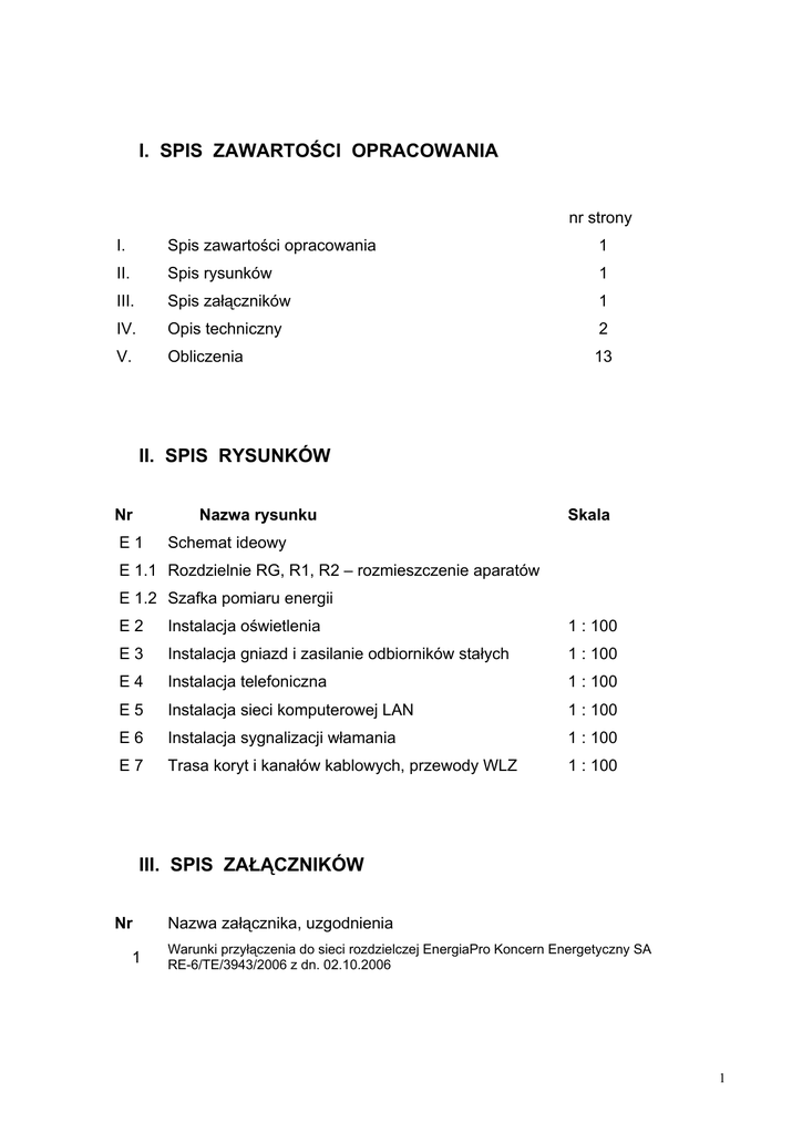 I. SPIS ZAWARTOŚCI OPRACOWANIA nr strony I. Spis zawartości opracowania 1 II. Spis rysunków 1 III. Spis załączników 1 IV. Opis techniczny 2 V. Obliczenia 13 II. SPIS RYSUNKÓW Nr Nazwa rysunku E1 Skala Schemat ideowy E 1.1 Rozdzielnie RG, R1, R2 – rozmieszczenie aparatów E 1.2 Szafka pomiaru energii E2 Instalacja oświetlenia 1 : 100 E3 Instalacja gniazd i zasilanie odbiorników stałych 1 : 100 E4 Instalacja telefoniczna 1 : 100 E5 Instalacja sieci komputerowej LAN 1 : 100 E6 Instalacja sygnalizacji włamania 1 : 100 E7 Trasa koryt i kanałów kablowych, przewody WLZ 1 : 100 III. SPIS ZAŁĄCZNIKÓW Nr 1 Nazwa załącznika, uzgodnienia Warunki przyłączenia do sieci rozdzielczej EnergiaPro Koncern Energetyczny SA RE-6/TE/3943/2006 z dn. 02.10.2006 1 IV. OPIS TECHNICZNY 1. Temat opracowania Przedmiotem opracowania jest projekt techniczny zasilania i instalacji elektrycznych wewnętrznych związanych z przebudową i zmianą sposobu użytkowania pomieszczeń usługowych, zlokalizowanych przy ul. Damrota 32 w Kędzierzynie – Koźlu, na pomieszczenia Biblioteki Miejskiej. 2. Podstawa opracowania projektu - zlecenie inwestora, - ustalenia i zalecenia inwestora, - inwentaryzacja w terenie, - warunki przyłączenia do sieci rozdzielczej EnergiaPro SA, - obowiązujące przepisy i normy. 3. Zakres projektu Zmiana sposobu użytkowania pomieszczeń wymaga zmiany istniejącej instalacji elektrycznej 230/400 V oraz istniejących instalacji teletechnicznych (sieć komputerowa, telefoniczna i instalacja sygnalizacji włamania). Projekt techniczny swoim zakresem obejmuje: - wewnętrzne linie zasilające WLZ, - rozdzielnię główną RG, - podrozdzielnie R1 i R2, - układ rozliczeniowy pomiaru energii elektrycznej, - instalację oświetlenia podstawowego, - instalację oświetlenia awaryjnego, - instalację gniazd przeznaczenia ogólnego i zasilanie odbiorników stałych, - instalację gniazd dedykowanych DATA, - instalację sieci komputerowej LAN, - instalację telefoniczną, - instalację sygnalizacji włamania. 4. Zasilanie energetyczne 4.1. Przyłącze energetyczne Budynek posiada istniejące zasilanie energetyczne. Obiekt zasilany jest napięciem 0,4 kV za pomocą linii kablowej n/n wyprowadzonej ze stacji transformatorowej 15/0.4 kV „1-go Maja”. Linia kablowa doprowadzona jest do złącza kablowego typu ZK 3a nr ZK 3170 zabudowanego na zewnętrznej ścianie budynku, obok tylnego wyjścia z pomieszczeń biblioteki. 2 4.2. Zabezpieczenie główne, wyłącznik mocy p.poż, pomiar energii 4.2.1. Zabezpieczenie główne Na zewnętrznej ścianie budynku w miejscu wskazanym na rys. nr E3 zabudować szafkę rozdzielczą wykonaną z tworzywa termoutwardzalnego. Jako obudowę zastosować szafkę typu ST2/88/2 prod. INKOBEX o wymiarach (WxSxG) 880x530x250 mm. Obudowa posiada II klasę ochronności, stopień ochrony IP 44 oraz IK10, odporność na UV, kategorie palności FH-25, odporność na nadmierne ciepło 850 oC. W szafce należy umieścić zabezpieczenie główne, które będzie pełniło również funkcje zabezpieczenia przedlicznikowego. Jako zabezpieczenie zastosować przystosowany do plombowania małogabarytowy rozłącznik bezpiecznikowy typu RP-00/160 z wkładkami bezpiecznikowymi typu WT00/F 80 A. Schemat szafki oraz rozmieszczenie w niej poszczególnych elementów pokazano na rys. nr E 1.2. Miejsce zabudowy szafki pokazano na rys. nr E7. Szafkę pomiarową wyposażyć w zamek typu HS z wkładką patentową w systemie MASTERKEY obowiązującym na terenie Rejonu Energetycznego Kędzierzyn – Koźle. Istniejące zabezpieczenie przedlicznikowe wraz szafką ZG należy zdemontować. 4.2.2. Wyłącznik mocy p.poż W szafce pomiarowej obok zabezpieczenia głównego należy zabudować wyłącznik mocy umożliwiający szybkie odłączenie zasilania energetycznego w pomieszczeniach biblioteki w przypadku powstania pożaru lub innego zagrożenia. Jako wyłącznik p.poż. projektuje się rozłącznik kompaktowy typu N2-4-100 pord. MOELLER wyposażony w wyzwalacz wzrostowy typu NZM2/3-XA208-250AC/DC. Wyzwolenie rozłącznika nastąpi po podaniu impulsu przez jeden z przycisków p.poż. zabudowanych przy wejściach do obiektu. Przyciski należy zabudować na wysokości 1.3 m od poziomu posadzki w skrzynkach koloru czerwonego z napisem „WYŁ. P.POŻ”. Zbicie szybki w obudowie wyłącznika powinno spowodować automatycznie zwarcie jego styków, pojawi się wówczas napięcie na stykach wyzwalacza wyłącznika w wyniku czego nastąpi wyłączenie rozłącznika. Ponowne załączenie układu może nastąpić po założeniu szybki na przycisku p.poż. i ręcznym zazbrojeniu rozłącznika. Miejsce zabudowy poszczególnych przycisków p.poż. oraz trasę prowadzenia do nich przewodów pokazano na rys. nr E 7. Dodatkowo w obwodzie wyzwalacza należy zabudować układ automatycznego przełączania faz oparty na aparacie modułowym typu PF 431 zapewniający prawidłową prace układu w przypadku zaniku pojedynczej fazy. Oprzewodowanie poszczególnych przycisków p.poż. wykonać przewodem niepalnym typu HDGs 2x1,5 mm2, przewód prowadzić na całej długości pod tynkiem. 4.3. Pomiar energii Zgodnie z warunkami przyłączenia do sieci wydanymi przez Rejon Energetyczny pomiar zużywanej energii elektrycznej realizowany będzie za pomocą trójfazowego bezpośredniego 3 jednostrefowego licznika energii czynnej z 15 min. wskaźnikiem mocy maksymalnej oraz trójfazowego bezpośredniego jednostrefowego licznika energii biernej. Wszystkie elementy układu pomiarowego zabudować w szafce pomiaru energii i przystosować do plombowania. Schemat szafki pomiaru energii pokazano na rys. nr E 1.2. Istniejący bezpośredni układ pomiaru energii czynnej wraz tablicą licznikowo-rozdzielczą TLR należy zdemontować. Licznik pomiaru energii zdać do Rejonu Energetycznego w celu dokonania rozliczenia końcowego zużytej energii elektrycznej. 4.3. Wewnętrzne linie zasilające WLZ 4.3.1 Zasilanie rozdzielni głównej 