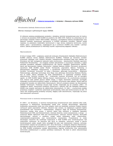 Strona główna | English > Historia komputerów > Artykuły > Maszyny cyfrowe ODRA Powrót Wrocławskie Zakłady Elektroniczne ELWRO Okres maszyn cyfrowych typu ODRA W referacie zostaną przedstawione produkty z dziedziny techniki komputerowej oraz ich twórcy w okresie od powstania WZE ELWRO do przełomu lat 1960-1970. Referat nie pretenduje do roli pierwszego rozdziału historii WZE ELWRO, obszerną i szczegółową historię początkowego oraz dalszych okresów opracowuje zatrudniony w ELWRO zawodowy kronikarz. Referat został napisany na podstawie materiałów technicznych z tego okresu (załoŜenia techniczne, wyniki badań, plany i sprawozdania), znajdujących się w archiwum ELWRO oraz notatek i pamięci autora. Zakres przekazanych tu informacji wynikł z ograniczonej objętości referatu. Wprowadzenie W dniu 6 lutego 1959 r. podpisany został akt erekcyjny Wrocławskich Zakładów Elektronicznych ELWRO (obecna nazwa Zakłady Elektroniczne ELWRO). Podpisał go ówczesny minister przemysłu cięŜkiego, prof. Kiejstut Zemaitis. Uzasadnieniem powołania tego typu zakładu we Wrocławiu był fakt wystąpienia nadwyŜki kadry technicznej – absolwentów Wydziału Łączności Politechniki Wrocławskiej – nie mogącej znaleźć zatrudnienia w wyuczonym zawodzie, a takŜe potrzeba powołania zakładów kooperacyjnych dla duŜych zakładów Zjednoczenia UNITRA, takich jak Warszawskie Zakłady Telewizyjne i Zakłady Radiowe DIORA. Pierwszym dyrektorem naczelnym WZE ELWRO został Marian Tarnkowski, poprzednio Główny Technolog w Warszawskich Zakładach Telewizyjnych, a dyrektorem technicznym Mieczysław Bazewicz. Dyrektor Tarnkowski “przywiózł” ze sobą z Warszawy: głównego konstruktora – Zbigniewa Malinowskiego, głównego technologa Jana Bogo oraz głównego ekonomistę Wacława Wosika, byli to ludzie, którzy posiadali juŜ duŜe doświadczenie w organizacji produkcji branŜy elektronicznej. Zarówno dyrekcja, jak i środowisko naukowe Wrocławia, byli od początku zgodni, Ŝe WZE ELWRO będzie fabryką maszyn matematycznych. Do uruchomienia produkcji tych maszyn była jednak jeszcze daleka droga, a reguły ekonomiki przemysłu wymagały szybkiego uruchomienia produkcji czegoś, co dawałoby utrzymanie całej załodze. Wybór padł na przełączniki kanałów do odbiorników telewizyjnych, których produkcji pozbyły się Warszawskie Zakłady Telewizyjne. Produkcja seryjna tego wyrobu rozpoczęła się we wrześniu 1959 r. W następnych latach, asortyment produkcji rozszerzono o głowice UKF dla Zakładów Radiowych DIORA oraz zespoły odchylania do odbiorników telewizyjnych. W 1961 r. uruchomiona została produkcja urządzeń i systemów automatyki przemysłowej, która jest kontynuowana do dziś. W cieniu tak zorganizowanej produkcji seryjnej, dającej zyski ekonomiczne, rozpoczęły się prace nad maszynami cyfrowymi. Pierwsze kroki w technice komputerowej W 1959 r. we Wrocławiu, w technice komputerowej zorientowanych było zaledwie kilka osób, skupionych w Politechnice Wrocławskiej wokół prof. Jerzego Bromirskiego. Natomiast środowisko warszawskie miało trzy silne zespoły, które juŜ budowały uŜytkowe modele maszyn cyfrowych (patrz poprzednie referaty). Słusznie więc uznano, Ŝe najlepszym wyjściem będzie przeszkolenie tam inŜynierów i matematyków, mających zająć się techniką komputerową. Utworzone zostały dwie grupy, z których jedna była szkolona w Zakładzie Aparatów Matematycznych PAN, pod kierownictwem, wówczas docenta, Leona Łukaszewicza, a druga – w Instytucie Badań Jądrowych PAN pod kierownictwem, wówczas równieŜ docenta, Romualda Marczyńskiego. Łącznie w szkoleniu wzięło udział kilkanaście osób: elektroników, matematyków-programistów oraz konstruktorów mechaników. Przeszkolenie to miało decydujące znaczenie dla szybkiego rozpoczęcia w WZE ELWRO prac konstrukcyjnych nad maszynami cyfrowymi. Po powrocie obu grup ze szkolenia, utworzony został w Biurze Konstrukcyjnym jeden zespół, który przystąpił do prac nad wykonaniem maszyny cyfrowej; kierownikiem zespołu był początkowo prof. Jerzy Bromirski, a następnie Zbigniew Wojnarowicz. Początkowo miał to być przelicznik S-1, opracowany w ZAM przez zespół Jerzego Gradowskiego. Do WZE ELWRO przekazana została dokumentacja logiczna przelicznika oraz opracowanie elementów podstawowych w postaci publikacji naukowych. Nie była to zatem dokumentacja konstrukcyjna. Konstruktorzy ELWRO, sporządzając dokumentację konstrukcyjną, postanowili wprowadzić nowszą technikę: zdecydowano się na zastąpienie niektórych układów lampowych Model maszyny cyfrowej ODRA 1001 układami tranzystorowymi, opartymi na tranzystorach i diodach krajowych. Spowodowało to konieczność wprowadzenia pewnych zmian w schematach logicznych. W ten sposób rozpoczęła się budowa modelu m.c. Odra 1001. Konstrukcja bębna pamięci dla tej maszyny została oparta na rozwiązaniu doc. Romualda Marczyńskiego z IBJ PAN. Wprowadzono jednak zmiany pozwalające zwiększyć jego pojemność z 512 do 2048 słów. Opracowano równieŜ nową, 20-krotną łączówkę. O tempie prac świadczą następujące daty: załoŜenie techniczne – kwiecień 1960, zakończenie montaŜu – grudzień 1960, uruchomienie – czerwiec 1961. Kończąc uruchomienie Odry 1001 zdawano sobie sprawę z tego, Ŝe nie Model maszyny cyfrowej ODRA 1002 nadaje się ona jeszcze do produkcji seryjnej wskutek zbyt duŜej zawodności maszyny. Dlatego juŜ w maju 1961 r. opracowano załoŜenia techniczne na m.c. Odra 1002: przyjęto wyŜsze parametry techniczne (tabela 1) i poprawiono konstrukcję elementów podstawowych (rozpoczęto sztuczne starzenie tranzystorów i diod, staranną ich selekcję oraz dokładne sprawdzanie pakietów). W grudniu 1961 r. zakończono montaŜ Odry 1002, a w czerwcu 1962, jej uruchomienie. Niezawodność Odry 1002 była wprawdzie większa niŜ Odry 1001, ale oceniono, Ŝe jest ona jeszcze 