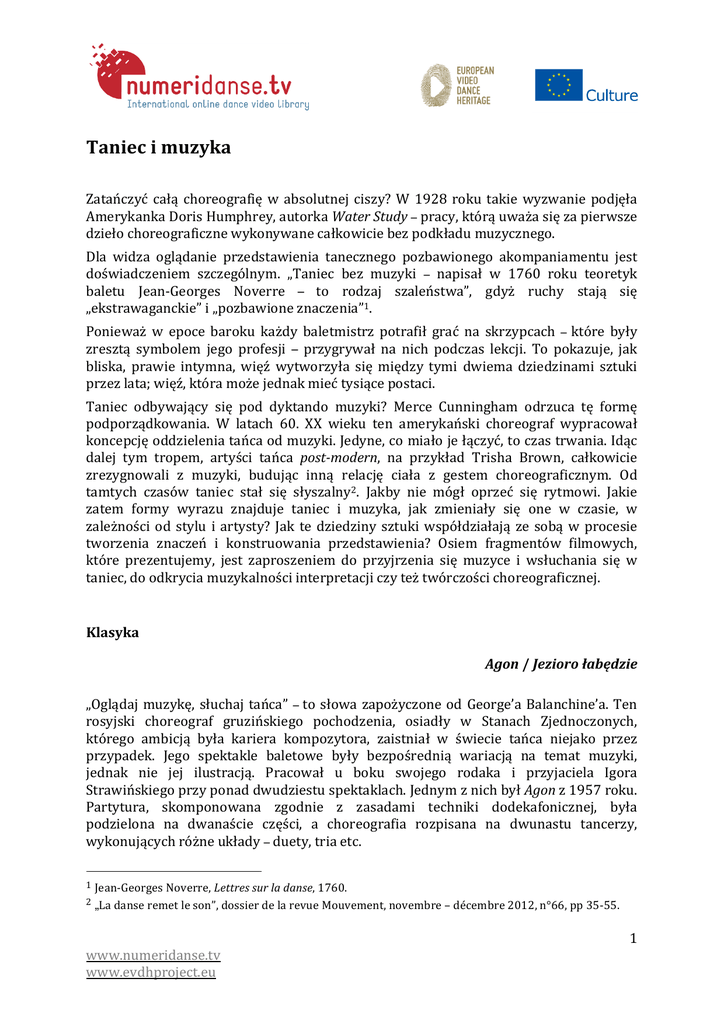 Taniec i muzyka Zatańczyć całą choreografię w absolutnej ciszy? W 1928 roku takie wyzwanie podjęła Amerykanka Doris Humphrey, autorka Water Study ‒ pracy, którą uważa się za pierwsze dzieło choreograficzne wykonywane całkowicie bez podkładu muzycznego. Dla widza oglądanie przedstawienia tanecznego pozbawionego akompaniamentu jest doświadczeniem szczególnym. „Taniec bez muzyki ‒ napisał w 1760 roku teoretyk baletu Jean-‐Georges Noverre – to rodzaj szaleństwa”, gdyż ruchy stają się „ekstrawaganckie” i „pozbawione znaczenia”1. Ponieważ w epoce baroku każdy baletmistrz potrafił grać na skrzypcach ‒ które były zresztą symbolem jego profesji – przygrywał na nich podczas lekcji. To pokazuje, jak bliska, prawie intymna, więź wytworzyła się między tymi dwiema dziedzinami sztuki przez lata; więź, która może jednak mieć tysiące postaci. Taniec odbywający się pod dyktando muzyki? Merce Cunningham odrzuca tę formę podporządkowania. W latach 60. XX wieku ten amerykański choreograf wypracował koncepcję oddzielenia tańca od muzyki. Jedyne, co miało je łączyć, to czas trwania. Idąc dalej tym tropem, artyści tańca post-modern, na przykład Trisha Brown, całkowicie zrezygnowali z muzyki, budując inną relację ciała z gestem choreograficznym. Od tamtych czasów taniec stał się słyszalny2. Jakby nie mógł oprzeć się rytmowi. Jakie zatem formy wyrazu znajduje taniec i muzyka, jak zmieniały się one w czasie, w zależności od stylu i artysty? Jak te dziedziny sztuki współdziałają ze sobą w procesie tworzenia znaczeń i konstruowania przedstawienia? Osiem fragmentów filmowych, które prezentujemy, jest zaproszeniem do przyjrzenia się muzyce i wsłuchania się w taniec, do odkrycia muzykalności interpretacji czy też twórczości choreograficznej. Klasyka Agon / Jezioro łabędzie „Oglądaj muzykę, słuchaj tańca” ‒ to słowa zapożyczone od George’a Balanchine’a. Ten rosyjski choreograf gruzińskiego pochodzenia, osiadły w Stanach Zjednoczonych, którego ambicją była kariera kompozytora, zaistniał w świecie tańca niejako przez przypadek. Jego spektakle baletowe były bezpośrednią wariacją na temat muzyki, jednak nie jej ilustracją. Pracował u boku swojego rodaka i przyjaciela Igora Strawińskiego przy ponad dwudziestu spektaklach. Jednym z nich był Agon z 1957 roku. Partytura, skomponowana zgodnie z zasadami techniki dodekafonicznej, była podzielona na dwanaście części, a choreografia rozpisana na dwunastu tancerzy, wykonujących różne układy ‒ duety, tria etc. 1 2 Jean-‐Georges Noverre, Lettres sur la danse, 1760. „La danse remet le son”, dossier de la revue Mouvement, novembre – décembre 2012, n°66, pp 35-‐55. 1 www.numeridanse.tv www.evdhproject.eu W prezentowanym pas de deux balerina prowadzi partnera, podobnie jak skrzypce prowadzą pozostałe instrumenty akompaniującej orkiestry. Unosi się, opierając się na tancerzu, jak skrzypce, których dźwięk przebija się przez tło muzyczne. Balanchine uważał, że to choreograf powinien stworzyć taką grę relacji, powiązań. Jak stwierdził: „choreografia [tworzy] własną formę niezależnie od formy muzycznej, [bez] powielania linii melodycznej i rytmu”. Wolne tempo, obszerne ruchy ramion, ruchy nóg, które kreślą linie w przestrzeni ‒ to cechy charakterystyczne adagio, którego przykład znajdziemy w drugim akcie Jeziora łabędziego. Już samo określenie „adagio” pochodzi z terminologii muzycznej. Baletowe adagio wymaga od tancerza utrzymania równowagi i aplomb podczas wykonywania grand développé, póz attitude i arabesque, dlatego jest synonimem poetyckiej perfekcji i liryzmu, a także idealnie oddaje charakter miłosnych uniesień. U Mariusa Petipy zgodnie z tradycją adagio stanowi pierwszą część pas de deux. (Ten francuski choreograf zamieszkały w Rosji, współtwórca Jeziora łabędziego, podobnie jak inni baletmistrzowie tamtych czasów, narzucał kompozytorom rytm, liczbę taktów i charakter muzyki. Uważani jedynie za rzemieślników, kompozytorzy baletowi nie cieszyli się dużym szacunkiem w Rosji. Czajkowski był natomiast uznanym kompozytorem muzyki symfonicznej, która postrzegana była jako szlachetniejsza. Kiedy w 1875 roku Teatr Bolszoj zamówił u niego partyturę do spektaklu, przyjął zlecenie z ambicją podniesienia prestiżu muzyki baletowej. Udało się – Jezioro łabędzie stało się ikoną baletu klasycznego, rozpoznawalną na całym świecie. Rytm Samanvay / Jazz Tap Ensemble Każdy tancerz Odissi musi być także muzykiem. Podstawą tego tańca, podobnie jak innych klasycznych stylów indyjskich, jest rytm. Struktura choreograficzna wyłania się ze struktury muzycznej, opartej na motywach rytmicznych, zwanych tala. Stopy tancerza podążają za wzorcem rytmicznym wygrywanym przez talam ‒ instrumencie przypominającym talerze, któremu dla wzmocnienia efektu towarzyszy bęben pakhawaj. Bransoletki z dzwoneczkami noszone przez tancerza wokół kostki akcentują dźwiękowo pracę stóp. Za ich sprawą wykonawca, zazwyczaj solista, staje się pełnoprawnym instrumentalistą. W taki sposób siedem tancerek zgromadzonych przez Madhaviego Mudgala w prezentowanym spektaklu przeobraża się w najprawdziwszą, ruchomą orkiestrę. Stepowanie to kolejny przykład stylu tańca, w którym stopy służą za instrumenty perkusyjne, choć tu źródłem dźwięku są specjalne buty. Różnorodność rytmicznych i akustycznych kombinacji obecna w stepowaniu uzyskiwana jest jednak przede wszystkim poprzez różnicowanie nacisku pięty, palców czy całej podeszwy na podłoże. Tytuł spektaklu Interplay, wykonywanego przez Jazz Tap Ensemble, kojarzy się z grą relacji, interakcji i reakcji, które powstają między tancerzami a orkiestrą. Moment, kiedy muzycy milkną pozwala soliście zademonstrować jeszcze pełniej swoje fizyczne i 2 www.numeridanse.tv www.evdhproje