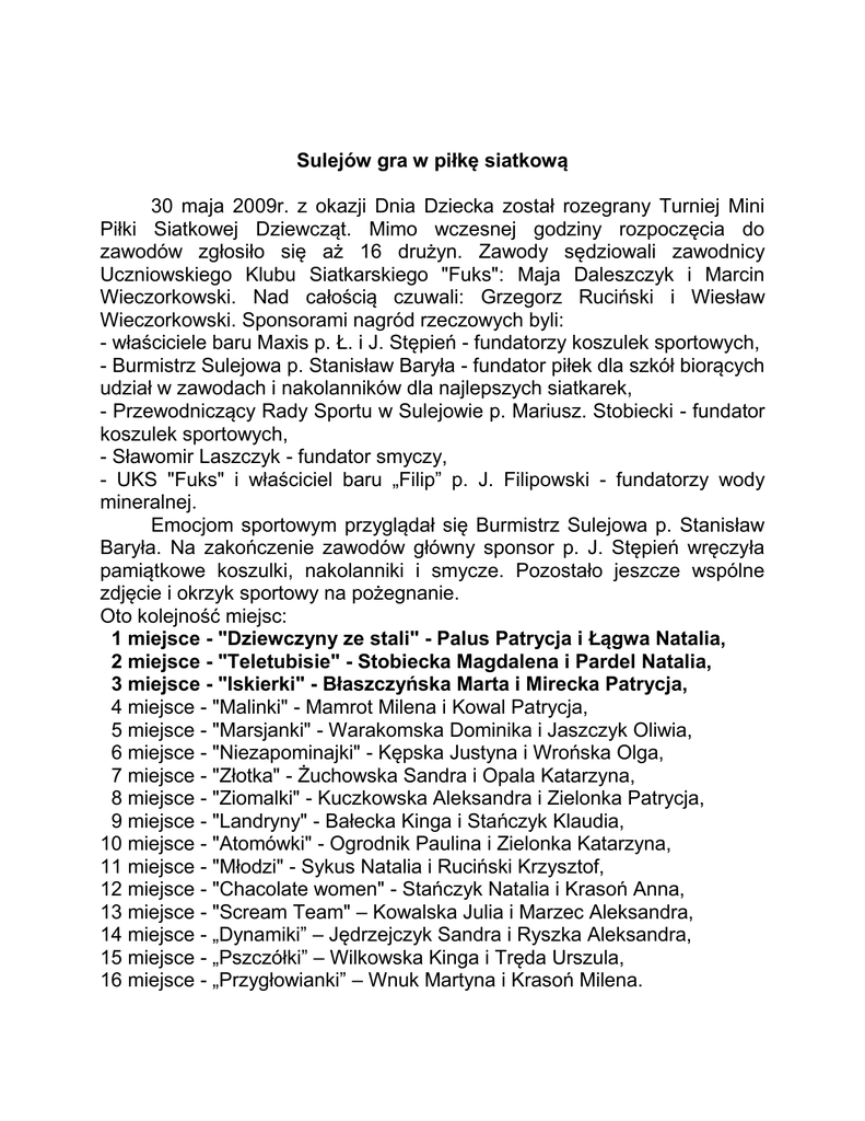Sulejów gra w piłkę siatkową 30 maja 2009r. z okazji Dnia Dziecka został rozegrany Turniej Mini Piłki Siatkowej Dziewcząt. Mimo wczesnej godziny rozpoczęcia do zawodów zgłosiło się aż 16 drużyn. Zawody sędziowali zawodnicy Uczniowskiego Klubu Siatkarskiego "Fuks": Maja Daleszczyk i Marcin Wieczorkowski. Nad całością czuwali: Grzegorz Ruciński i Wiesław Wieczorkowski. Sponsorami nagród rzeczowych byli: - właściciele baru Maxis p. Ł. i J. Stępień - fundatorzy koszulek sportowych, - Burmistrz Sulejowa p. Stanisław Baryła - fundator piłek dla szkół biorących udział w zawodach i nakolanników dla najlepszych siatkarek, - Przewodniczący Rady Sportu w Sulejowie p. Mariusz. Stobiecki - fundator koszulek sportowych, - Sławomir Laszczyk - fundator smyczy, - UKS "Fuks" i właściciel baru „Filip” p. J. Filipowski - fundatorzy wody mineralnej. Emocjom sportowym przyglądał się Burmistrz Sulejowa p. Stanisław Baryła. Na zakończenie zawodów główny sponsor p. J. Stępień wręczyła pamiątkowe koszulki, nakolanniki i smycze. Pozostało jeszcze wspólne zdjęcie i okrzyk sportowy na pożegnanie. Oto kolejność miejsc: 1 miejsce - "Dziewczyny ze stali" - Palus Patrycja i Łągwa Natalia, 2 miejsce - "Teletubisie" - Stobiecka Magdalena i Pardel Natalia, 3 miejsce - "Iskierki" - Błaszczyńska Marta i Mirecka Patrycja, 4 miejsce - "Malinki" - Mamrot Milena i Kowal Patrycja, 5 miejsce - "Marsjanki" - Warakomska Dominika i Jaszczyk Oliwia, 6 miejsce - "Niezapominajki" - Kępska Justyna i Wrońska Olga, 7 miejsce - "Złotka" - Żuchowska Sandra i Opala Katarzyna, 8 miejsce - "Ziomalki" - Kuczkowska Aleksandra i Zielonka Patrycja, 9 miejsce - "Landryny" - Bałecka Kinga i Stańczyk Klaudia, 10 miejsce - "Atomówki" - Ogrodnik Paulina i Zielonka Katarzyna, 11 miejsce - "Młodzi" - Sykus Natalia i Ruciński Krzysztof, 12 miejsce - "Chacolate women" - Stańczyk Natalia i Krasoń Anna, 13 miejsce - "Scream Team" – Kowalska Julia i Marzec Aleksandra, 14 miejsce - „Dynamiki” – Jędrzejczyk Sandra i Ryszka Aleksandra, 15 miejsce - „Pszczółki” – Wilkowska Kinga i Tręda Urszula, 16 miejsce - „Przygłowianki” – Wnuk Martyna i Krasoń Milena. Już dzisiaj zapraszamy na kolejny Turniej Piłki Plażowej Kobiet i Mężczyzn, który odbędzie się 13 czerwca 2009r. w ramach obchodów Dni Sulejowa. Osoby chętne wyjechać na Mistrzostwa Europy Kobiet, które odbędą się w Łodzi we wrześniu 2009r. proszone są o kontakt do 20 czerwca pod numer telefonu - 501-257-382 Wiesław Wieczorkowski. Opracował: Wiesław Wieczorkowski
