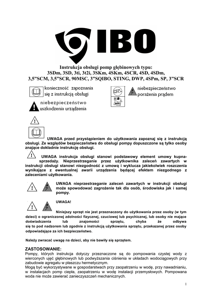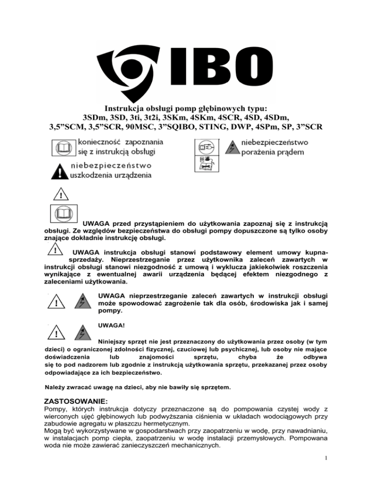 Instrukcja obsługi pomp głębinowych typu: 3SDm, 3SD, 3ti, 3t2i, 3SKm, 4SKm, 4SCR, 4SD, 4SDm, 3,5”SCM, 3,5”SCR, 90MSC, 3”SQIBO, STING, DWP, 4SPm, SP, 3”SCR UWAGA przed przystąpieniem do użytkowania zapoznaj się z instrukcją obsługi. Ze względów bezpieczeństwa do obsługi pompy dopuszczone są tylko osoby znające dokładnie instrukcję obsługi. UWAGA instrukcja obsługi stanowi podstawowy element umowy kupnasprzedaży. Nieprzestrzeganie przez użytkownika zaleceń zawartych w instrukcji obsługi stanowi niezgodność z umową i wyklucza jakiekolwiek roszczenia wynikające z ewentualnej awarii urządzenia będącej efektem niezgodnego z zaleceniami użytkowania. UWAGA nieprzestrzeganie zaleceń zawartych w instrukcji obsługi może spowodować zagrożenie tak dla osób, środowiska jak i samej pompy. UWAGA! Niniejszy sprzęt nie jest przeznaczony do użytkowania przez osoby (w tym dzieci) o ograniczonej zdolności fizycznej, czuciowej lub psychicznej, lub osoby nie mające doświadczenia lub znajomości sprzętu, chyba że odbywa się to pod nadzorem lub zgodnie z instrukcją użytkowania sprzętu, przekazanej przez osoby odpowiadające za ich bezpieczeństwo. Należy zwracać uwagę na dzieci, aby nie bawiły się sprzętem. ZASTOSOWANIE: Pompy, których instrukcja dotyczy przeznaczone są do pompowania czystej wody z wierconych ujęć głębinowych lub podwyższania ciśnienia w układach wodociągowych przy zabudowie agregatu w płaszczu hermetycznym. Mogą być wykorzystywane w gospodarstwach przy zaopatrzeniu w wodę, przy nawadnianiu, w instalacjach pomp ciepła, zaopatrzeniu w wodę instalacji przemysłowych. Pompowana woda nie może zawierać zanieczyszczeń mechanicznych. 1 Pompa przeznaczona jest do pompowania wody bez zawartości części stałychszlifujących. Pompowanie wody zawierającej piach doprowadzi do szybkiego jej zużycia i w konsekwencji do awarii. W takim przypadku naprawa będzie możliwa tylko w trybie odpłatnym. Powyższe nie dotyczy pomp o podwyższonej odporności na piach. Dla tych pomp maksymalna zawartość piachu w wodzie nie może przekraczać 5%. Należy pamiętać, że żywotność pompy nawet o podwyższonej odporności na piach będzie zdecydowanie krótsza gdy pompa będzie pompować wodę zanieczyszczoną piachem. Zużycie elementów pompujących piachem nie podlega naprawom gwarancyjnym. Jest to zużycie eksploatacyjne. Pompa nie jest przystosowana do przepompowywania substancji żrących, łatwopalnych, o niszczących właściwościach lub wybuchowych (np.benzyna, nitro, ropa naftowa, itp.), produktów żywnościowych, słonej wody. Awarie spowodowane pompowaniem tego typu cieczy nie podlegają naprawom gwarancyjnym. Maksymalna temperatura pompowanej wody wynosi 35oC. Pompa nie jest przystosowana do pompowania wody zawierającej nadmierną ilość składników mineralnych powodujących odkładanie się kamienia na elementach pompujących. Użytkowanie pompy w takich warunkach doprowadzi do przedwczesnego zużycia elementów roboczych. W tym przypadku naprawa pompy będzie możliwa tylko w trybie odpłatnym. Pompa nie może pompować wody zawierającej oleje i substancje ropopochodne. Praca pompy w takiej wodzie doprowadzi do uszkodzenia elementów gumowych np. kabla lub uszczelnień, a w efekcie do rozszczelnienia pompy i awarii silnika. W tym przypadku naprawa pompy będzie możliwa tylko w trybie odpłatnym. Przepompowywana woda nie może zawierać zanieczyszczeń długo-włóknistych. INSTALACJA POMPY: Przed rozpoczęciem jakichkolwiek prac instalacyjnych należy bezwzględnie odłączyć prąd zasilający. Należy zabezpieczyć się przed jego przypadkowym włączeniem. Pompy 3ti, 3t2i, 3SDm, 4SD i 4SDm ze względu na swoje wymiary mogą być dostarczane w dwóch częściach. Jedna to część hydrauliczna pompy, druga to silnik elektryczny. Przed przystąpieniem do montażu obu części w jedną całość należy odkręcić śruby mocujące listwę zabezpieczającą kabel. Następnie należy odkręcić śruby mocujące filtr siatkowy i zdjąć go. Z silnika należy odkręcić i zdjąć nakrętki montażowe wraz z podkładkami. Po ustawieniu silnika pionowo należy na niego nałożyć część hydrauliczną tak aby wał silnika zakończony wieloklinem został umieszczony w sprzęgle pompy. Jeżeli w trakcie osadzania występują trudności z zespoleniem należy przekręcić wał silnika tak aby wieloklin dopasować do sprzęgła silnika. Przy prawidłowym osadzeniu części hydraulicznej na silniku powinna się ona całkowicie opierać na korpusie łożyskowym górnym silnika. Tak przygotowany agregat możemy skręcać za pomocą nakrętek i podkładek .Nakrętki należy dokręcać „na krzyż”. Minimalny moment z jakim powinny być dokręcone nakrętki dla silników 4” wynosi 18 Nm. Niedokładne dokręcenie nakrętek może spowodować ich odkręcenie w czasie pracy i „utopienie” silnika w odwiercie. Po zmontowaniu części hydraulicznej na silniku, po ułożeniu kabla zasilającego na pompie należy założyć i przykręcić śrubami filtr siatkowy, a następnie listwę zabezpieczającą kabel. Opuszczanie pompy do odwiertu bez listwy zabezpieczającej może doprowadzić do uszkodzenia izolacji kabla co może skutkować awarią pompy lub porażeniem prądem obsługi. 2 Dla pomp SD, SDm, SCM, SPm, SP ze względu na konieczność zapewnienia chłodzenia silnika w czasie pracy średnica odwiertu w którym pracuje pompa nie może być większa od podanych poniżej w tabeli średnic. Wielkości podano w mm. Średnice te zależą od średniej wydajności danej pompy. 2 4 5 7 10 15 20 25 30 40 m3/h m3/h m3/h m3/h m3/h m3/h m3/h m3/h m3/h m3/h 102 103 115 160 195 240 285 320 350 410 mm mm mm mm mm mm mm mm mm mm Użytkowanie pompy w studni o większej średnicy niż podano w tabeli może doprowadzić do przegrzania silnika i jego awarii. Jeżeli studnia w której ma pracować pompa ma większą średnice niż podana w tab