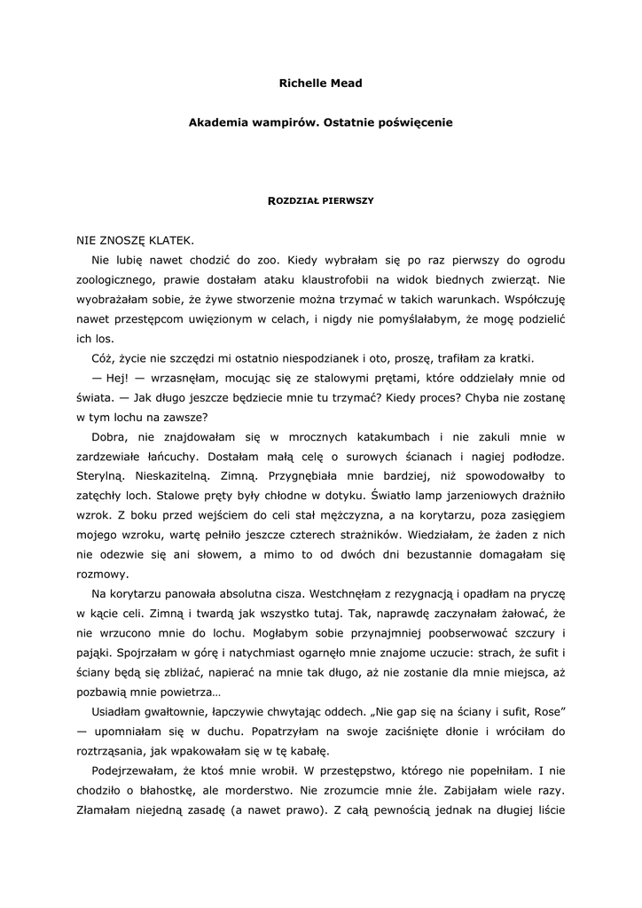Richelle Mead Akademia wampirów. Ostatnie poświęcenie ROZDZIAŁ PIERWSZY NIE ZNOSZĘ KLATEK. Nie lubię nawet chodzić do zoo. Kiedy wybrałam się po raz pierwszy do ogrodu zoologicznego, prawie dostałam ataku klaustrofobii na widok biednych zwierząt. Nie wyobrażałam sobie, że żywe stworzenie można trzymać w takich warunkach. Współczuję nawet przestępcom uwięzionym w celach, i nigdy nie pomyślałabym, że mogę podzielić ich los. Cóż, życie nie szczędzi mi ostatnio niespodzianek i oto, proszę, trafiłam za kratki. — Hej! — wrzasnęłam, mocując się ze stalowymi prętami, które oddzielały mnie od świata. — Jak długo jeszcze będziecie mnie tu trzymać? Kiedy proces? Chyba nie zostanę w tym lochu na zawsze? Dobra, nie znajdowałam się w mrocznych katakumbach i nie zakuli mnie w zardzewiałe łańcuchy. Dostałam małą celę o surowych ścianach i nagiej podłodze. Sterylną. Nieskazitelną. Zimną. Przygnębiała mnie bardziej, niż spowodowałby to zatęchły loch. Stalowe pręty były chłodne w dotyku. Światło lamp jarzeniowych drażniło wzrok. Z boku przed wejściem do celi stał mężczyzna, a na korytarzu, poza zasięgiem mojego wzroku, wartę pełniło jeszcze czterech strażników. Wiedziałam, że żaden z nich nie odezwie się ani słowem, a mimo to od dwóch dni bezustannie domagałam się rozmowy. Na korytarzu panowała absolutna cisza. Westchnęłam z rezygnacją i opadłam na pryczę w kącie celi. Zimną i twardą jak wszystko tutaj. Tak, naprawdę zaczynałam żałować, że nie wrzucono mnie do lochu. Mogłabym sobie przynajmniej poobserwować szczury i pająki. Spojrzałam w górę i natychmiast ogarnęło mnie znajome uczucie: strach, że sufit i ściany będą się zbliżać, napierać na mnie tak długo, aż nie zostanie dla mnie miejsca, aż pozbawią mnie powietrza… Usiadłam gwałtownie, łapczywie chwytając oddech. „Nie gap się na ściany i sufit, Rose” — upomniałam się w duchu. Popatrzyłam na swoje zaciśnięte dłonie i wróciłam do roztrząsania, jak wpakowałam się w tę kabałę. Podejrzewałam, że ktoś mnie wrobił. W przestępstwo, którego nie popełniłam. I nie chodziło o błahostkę, ale morderstwo. Nie zrozumcie mnie źle. Zabijałam wiele razy. Złamałam niejedną zasadę (a nawet prawo). Z całą pewnością jednak na długiej liście moich przewin nie znalazłam morderstwa z zimną krwią. Szczególnie takiego, którego ofiarą padłaby królowa. Nie uważałam Tatiany za przyjaciółkę. Historia mojej znajomości z wyrachowaną władczynią morojów przebiegała do tej pory bardzo burzliwie. Po pierwsze, spotykałam się z jej stryjecznym wnukiem, Adrianem. Po drugie, nie akceptowałam jej polityki walki ze strzygami. Tatiana kilka razy dała mi w kość, lecz nigdy nie pragnęłam jej śmierci. Ktoś jednak postanowił ją usunąć i zadbał o to, by dowody wskazywały na mnie. Najbardziej obciążające były odciski palców na srebrnym sztylecie — narzędziu zbrodni. Sztylet należał do mnie, więc to oczywiste, że je znaleźli, ale nikt nie uznał, że to przemawia na moją korzyść. Westchnęłam i wyjęłam z kieszeni zmiętą kartkę. Ścisnęłam ją w dłoni, nie musiałam czytać. Znałam ją już na pamięć, list, który zmieniał wszystko, co do tej pory wiedziałam o królowej. Zrodził tyle pytań. Nie mogąc dłużej znieść siedzenia w klatce, przeniosłam się do umysłu mojej najlepszej przyjaciółki, Lissy. Jest morojką, łączy nas szczególna więź, która pozwala mi widzieć wszystko jej oczyma. Podobnie jak inni przedstawiciele swojej rasy, Lissa ma zdolności magiczne. Posługuje się mocą ducha, która jest bardzo rzadka. Wciąż mało wiemy o możliwościach Lissy, lecz wydają się one nadzwyczajne. Wskrzesiła mnie przed kilku laty za sprawą swojej magii i w ten sposób powstała nasza szczególna więź. Wizyty w umyśle przyjaciółki pomagały mi na chwilę oderwać się od ponurej rzeczywistości, lecz nie rozwiązywały problemów. Lissa usiłowała oczyścić moje dobre imię od chwili, kiedy na przesłuchaniu przedstawiono dowody winy. Sztylet był tylko jednym z wielu. Przeciwnicy, których mi nie brakowało, skwapliwie przypomnieli o tym, jak kłóciłam się z władczynią, i sprowadzili świadka, który zeznał, że byłam w pobliżu miejsca zbrodni w czasie, kiedy ją popełniono. W taki oto sposób pozbawiono mnie alibi. Rada morojów uznała, że to wystarczająca podstawa do wytoczenia procesu. Lissa rozpaczliwie przekonywała Radę, że ktoś mnie wrabia, i żądała wszczęcia śledztwa w tej sprawie. Niestety, nie chcieli jej słuchać, ponieważ cały dwór był pochłonięty przygotowaniami do spektakularnego pogrzebu Tatiany. Śmierć monarchy jest wielkim wydarzeniem. Goście, zarówno moroje, jak i dampiry, zjeżdżali się z całego świata na to widowisko. Jedzenie, kwiaty, dekoracje, muzycy… przygotowania toczyły się pełną parą. Zapowiadała się wystawna gala. Wątpię, czy ślub Tatiany świętowano by równie uroczyście. Na dworze panowało takie zamieszanie, że nikt już nie zwracał na mnie uwagi. Większość uznała, że zostałam unieszkodliwiona i nikogo więcej nie skrzywdzę. Morderczyni Tatiany pojmana. Sprawiedliwości stało się zadość. Sprawa zamknięta. Zanim zdążyłam sprawdzić, gdzie jest Lissa, zamieszanie na korytarzu sprowadziło mnie z powrotem. Ktoś wszedł i rozmawiał ze strażnikami. Prosił o widzenie ze mną. Pierwszy gość od kilku dni. Serce zabiło mi żywiej. Podbiegłam do krat w nadziei, że zaraz usłyszę, iż aresztowanie to tylko fatalne nieporozumienie. Mój gość był ostatnią osobą, jaką spodziewałam się zobaczyć. — Co ty tu robisz, staruszku? — spytałam zrezygnowana. Stał przede mną Abe Mazur i jak zwykle wyglądał porażająco. Mieliśmy lato w pełni — gorące i wilgotne, jak to w tej części Pensylwanii — ale Abe wybrał garnitur w krzykliwych