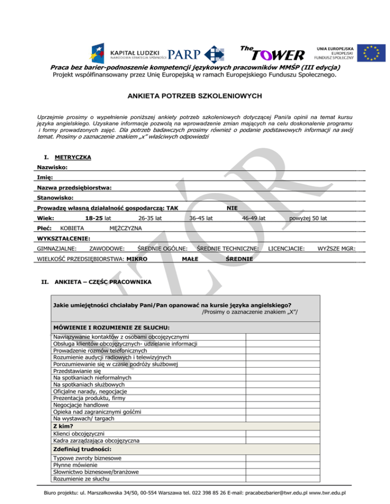 Praca bez barier-podnoszenie kompetencji językowych pracowników MMŚP (III edycja) Projekt współfinansowany przez Unię Europejską w ramach Europejskiego Funduszu Społecznego. ANKIETA POTRZEB SZKOLENIOWYCH Uprzejmie prosimy o wypełnienie poniższej ankiety potrzeb szkoleniowych dotyczącej Pani/a opinii na temat kursu języka angielskiego. Uzyskane informacje pozwolą na wprowadzenie zmian mających na celu doskonalenie programu i formy prowadzonych zajęć. Dla potrzeb badawczych prosimy również o podanie podstawowych informacji na swój temat. Prosimy o zaznaczenie znakiem „x” właściwych odpowiedzi I. METRYCZKA Nazwisko: Imię: Nazwa przedsiębiorstwa: Stanowisko: Prowadzę własną działalność gospodarczą: TAK Wiek: Płeć: 18-25 lat KOBIETA NIE 26-35 lat 36-45 lat 46-49 lat powyżej 50 lat MĘŻCZYZNA WYKSZTAŁCENIE: GIMNAZJALNE: ZAWODOWE: ŚREDNIE OGÓLNE: WIELKOŚĆ PRZEDSIĘBIORSTWA: MIKRO II. ŚREDNIE TECHNICZNE: MAŁE LICENCJACIE: WYŻSZE MGR: ŚREDNIE ANKIETA – CZĘŚC PRACOWNIKA Jakie umiejętności chciałaby Pani/Pan opanować na kursie języka angielskiego? /Prosimy o zaznaczenie znakiem „X”/ MÓWIENIE I ROZUMIENIE ZE SŁUCHU: Nawiązywanie kontaktów z osobami obcojęzycznymi Obsługa klientów obcojęzycznych- udzielanie informacji Prowadzenie rozmów telefonicznych Rozumienie audycji radiowych i telewizyjnych Porozumiewanie się w czasie podróży służbowej Przedstawianie się Na spotkaniach nieformalnych Na spotkaniach służbowych Oficjalne narady, negocjacje Prezentacja produktu, firmy Negocjacje handlowe Opieka nad zagranicznymi gośćmi Na wystawach/ targach Z kim? Klienci obcojęzyczni Kadra zarządzająca obcojęzyczna Zdefiniuj trudności: Typowe zwroty biznesowe Płynne mówienie Słownictwo biznesowe/branżowe Rozumienie ze słuchu Biuro projektu: ul. Marszałkowska 34/50, 00-554 Warszawa tel. 022 398 85 26 E-mail: [email protected] www.twr.edu.pl Rozumienie akcentów obcokrajowców CZYTANIE: Faksy/ notatki służbowe Listy handlowe/ofert handlowe Wiadomości biznesowe Raporty handlowe i finansowe Sprawozdania Artykułów prasowych/ stron internetowych Opisy produktu Faktury/ rachunki Materiały promocyjne branżowe Informacje turystyczne Zdefiniuj trudności? Słownictwo branżowe Zwroty biznesowe PISANIE: Faksy/ notatki służbowe Listy handlowe/oferty handlowe Notatki prasowe/artykuły Raporty handlowe i finansowe Faktury/ rachunki Sprawozdania E-mail Materiały promocyjne Do kogo? Klienci obcojęzyczni Kadra zarządzająca obcojęzyczna Zdefiniuj trudności Słownictwo specjalistyczne/techniczne Gramatyka Zwroty w korespondencji Czy ma Pan/ Pani specjalne wymagania odnośnie zakresu realizowanego materiału na kursie języka angielskiego? KONWERSACJE NOWE SŁOWNICTWO POWTARZANIE GRAMATYKI ZWROTY POTOCZNE IDIOMY ZAGADNIENIA BRANŻOWE. JAKIE? Czy ma Pan/ Pani specjalne wymagania, co do wykorzystywanych metod nauki na kursie języka angielskiego? KONWERSACJE WARSZTATY WYKŁADY DYSKUSJE GRUPOWE PREZENTACJE WIDEO I AUDIO SAMODZIELNA NAUKA INNE JAKIE? Jakie Pana/Pani zdaniem obszary tematyczne powinny być uwzględnione podczas nauczania języka angielskiego? Proszę wymienić te obszary, które uważa Pan/ Pani za najważniejsze. ROZMOWY BIZNESOWE/NEGOCJACJE HANDEL /SPRZEDAŻ PRODUKTÓW I USŁUG FINANSE MARKETING/PROMOCJA UDZIELANIE INFORMACJI o produktach i usługach ROZMOWY CODZIENNE ZAWODOWE SŁOWNICTWO BRANŻOWE INNE: Co w nauce języka angielskiego sprawia Panu/ Pani największe trudności? ROZUMIENIE ZE SŁUCH MÓWIENIE PISANIE GRAMATYKA INNE: JAKIE CZYNNIKI WPŁYNEŁY NA PODJĘCIE DECYZJI O UDZIALE W KURSIE JĘZYKA ANGIELSKIEGO? Można zaznaczyć kilka odpowiedzi! Możliwość bezpłatnej nauki Przydatność nabytej wiedzy w pracy Wymagania pracodawcy w zakresie nowych kwalifikacji Ciekawy zakres szkolenia Opis projektu i jego reklama Zachęta pracodawcy Zachęta współpracowników i rodziny INNE JAKIE? Jakie ma Pan/Pani oczekiwania dotyczące wpływu szkolenia na efektywność pracy? Wzrost efektywności pracy na obecnym stanowisku Zwiększenie wartości na rynku pracy Wzrost umiejętności zawodowych Wzrost umiejętności w zakresie obsługi klientów obcojęzycznych Umożliwienie pozyskania nowych klientów obcojęzycznych Wzrost wynagrodzenia INNE JAKIE? Jakie ma Pan/Pani oczekiwania dotyczące wpływu szkolenia na zatrudnienie i dalszą sytuację zawodową? Zwiększenie możliwości na pracę w firmie zagranicznej w Polsce Wzrost samooceny Zwiększenie możliwości wyjazdów służbowych Ułatwienie znalezienia pracy po jej utracie Ułatwienie awansu Zwiększenie wiedzy i kompetencji zawodowych Umożliwienie prowadzenia własnej działalności INNE JAKIE? JAKICH UMIEJĘTNOŚCI JESZCZE PAN/PANI NIE POSIADA – WAŻNYCH DLA OSIĄGNIĘCIA SUKCESU ZAWODOWEGO? Można zaznaczyć kilka odpowiedzi! Znajomości języków obcych w zakresie swobodnej komunikacji Umiejętności kierownicze Odporność na stres Rozwiązywanie konfliktów Umiejętności interpersonalne Negocjacje handlowe Dodatkowa kategoria prawa jazdy Uprawnienia przewodnika turystycznego INNE JAKIE? W JAKICH SZKOLENIACH – WAŻNYCH DLA OSIĄGNIĘCIA SUKCESU ZAWODOWEGO – CHCIAŁBY PAN/PANI WZIĄĆ UDZIAŁ? Można zaznaczyć kilka odpowiedzi! Kury języków obcych na wyższym poziomie Kurs komputerowy na wyższym poziomie Podstawy prowadzenia działalności gospodarczej Negocjacje handlowe Umiejętności interpersonalne Marketing, promocja Rachunkowość i finanse Szkolenia/Licencje zawodowe /jakie? …………………………….……………………. / INNE JAKIE? III CZĘŚĆ - ANKIETA PRACODAWCY Prosimy o wskazanie, które ze sprawności w zakresie znajomości języka angielskiego wśród zgłoszonych na szkolenie pracowników, są z punktu widzenia przedsiębiorstwa najważniejsze. Prosimy o zaznaczenie znakiem „X” Nazwisko i imię pracownika: Stanowisko: Mówienie i rozumienie ze słuchu: Używanie telefonu Przygotowanie się do podróży Przedstawia