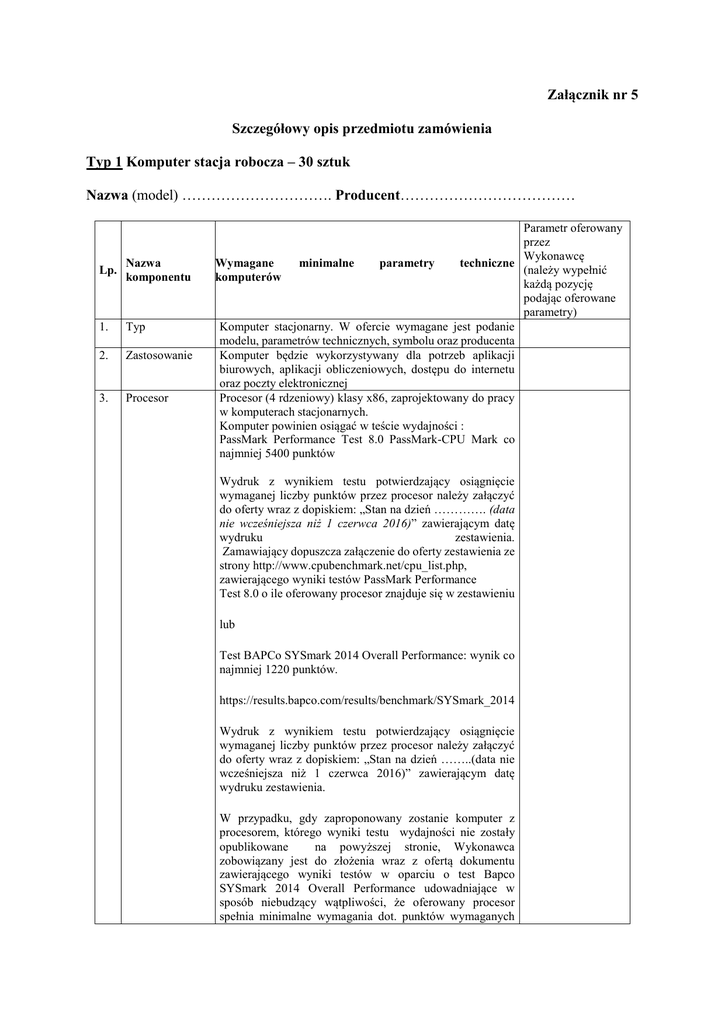 Załącznik nr 5 Szczegółowy opis przedmiotu zamówienia Typ 1 Komputer stacja robocza – 30 sztuk Nazwa (model) …………………………. Producent……………………………… Lp. Nazwa komponentu 1. Typ 2. Zastosowanie 3. Procesor Parametr oferowany przez Wykonawcę Wymagane minimalne parametry techniczne (należy wypełnić komputerów każdą pozycję podając oferowane parametry) Komputer stacjonarny. W ofercie wymagane jest podanie modelu, parametrów technicznych, symbolu oraz producenta Komputer będzie wykorzystywany dla potrzeb aplikacji biurowych, aplikacji obliczeniowych, dostępu do internetu oraz poczty elektronicznej Procesor (4 rdzeniowy) klasy x86, zaprojektowany do pracy w komputerach stacjonarnych. Komputer powinien osiągać w teście wydajności : PassMark Performance Test 8.0 PassMark-CPU Mark co najmniej 5400 punktów Wydruk z wynikiem testu potwierdzający osiągnięcie wymaganej liczby punktów przez procesor należy załączyć do oferty wraz z dopiskiem: „Stan na dzień …………. (data nie wcześniejsza niż 1 czerwca 2016)” zawierającym datę wydruku zestawienia. Zamawiający dopuszcza załączenie do oferty zestawienia ze strony http://www.cpubenchmark.net/cpu_list.php, zawierającego wyniki testów PassMark Performance Test 8.0 o ile oferowany procesor znajduje się w zestawieniu lub Test BAPCo SYSmark 2014 Overall Performance: wynik co najmniej 1220 punktów. https://results.bapco.com/results/benchmark/SYSmark_2014 Wydruk z wynikiem testu potwierdzający osiągnięcie wymaganej liczby punktów przez procesor należy załączyć do oferty wraz z dopiskiem: „Stan na dzień ……..(data nie wcześniejsza niż 1 czerwca 2016)” zawierającym datę wydruku zestawienia. W przypadku, gdy zaproponowany zostanie komputer z procesorem, którego wyniki testu wydajności nie zostały opublikowane na powyższej stronie, Wykonawca zobowiązany jest do złożenia wraz z ofertą dokumentu zawierającego wyniki testów w oparciu o test Bapco SYSmark 2014 Overall Performance udowadniające w sposób niebudzący wątpliwości, że oferowany procesor spełnia minimalne wymagania dot. punktów wymaganych przez Zamawiającego. Testy powinny być przeprowadzone w systemie MS Windows 7.Nie dopuszcza się stosowania tzw. overclocking-u celem uzyskania wymaganej liczby punktów. Zamawiający zastrzega sobie, iż w celu sprawdzenia poprawności przeprowadzonych testów, może zażądać od Wykonawcy dostarczenia testowanego zestawu komputerowego, oprogramowania testującego oraz dokładnych opisów użytych testów w terminie nie dłuższym niż 3 dni od otrzymania zawiadomienia od Zamawiającego 4. Pamięć Wymagania dotyczące pamięci operacyjnej: operacyjna - pojemność co najmniej 8 GB; - możliwość rozbudowy pojemności do minimum 8192 MB bez konieczności wymiany zainstalowanych modułów pamięci; 5. HDD Dysk twardy o pojemności co najmniej 128 GB SSD 6. Wydajność Karta grafiki: grafiki - zintegrowana; - z portem cyfrowym umożliwiającym bez stosowania przejściówek komunikację z zamawianym monitorem; - umożliwiająca osiągnięcie najwyższej rozdzielczości zamawianego do zestawu monitora. 7. Karta dźwiękowa Karta dźwiękowa zintegrowana z płytą główną, wewnętrzny głośnik (do odtwarzania plików multimedialnych) w obudowie komputera 8. Napęd DVD Brak napędu optycznego. 9. Karta sieciowa Jedna karta sieciowa Ethernet 10/100/1000 RJ-45: - zintegrowana z płytą główną; - umożliwiająca obsługę trybu PXE. - z funkcją „Wake On LAN” 10. Obudowa Typu: mikro, mini, „tiny”, Ultra Small Form Factor (USFF/USDT), - Małogabarytowa, fabrycznie przystosowana do pracy w układzie pionowym i poziomym. Suma wymiarów obudowy nie może przekraczać 545 mm. 11. Porty - Wbudowane porty: 1 x (DVI/HDMI/DisplayPort) – cyfrowy port zgodny z typem oferowanego monitora, - minimum 5 portów USB wyprowadzonych na zewnątrz komputera 12. Oprogramowanie Licencja Microsoft Windows 7 Professional PL, system operacyjny w wersji dla procesorów 64-bitowych w polskiej wersji językowej, preinstalowany przez producenta komputera na dysku twardym. System musi umożliwiać dodanie komputera do domeny Microsoft Active Directory. Wymagane potwierdzenie spełnienia tych wymagań dołączone do oferty jako oświadczenie producenta komputera 13. Sterowniki 1. Wraz z dostawą komputerów dostawca musi dostarczyć sterowniki dla systemu operacyjnego Microsoft Windows 7 64 bity, oraz Microsoft Windows 8.1 64 bity. 2. Wykonawca musi zapewnić dostęp do najnowszych sterowników do poszczególnych podzespołów oferowanego komputera przez stronę WWW producenta zestawu komputerowego, realizowany poprzez podanie na dedykowanej stronie internetowej numeru seryjnego lub modelu komputera. (Do oferty należy dołączyć link do strony.) 14. Gwarancja 1. Warunki gwarancji: - obejmująca okres 36 miesięcy od daty dostawy w miejscu eksploatacji sprzętu; - jednostki centralne bez plomb gwarancyjnych producenta; - w przypadku awarii dysku twardego komputera, Zamawiający zastrzega sobie, aby diagnostyka awarii została przeprowadzona przez Wykonawcę w siedzibie Zamawiającego, przy udziale pracowników Zamawiającego; - w razie potwierdzenia uszkodzenia dysku, Wykonawca dostarcza dysk nowy, a dysk uszkodzony pozostaje u Zamawiającego; - usunięcie awarii w następnym dniu roboczym, po dniu w którym dokonano zgłoszenia awarii; - w wypadku gdy naprawa nie może być przeprowadzona w następnym dniu roboczym sprzedający nieodpłatnie dostarczy jednostkę zastępczą o parametrach minimum takich samych jak jednostka uszkodzona. 2. Serwis urządzeń musi być realizowany przez producenta lub autoryzowanego partnera serwisowego producenta. Wymagane dołączone do oferty potwierdzenie warunków gwarancji i serwisu – oświadczenie producenta 15. Dodatkowe wymagania 1. BIOS komputera z możliwością: - skonfigurowania hasła „Power On” oraz ustawienia has