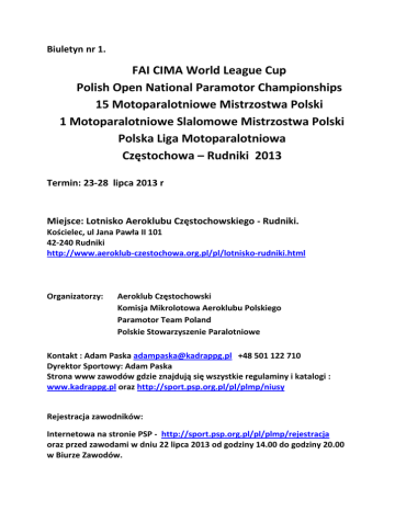 Biuletyn nr 1. FAI CIMA World League Cup Polish Open National Paramotor Championships 15 Motoparalotniowe Mistrzostwa Polski 1 Motoparalotniowe Slalomowe Mistrzostwa Polski Polska Liga Motoparalotniowa Częstochowa – Rudniki 2013 Termin: 23-28 lipca 2013 r Miejsce: Lotnisko Aeroklubu Częstochowskiego - Rudniki. Kościelec, ul Jana Pawła II 101 42-240 Rudniki http://www.aeroklub-czestochowa.org.pl/pl/lotnisko-rudniki.html Organizatorzy: Aeroklub Częstochowski Komisja Mikrolotowa Aeroklubu Polskiego Paramotor Team Poland Polskie Stowarzyszenie Paralotniowe Kontakt : Adam Paska [email protected] +48 501 122 710 Dyrektor Sportowy: Adam Paska Strona www zawodów gdzie znajdują się wszystkie regulaminy i katalogi : www.kadrappg.pl oraz http://sport.psp.org.pl/pl/plmp/niusy Rejestracja zawodników: Internetowa na stronie PSP - http://sport.psp.org.pl/pl/plmp/rejestracja oraz przed zawodami w dniu 22 lipca 2013 od godziny 14.00 do godziny 20.00 w Biurze Zawodów. Przebieg konkurencji : Konkurencje dla 15 MPMP i 1 MPSMP, mogą być rozgrywane naprzemiennie w dniach od 23 do 28 lipca w zależności od warunków pogodowych. Pierwszy briefing : godzinie 20.00 - 22 lipca (poniedziałek) sala odpraw Aeroklubu Częstochowskiego. Warunki uczestnictwa: Posiadanie ważnego świadectwa kwalifikacji upoważniającego do wykonywania lotów na posiadanym PPG / PPGG lub dokumentu zagranicznego upoważniającego do wykonywania takich lotów Licencja Sportowa FAI* Ważne ubezpieczenie OC w związku z wykonywanymi lotami Podpisanie karty rejestracyjnej zawodnika w dniu rejestracji Posiadania sprawnego technicznie skrzydła i silnika * zawodnicy nie posiadający licencji sportowej FAI (NAC), będą dopuszczeni do udziału w zawodach, ale nie będą klasyfikowani w WLC 15 MPMP oraz w 1 MPSMP. Uzyskane przez nich punkty w klasyfikacji będą uwzględnione w rankingu PLMP. Wpisowe: 50 euro (200 zł) należy wpłacać na konto : Aeroklubu Polski BANK BGŻ 19 2030 0045 1110 0000 0253 5440 W tytule proszę wpisać: MP PPG. Wpisowe należy wpłacić do dnia 15 lipca 2013roku. W dniu 22 lipca można będzie dokonać opłaty wpisowego podczas rejestracji z tym że opłata to będzie wynosiła 70 euro (300 zł). Zakwaterowanie i wyżywienie: Zakwaterowanie i wyżywienie zawodników we własnym zakresie. Na lotnisku znajduje się pole namiotowe, oraz hotel. W okolicy jest spora ilość hoteli, pensjonatów i agroturystyki. Więcej danych tutaj: http://www.aeroklub-czestochowa.org.pl/pl/baza-noclegowa/na-terenieacz.html na lotnisku http://www.aeroklub-czestochowa.org.pl/pl/baza-noclegowa/poza-terenemacz.html poza lotniskiem. Na lotnisku znajduje się restauracja czynna od wczesnych godzin porannych, serwująca pełne wyżywienie. Rejestratory GPS: Zalecane jest posiadanie rejestratorów typu AMOD lub MLR, w wypadku innych urządzeń prosimy o zabranie kabli do ich podłączenia do komputera oraz sterowników. Przypominamy że zapis rejestratora (GPS-a) musi odbywać się w funkcji czasu, a nie w funkcji drogi. Klasyfikacja: Zawody zostaną rozegrane w 4 klasach : PF1, PL1, PF2 i PL2. W wypadku uczestnictwa w klasie mniej niż 3 załóg ( klasy PF2 i PL2 ) obie te klasy mogą być klasyfikowane łącznie. Podczas zawodów zostaną wyłonieni zwycięscy: WLC Polish Open National Paramotor Championships – w ramach 15 MPMP Mistrzowie Polski w ramach 15 MPMP Zwycięzcy w ramach 1 MPSMP w klasie OPEN Mistrzowie Polski w 1 MPSMP Punktacja do rankingu PLMP 2013 będzie składała się z punktów zdobytych w ramach 15 MPMP dla rankingów nawigacyjnego, ekonomicznego, sprawnościowego oraz open dla wszystkich klas, punkty zdobyte w ramach 1 MPSMP będą liczone tylko w klasyfikacji sprawnościowej dla wszystkich klas. Punkty zdobyte w ramach Mistrzostw Polski to + 50% w stosunku do innych edycji Ligi. Uwaga !!! Wyniki uzyskane przez pilotów nie posiadających Licencji Sportowej FAI, będą umieszczone tylko w klasyfikacja Open, i nie będą przekazane do rankingu WLC prowadzonym przez CIMA FAI. Dyrektor Sportowy Adam Paska